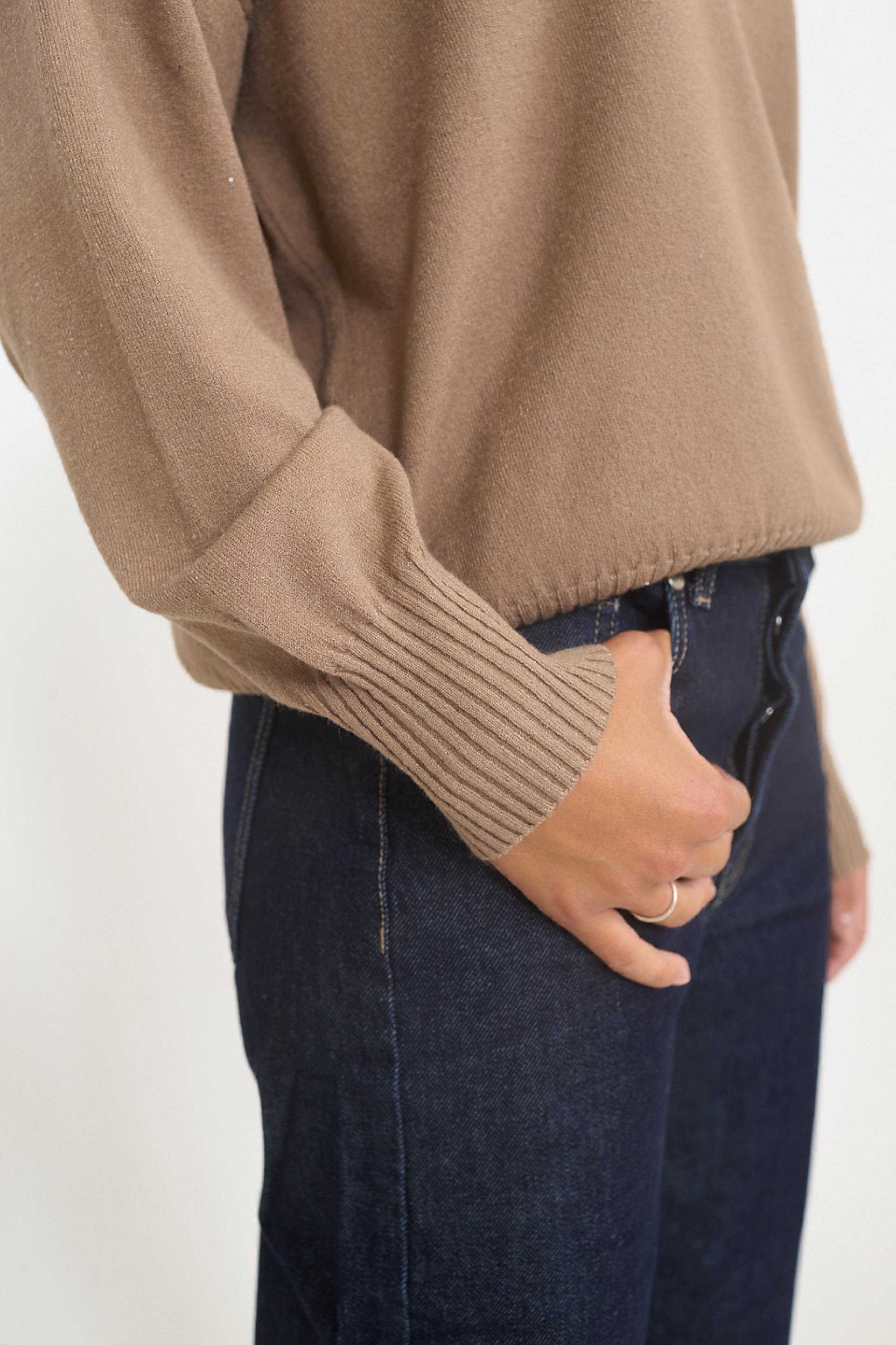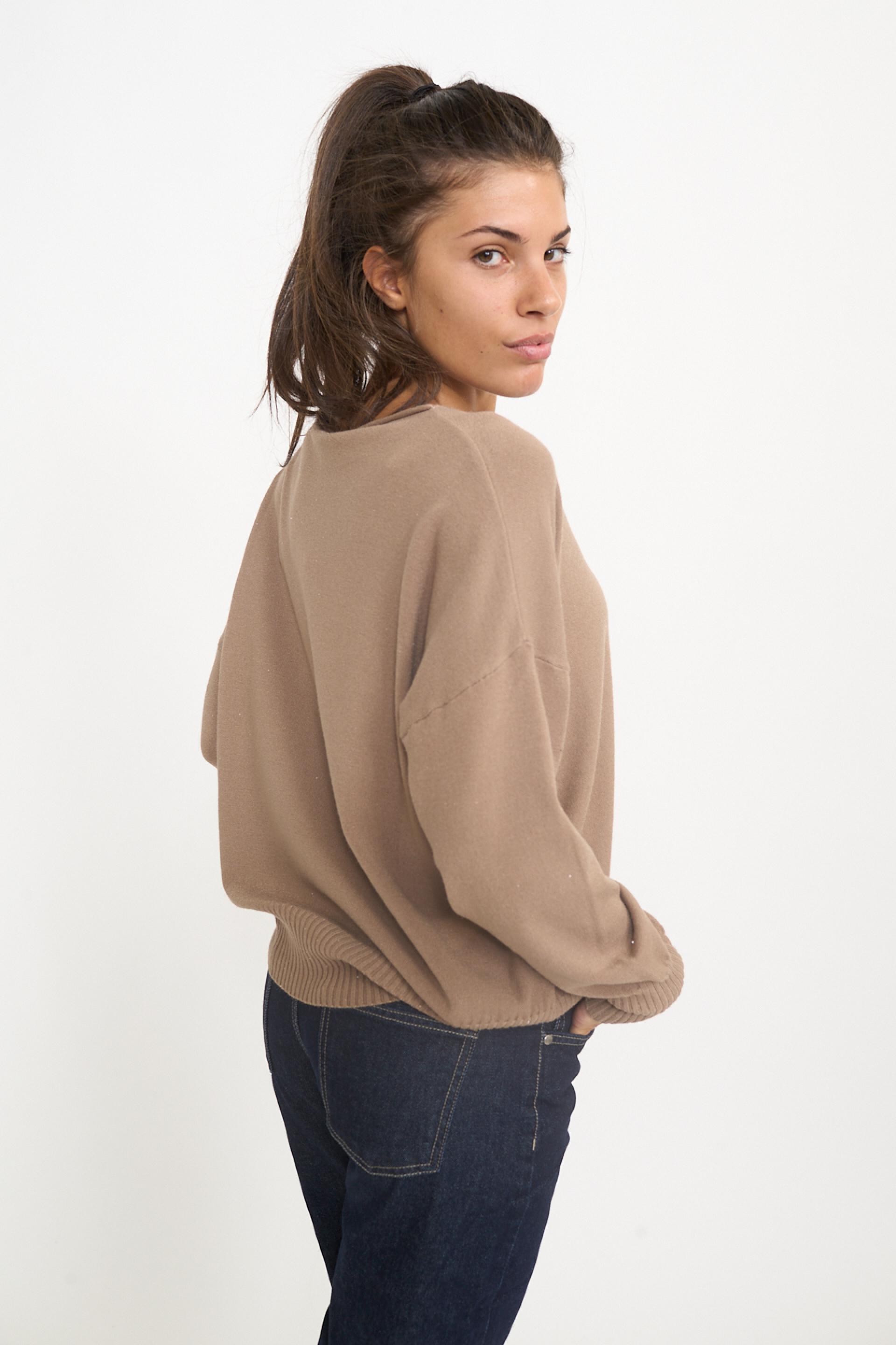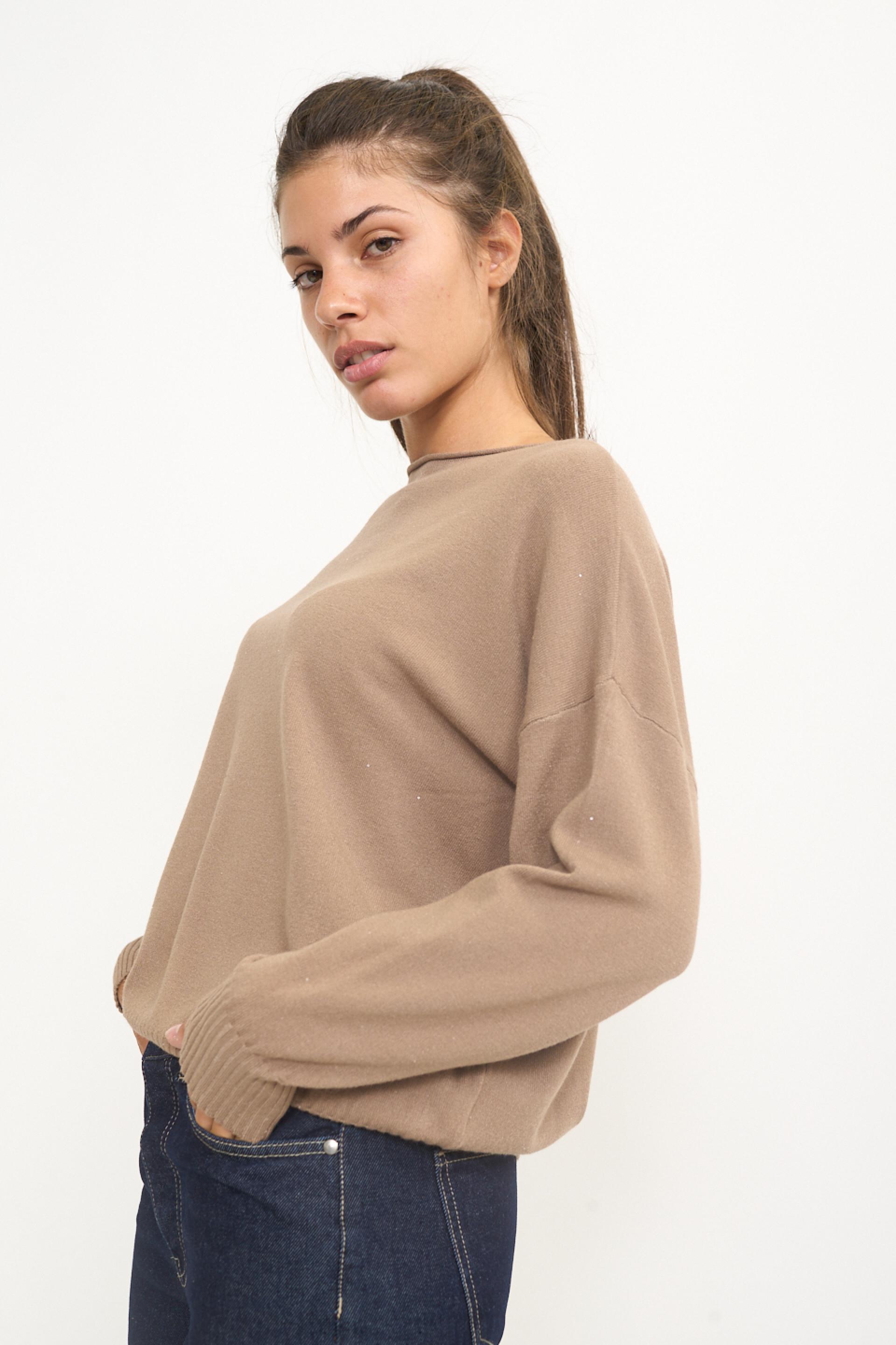 Maglia con scollo barca frullino in misto viscosa. Filato con dettaglio di paillettes e lavorazione a costine su polsini e orlo. | ||