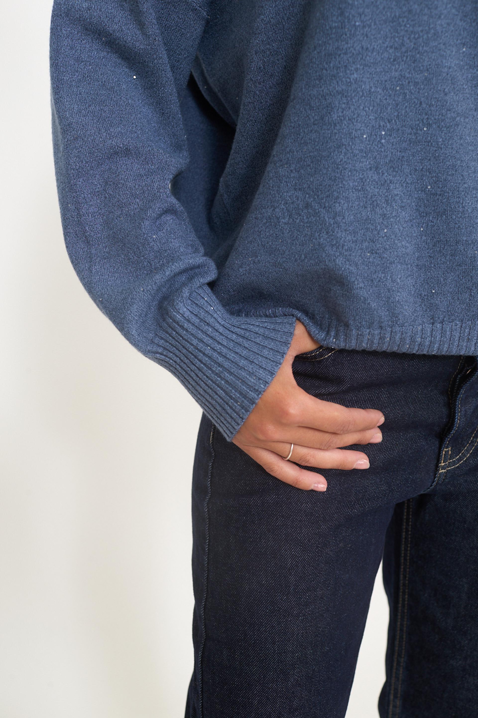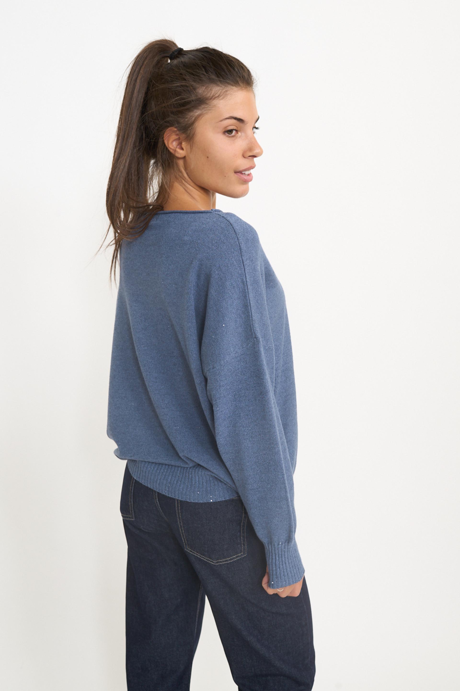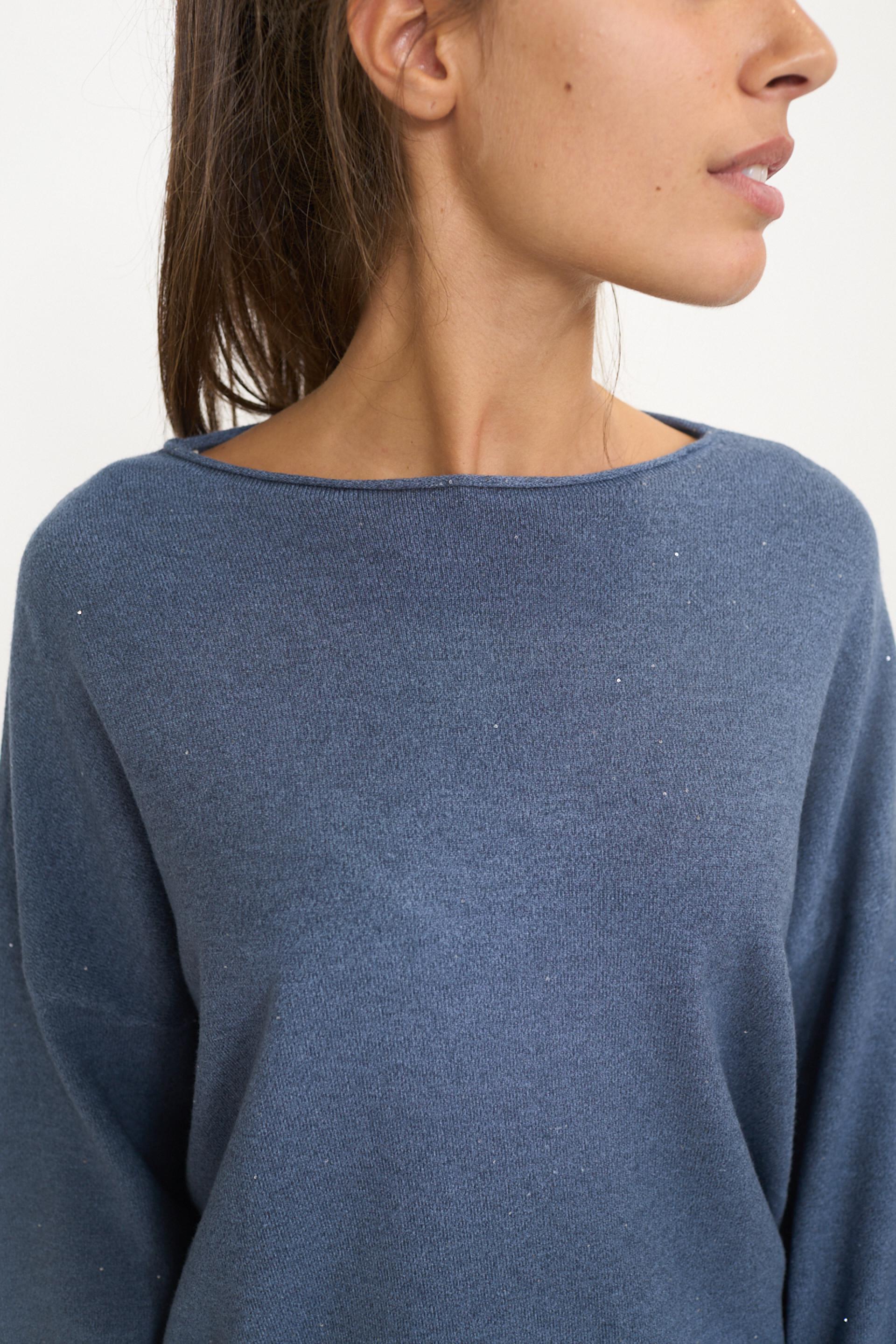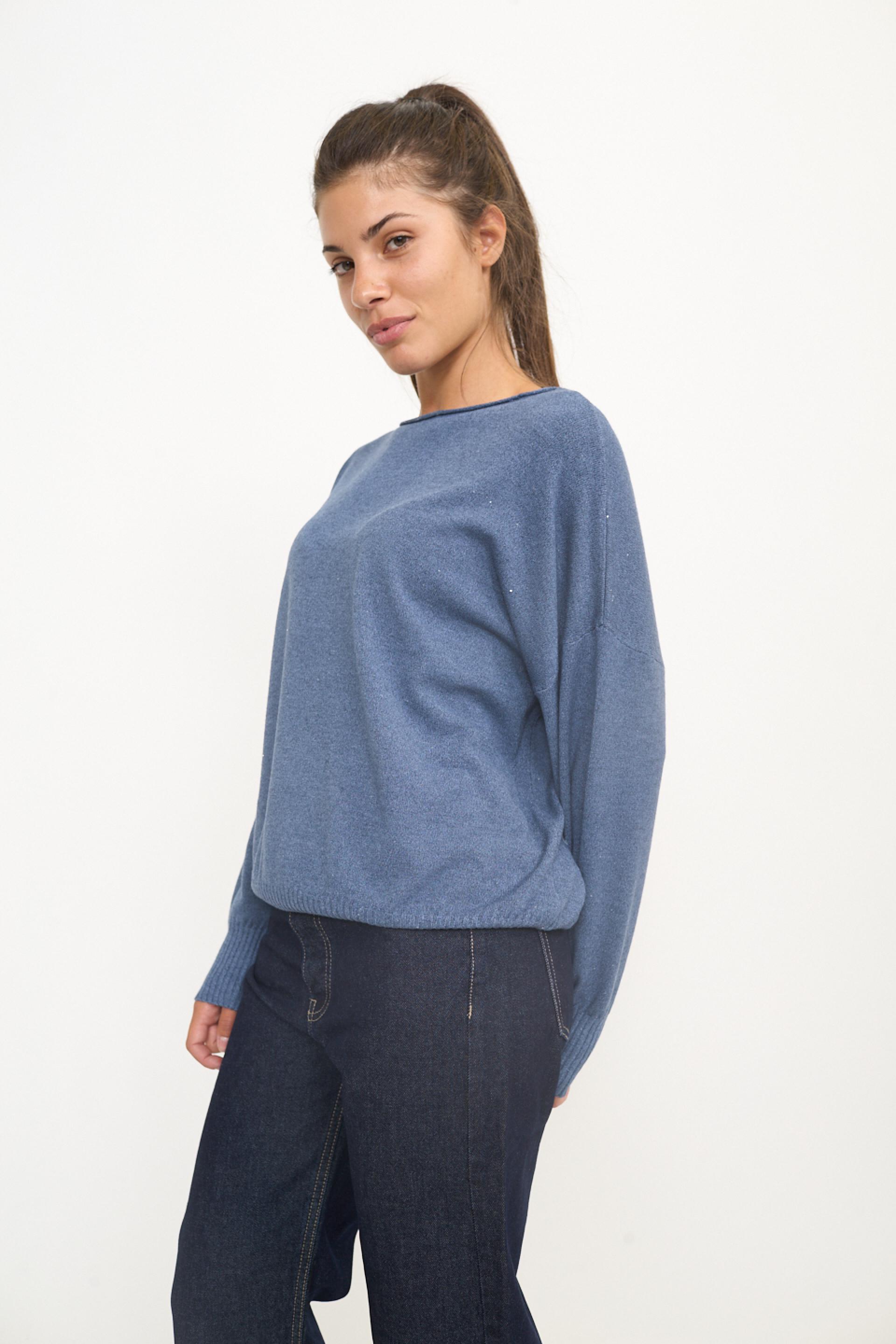 Maglia con scollo barca frullino in misto viscosa. Filato con dettaglio di paillettes e lavorazione a costine su polsini e orlo. | ||