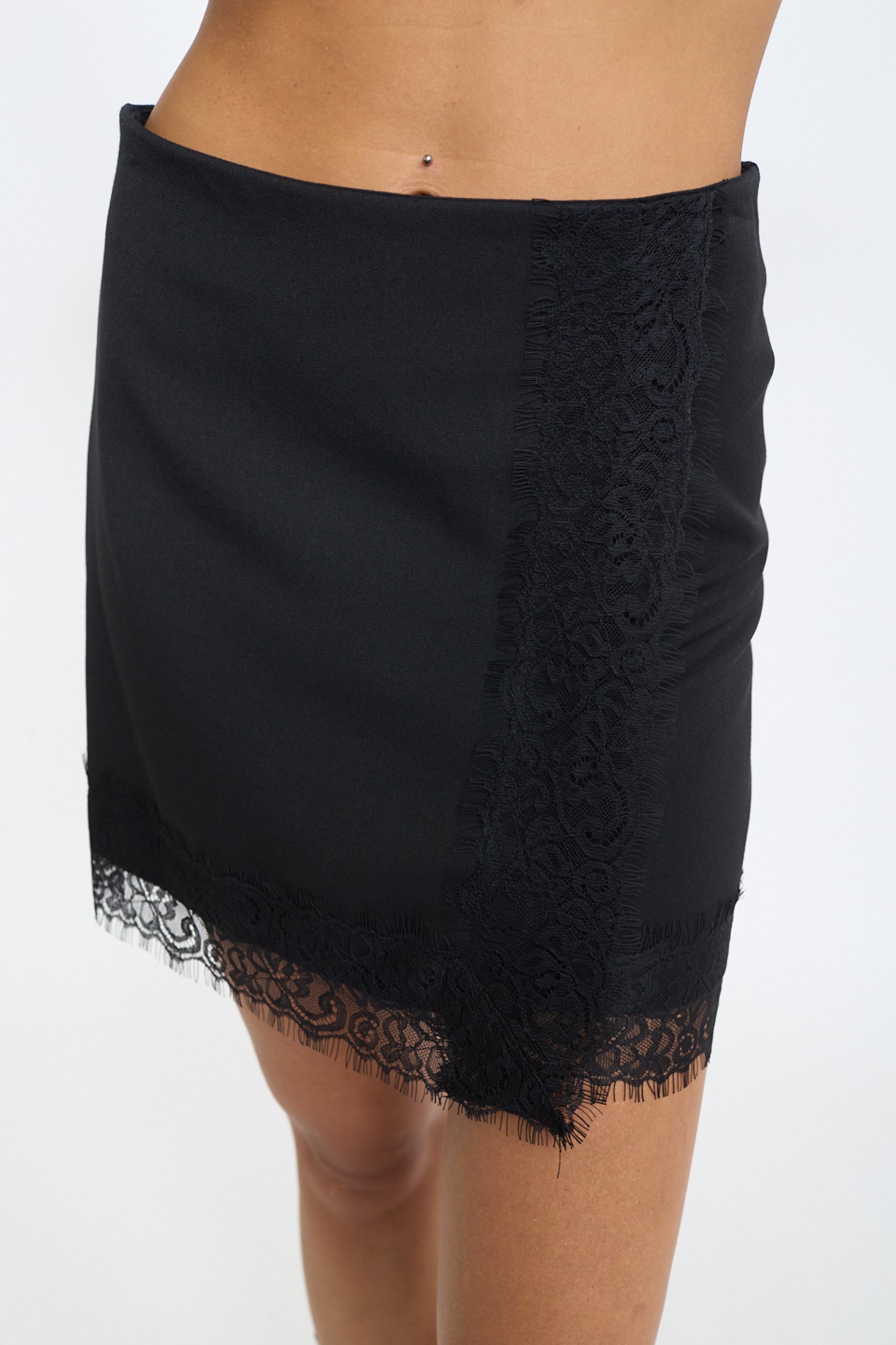| Minigonna a portafoglio con dettagli di passamanerie in pizzo. Chiusura posteriore tramite cerniera nascosta nella cucitura. | ||