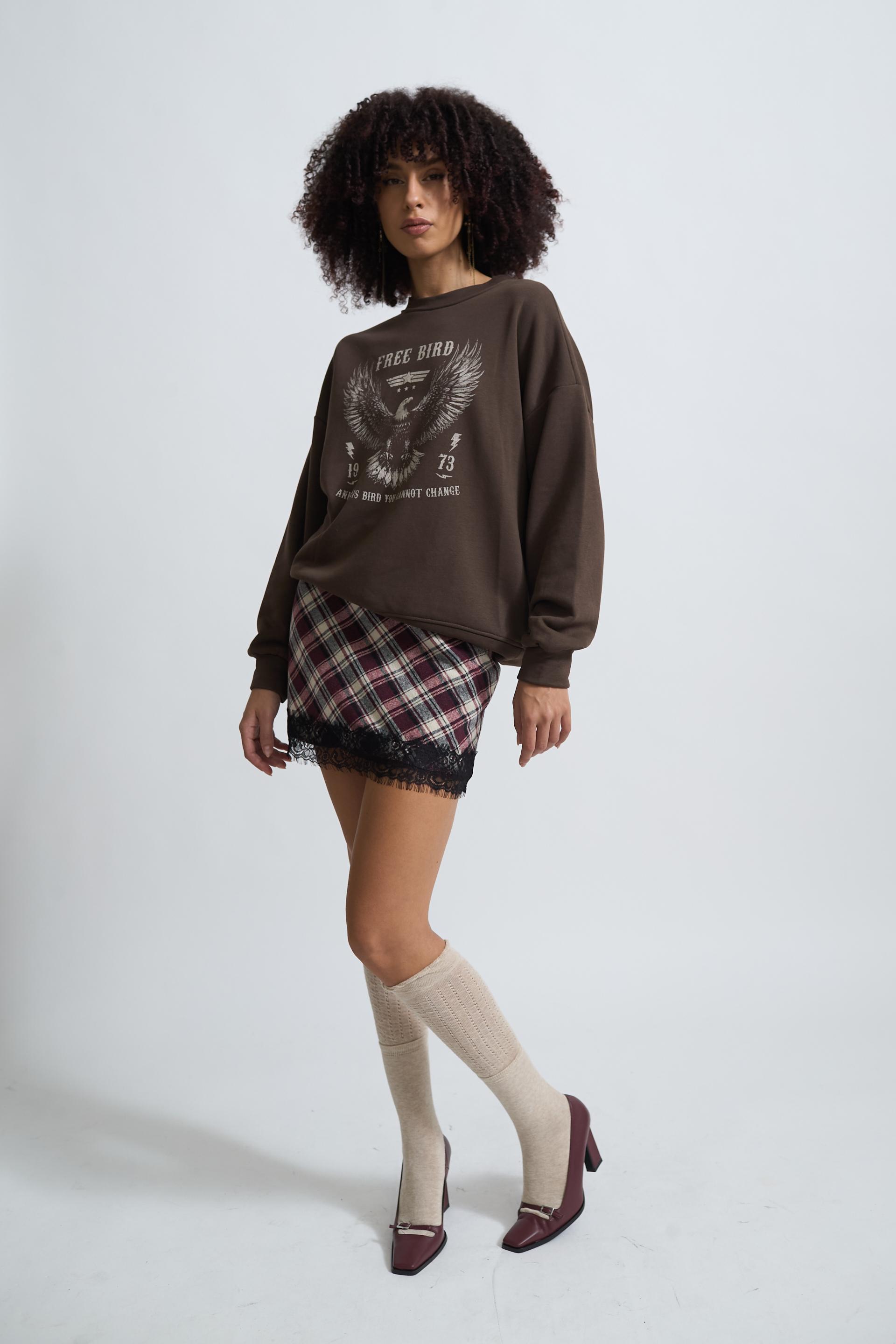 Minigonna in cotone fantasia check con dettaglio di orlo in pizzo. Fodera interna. Chiusura laterale con zip nascosta nella cucitura. | ||