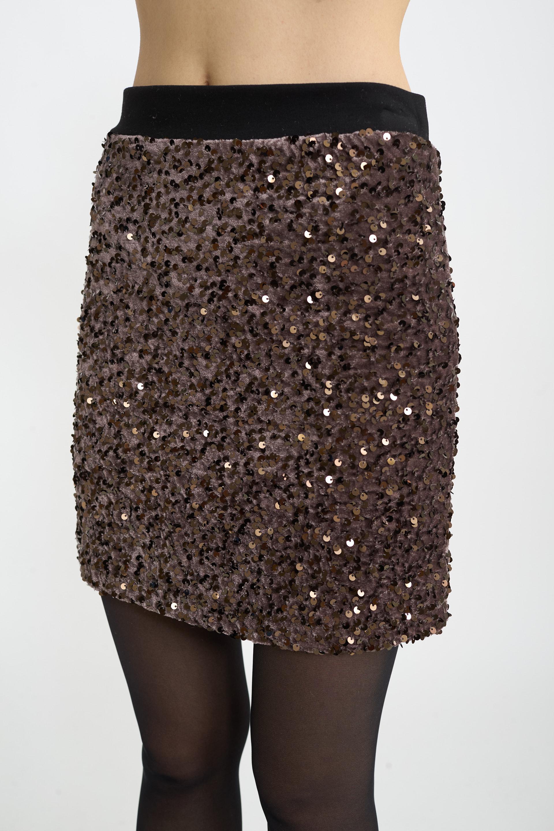 | Minigonna in paillettes con elastico in vita e fodera interna in viscosa. | ||