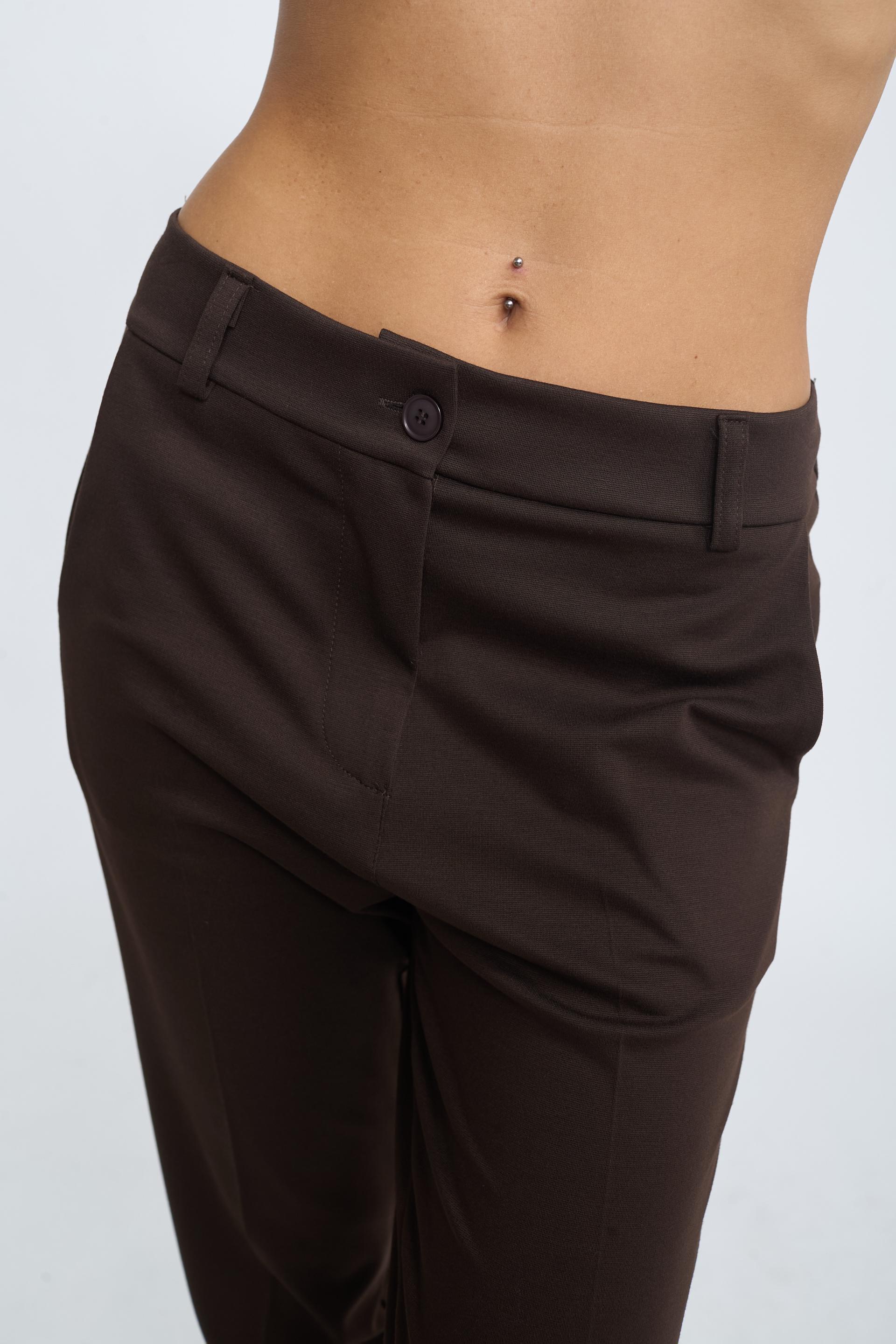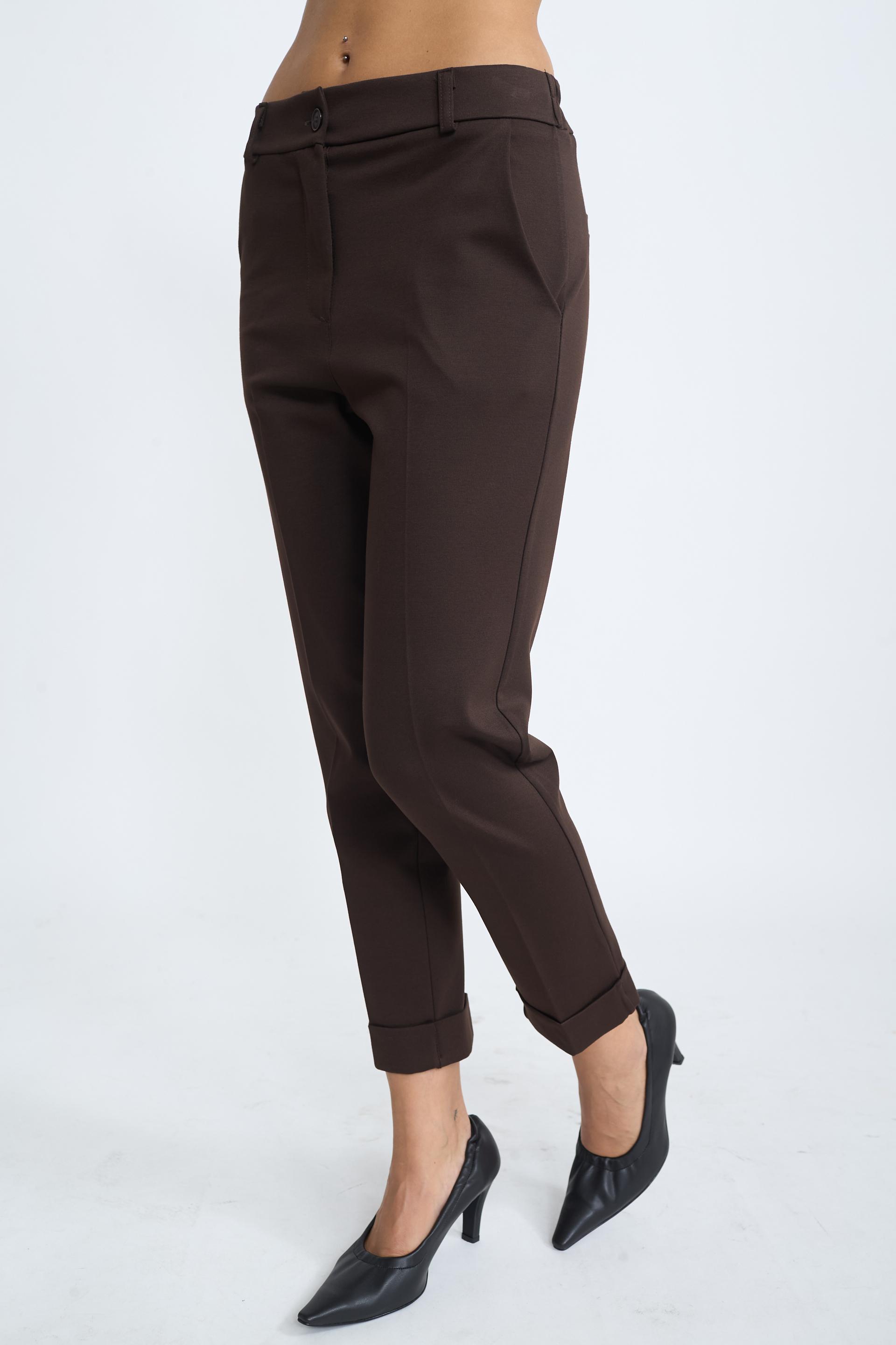 Pantalone in punto Milano con elastico in vita e risvolto. Tasche laterali e finte tasche posteriori a filetto. Passanti in vita e chiusura tramite cerniera e bottone tono su tono. | ||