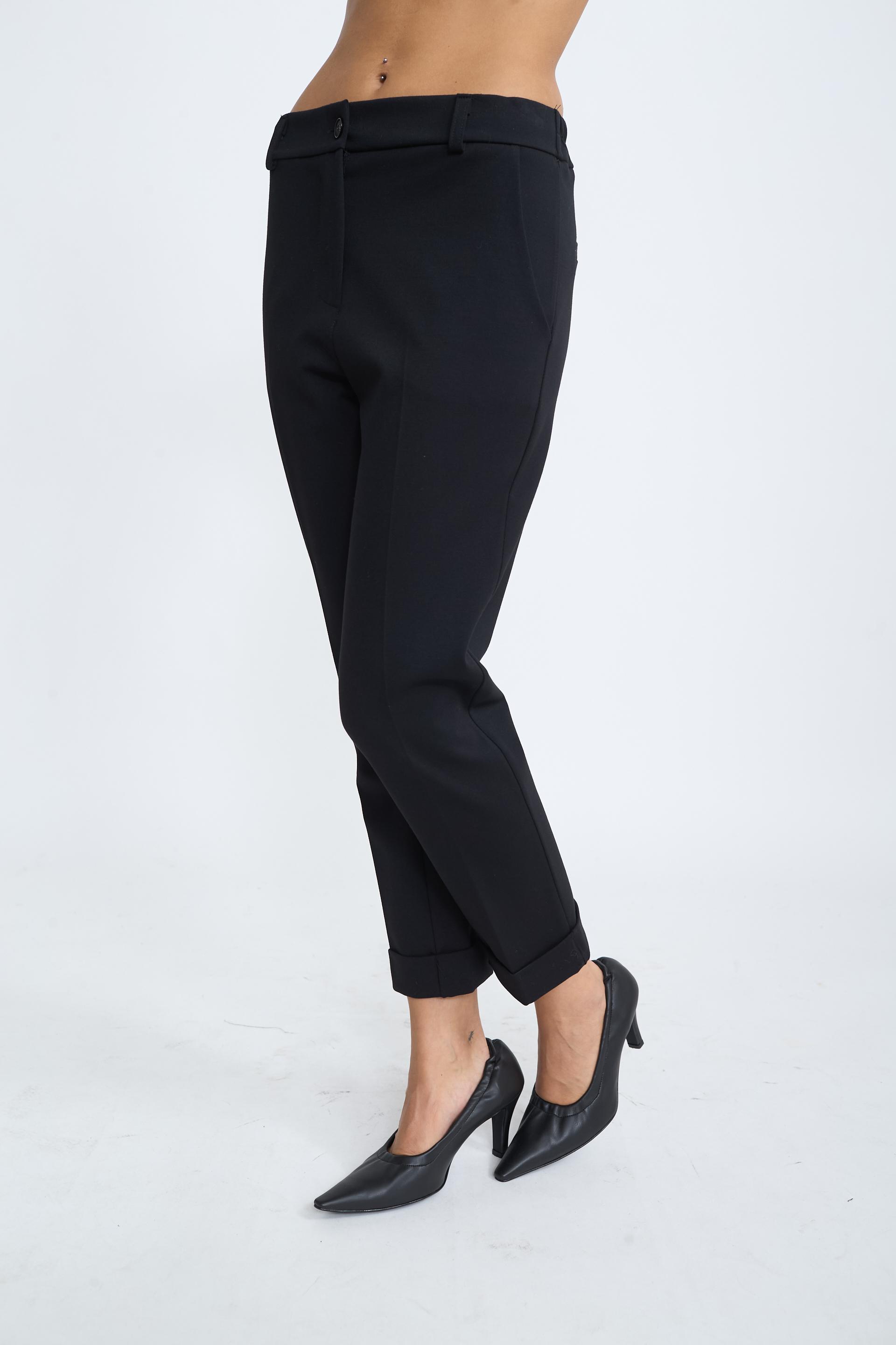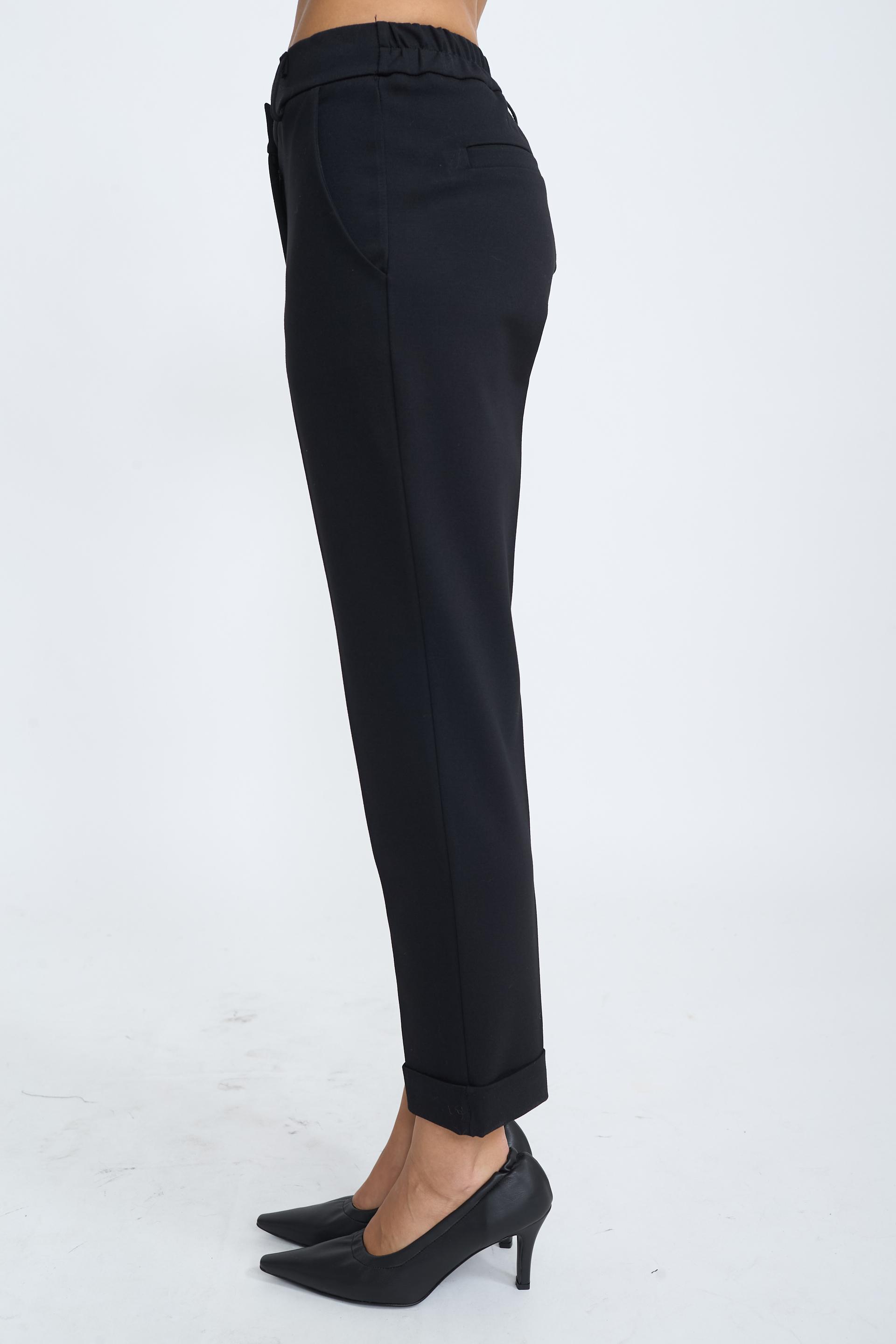 Pantalone in punto Milano con elastico in vita e risvolto. Tasche laterali e finte tasche posteriori a filetto. Passanti in vita e chiusura tramite cerniera e bottone tono su tono. | ||