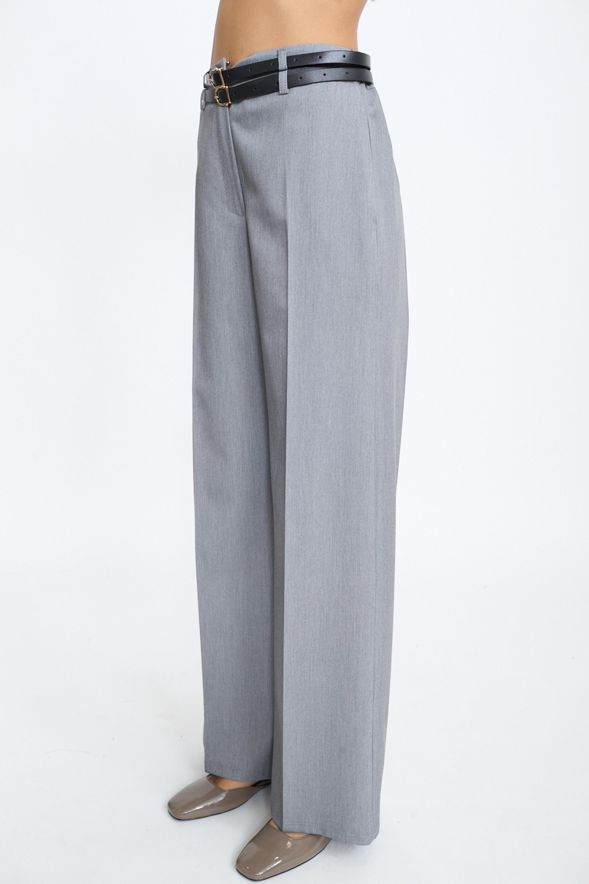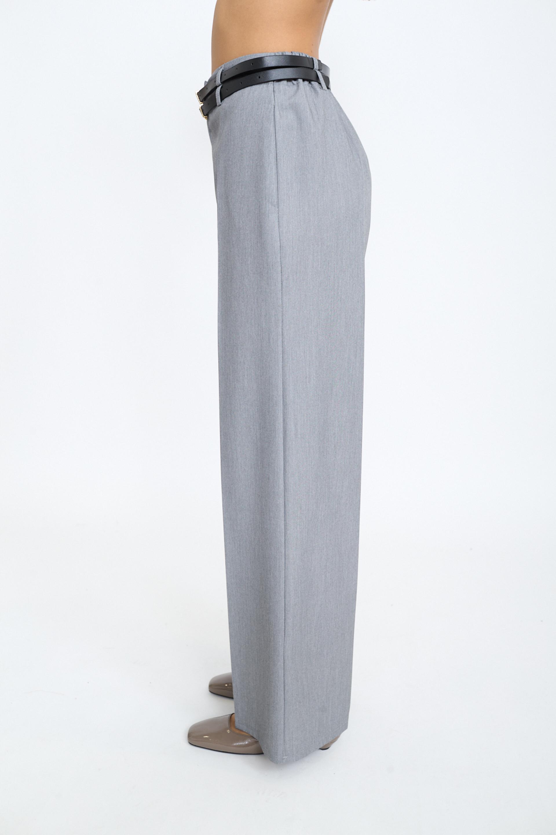 | Pantalone palazzo con elastico dietro la vita e dettaglio di doppia cintura compresa. Piega lungo la gamba e tasche laterali. Chiusura tramite cerniera e bottone tono su tono. | ||