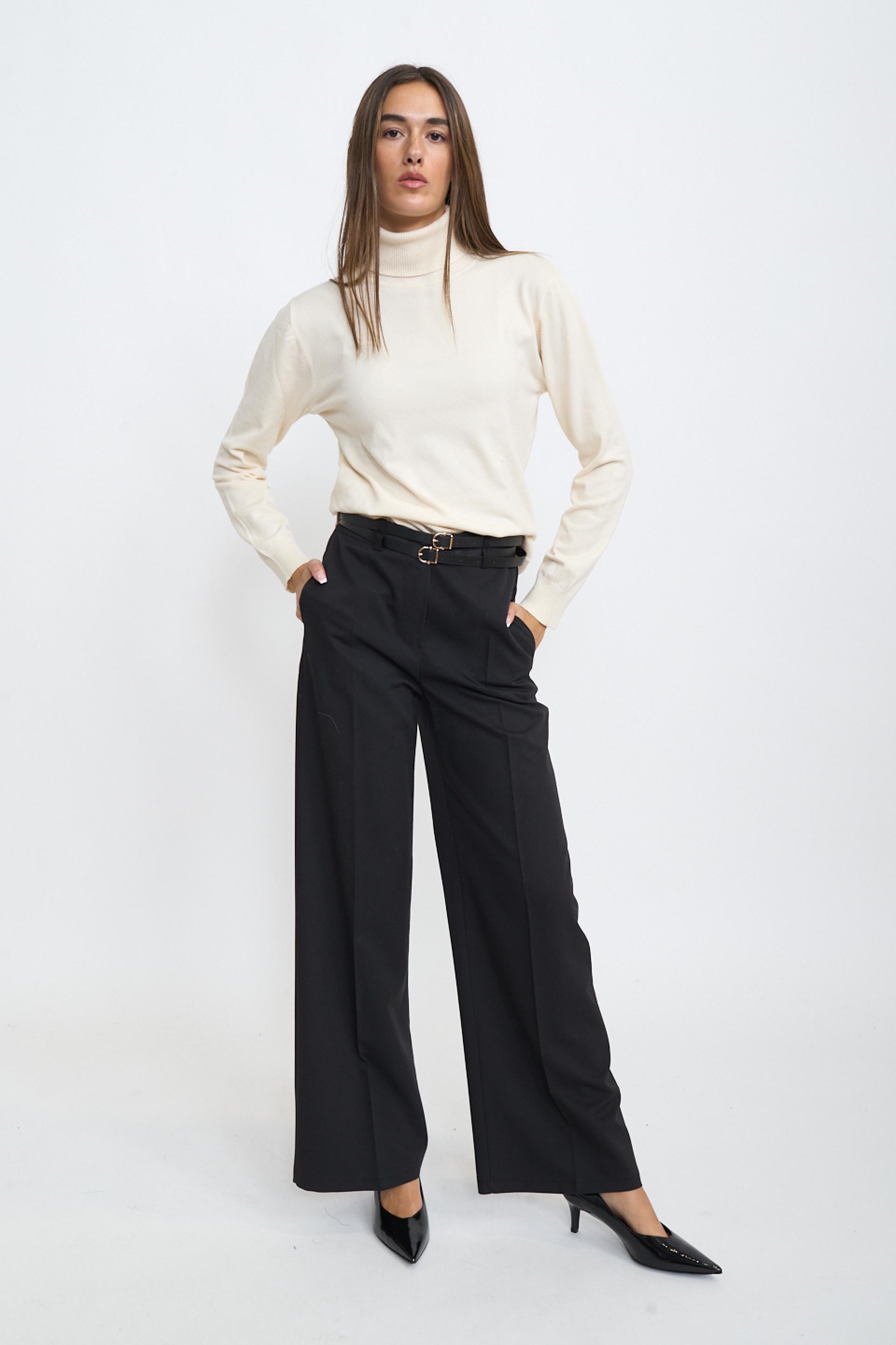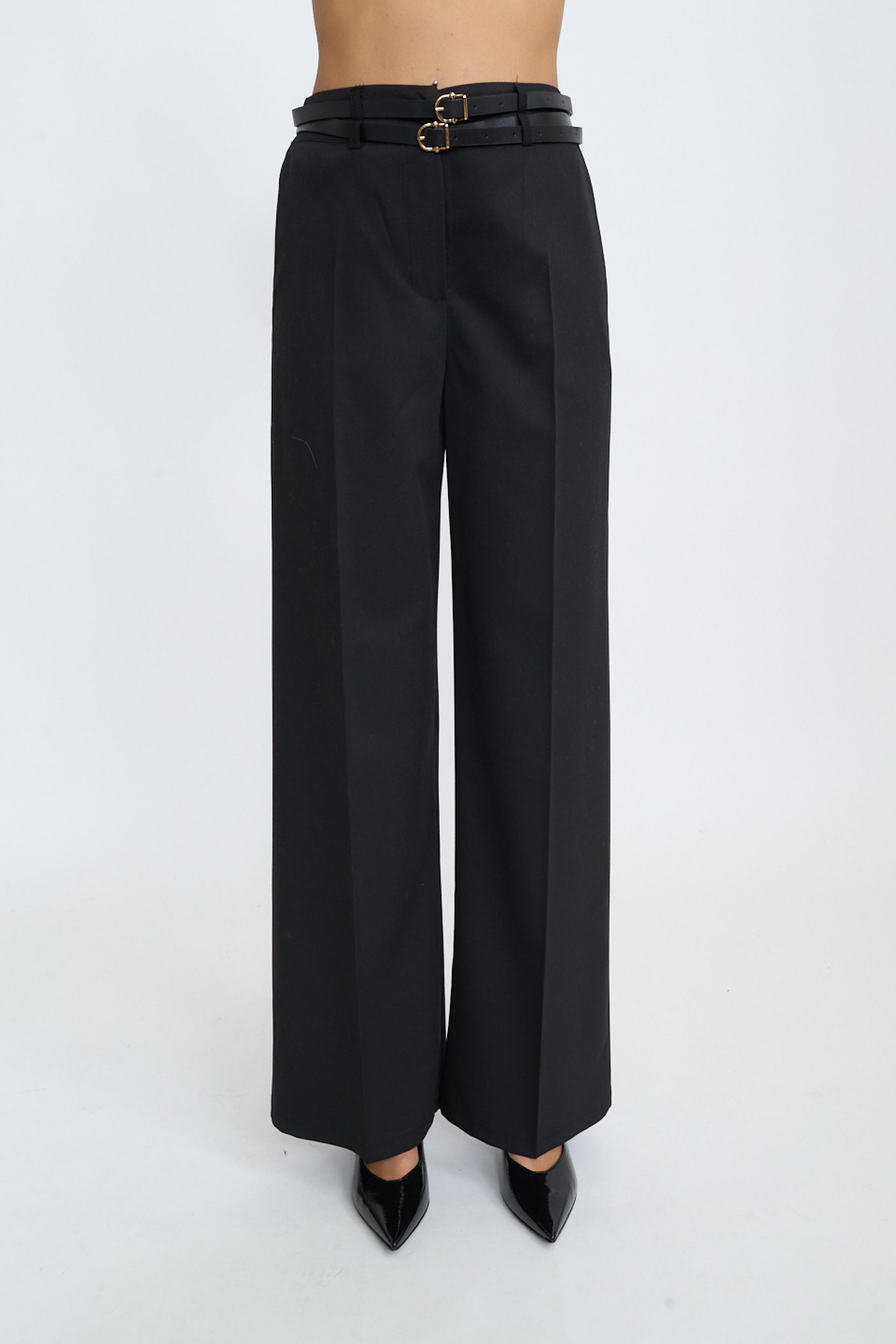 | Pantalone palazzo con elastico dietro la vita e dettaglio di doppia cintura compresa. Piega lungo la gamba e tasche laterali. Chiusura tramite cerniera e bottone tono su tono. | ||
