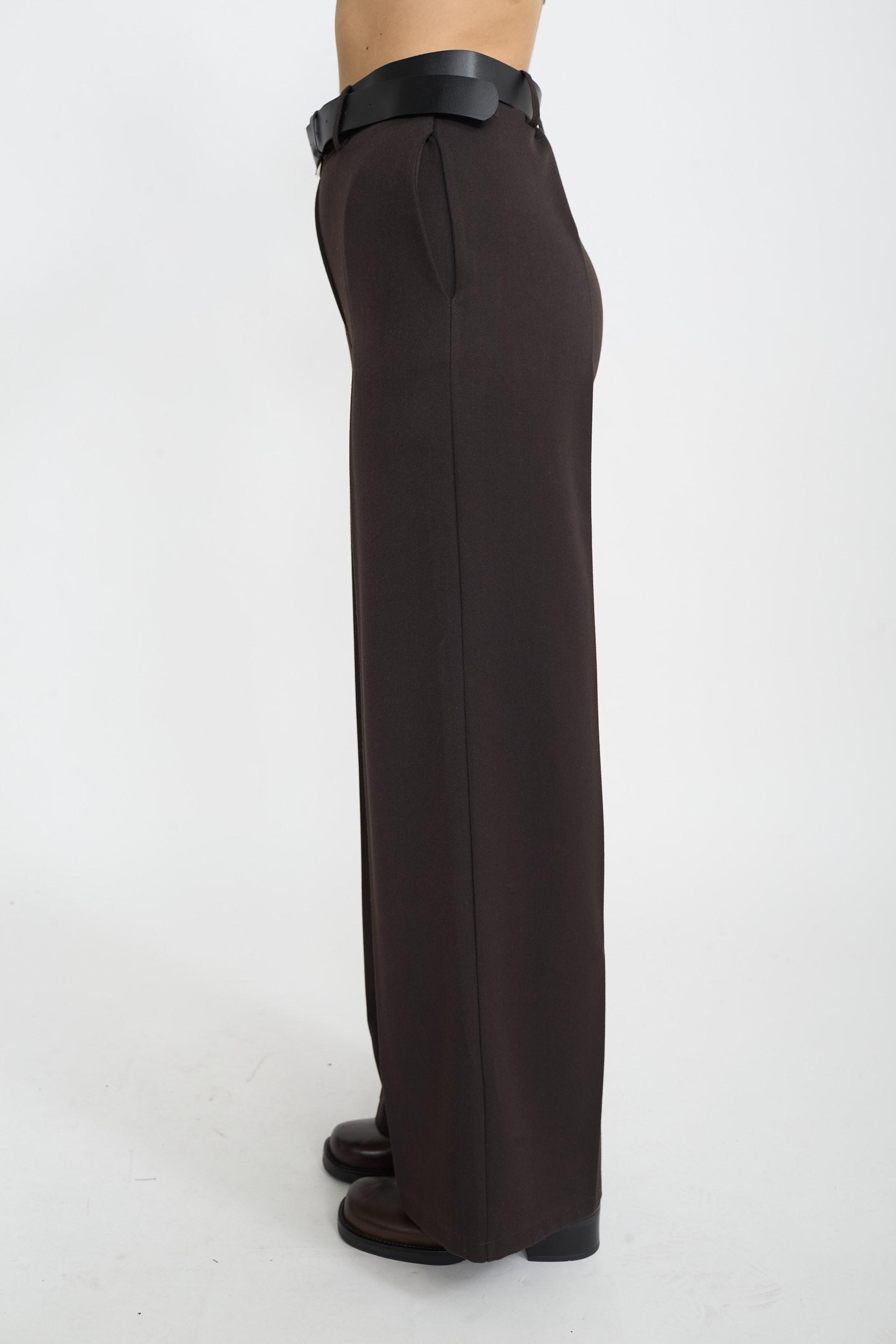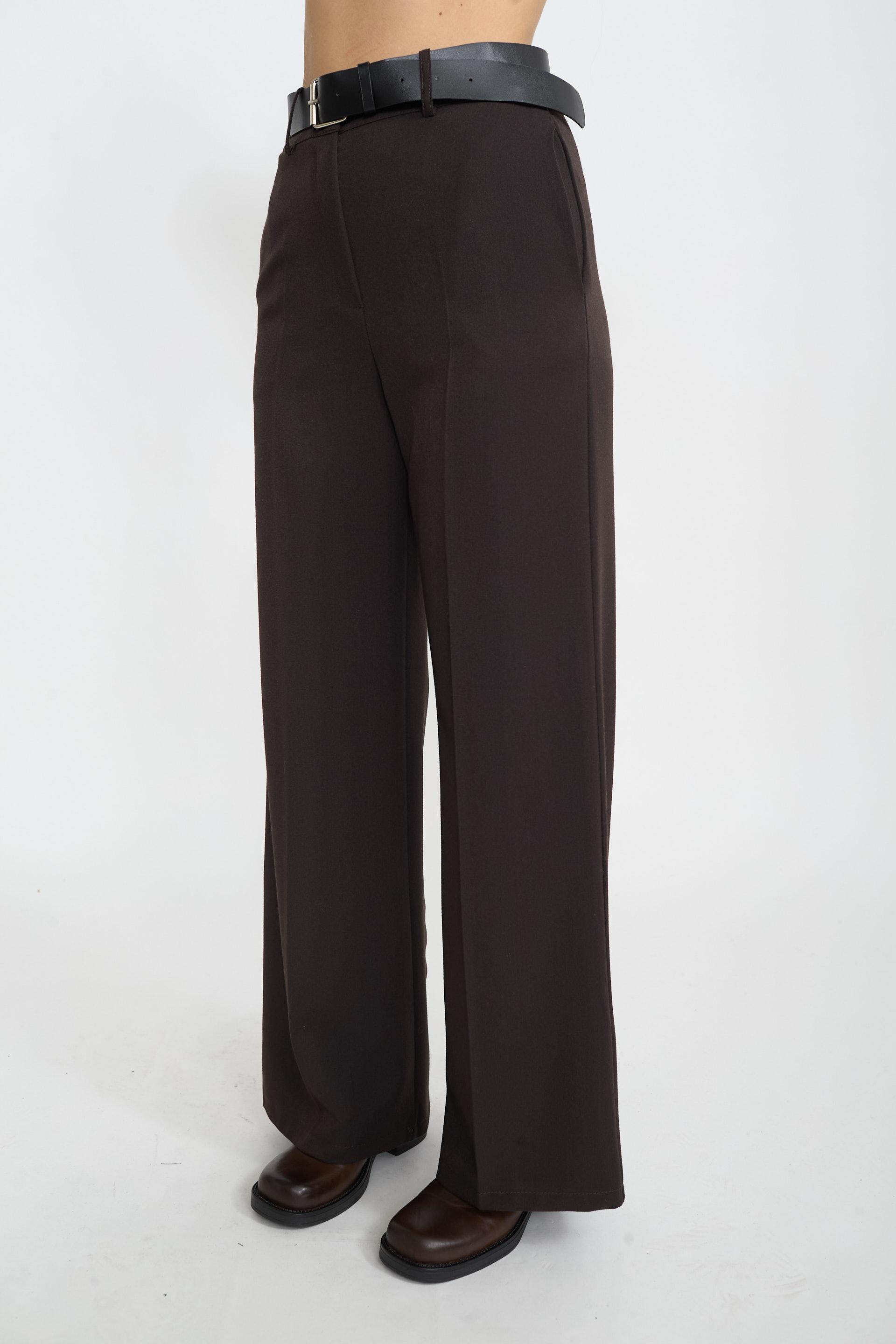 | Pantalone palazzo con elastico dietro la vita in tessuto gessato. Tasche laterali e passanti in vita. Chiusura tramite cerniera e bottone. | ||