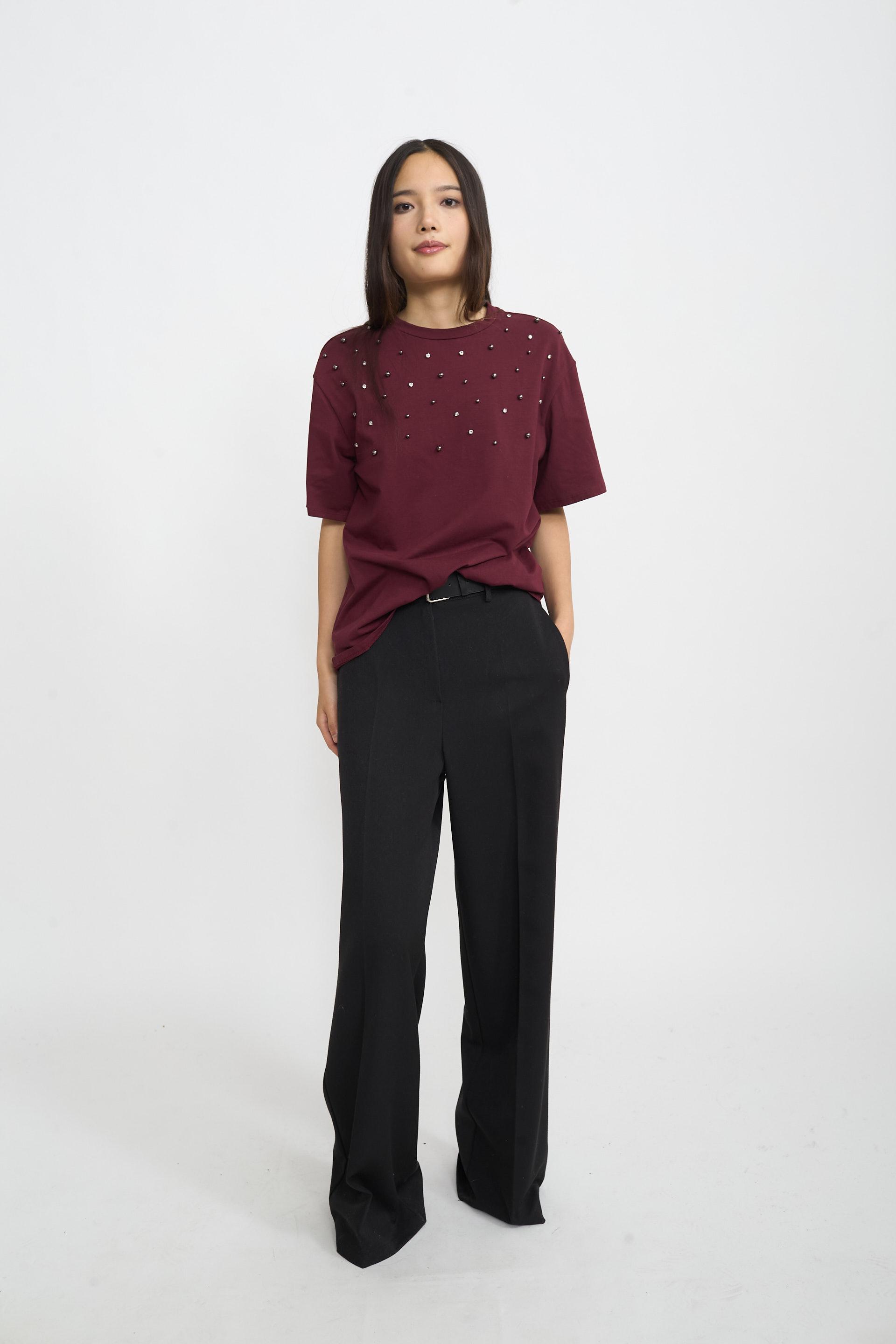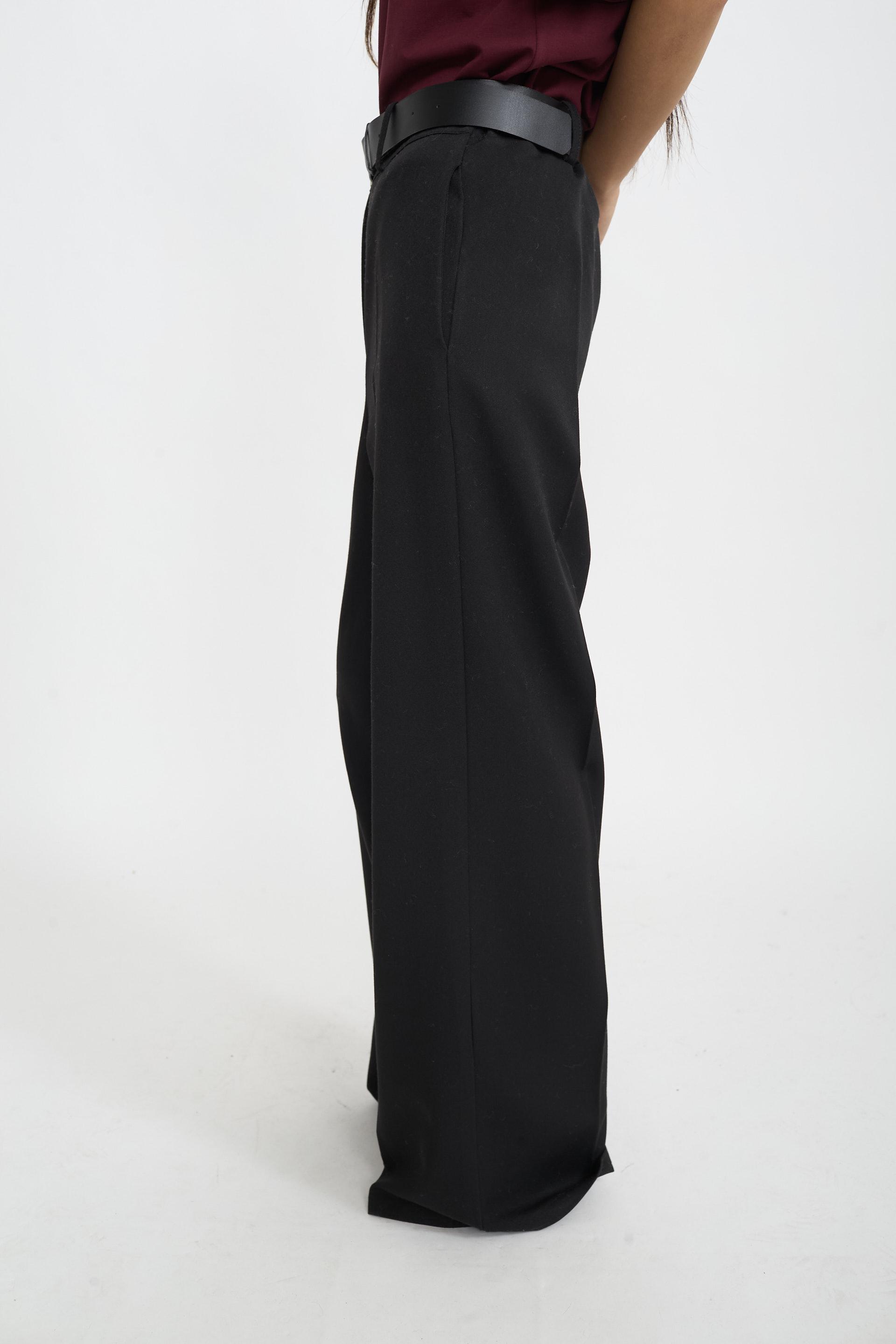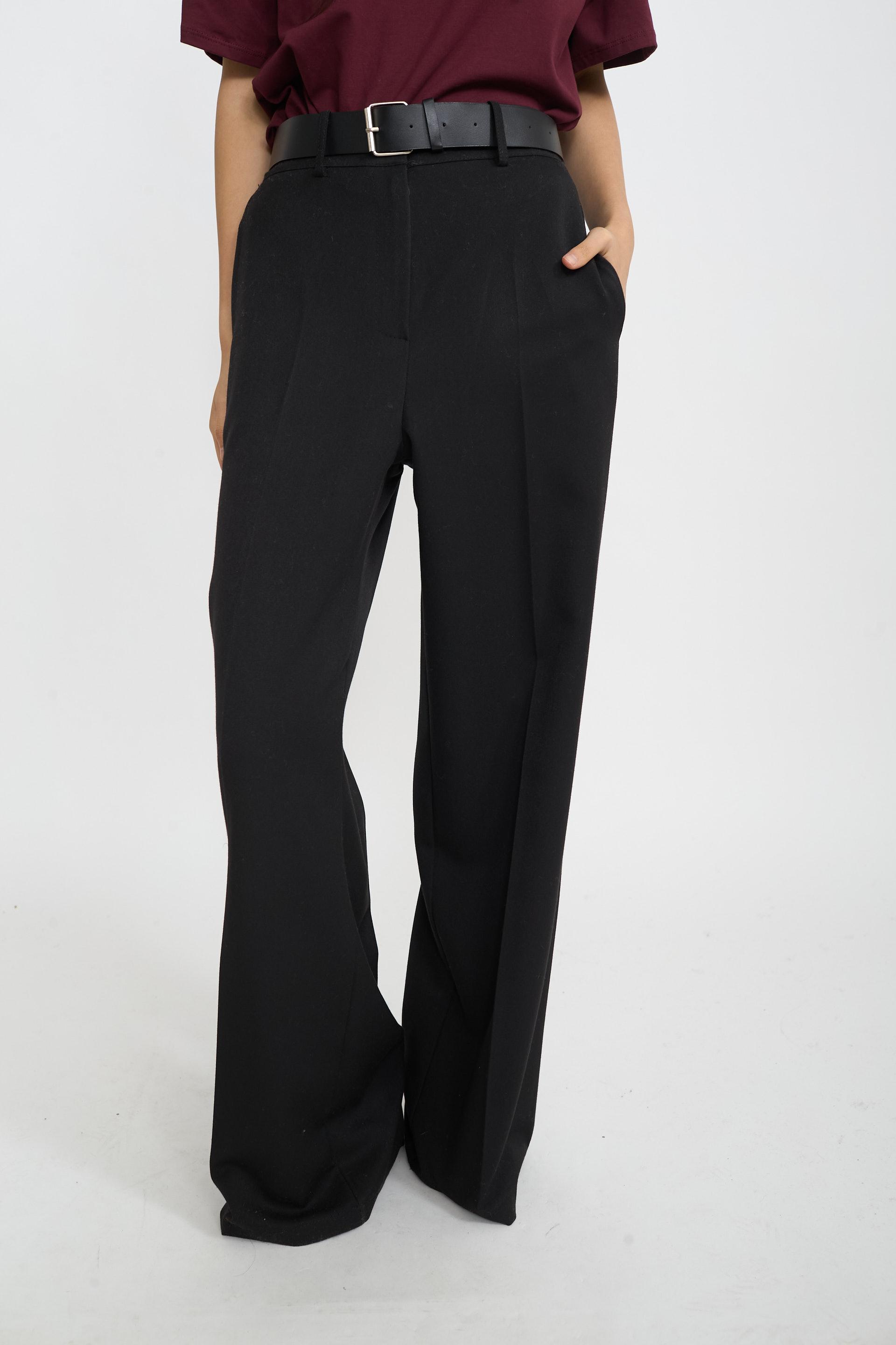 | Pantalone palazzo con elastico dietro la vita in tessuto gessato. Tasche laterali e passanti in vita. Chiusura tramite cerniera e bottone. | ||