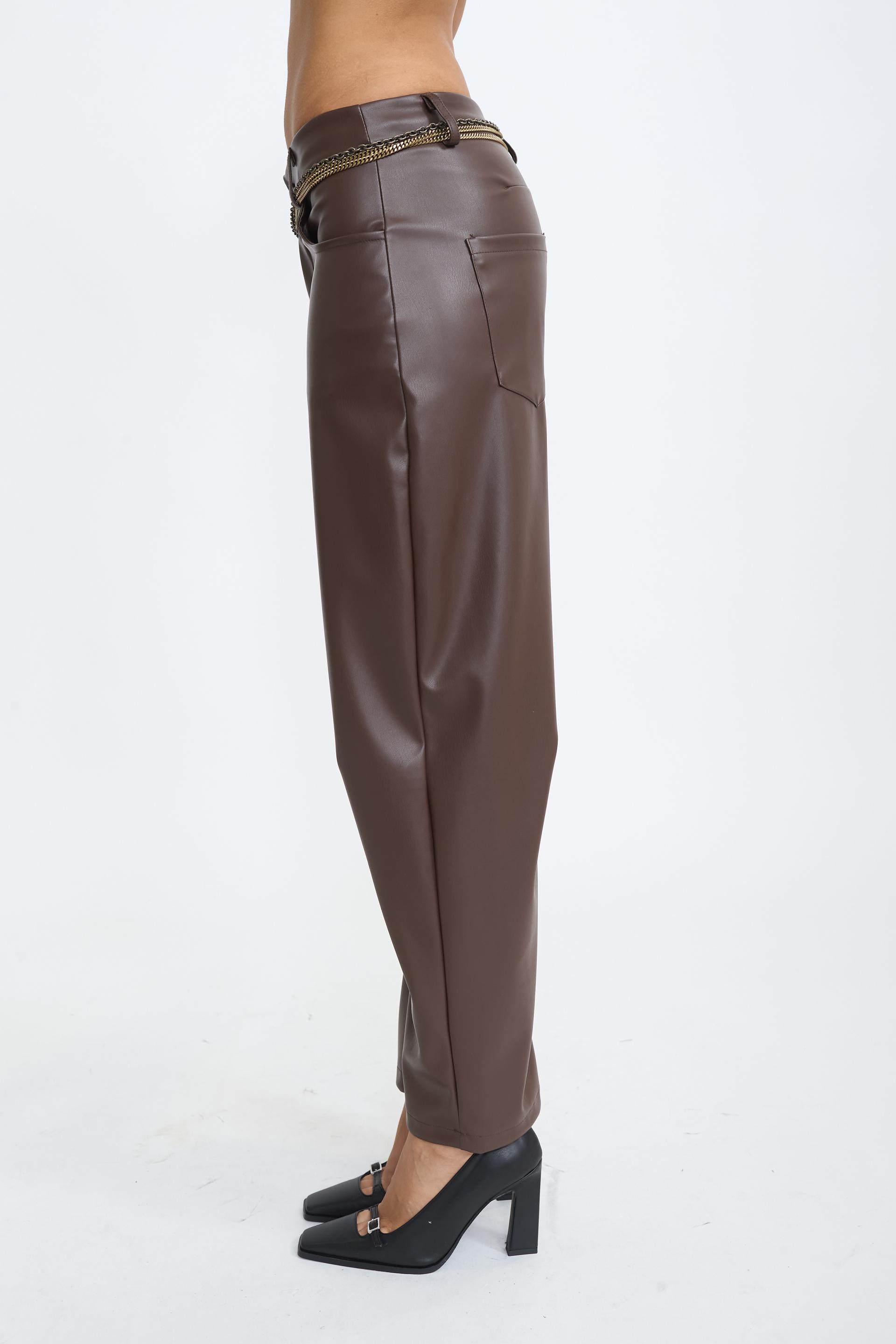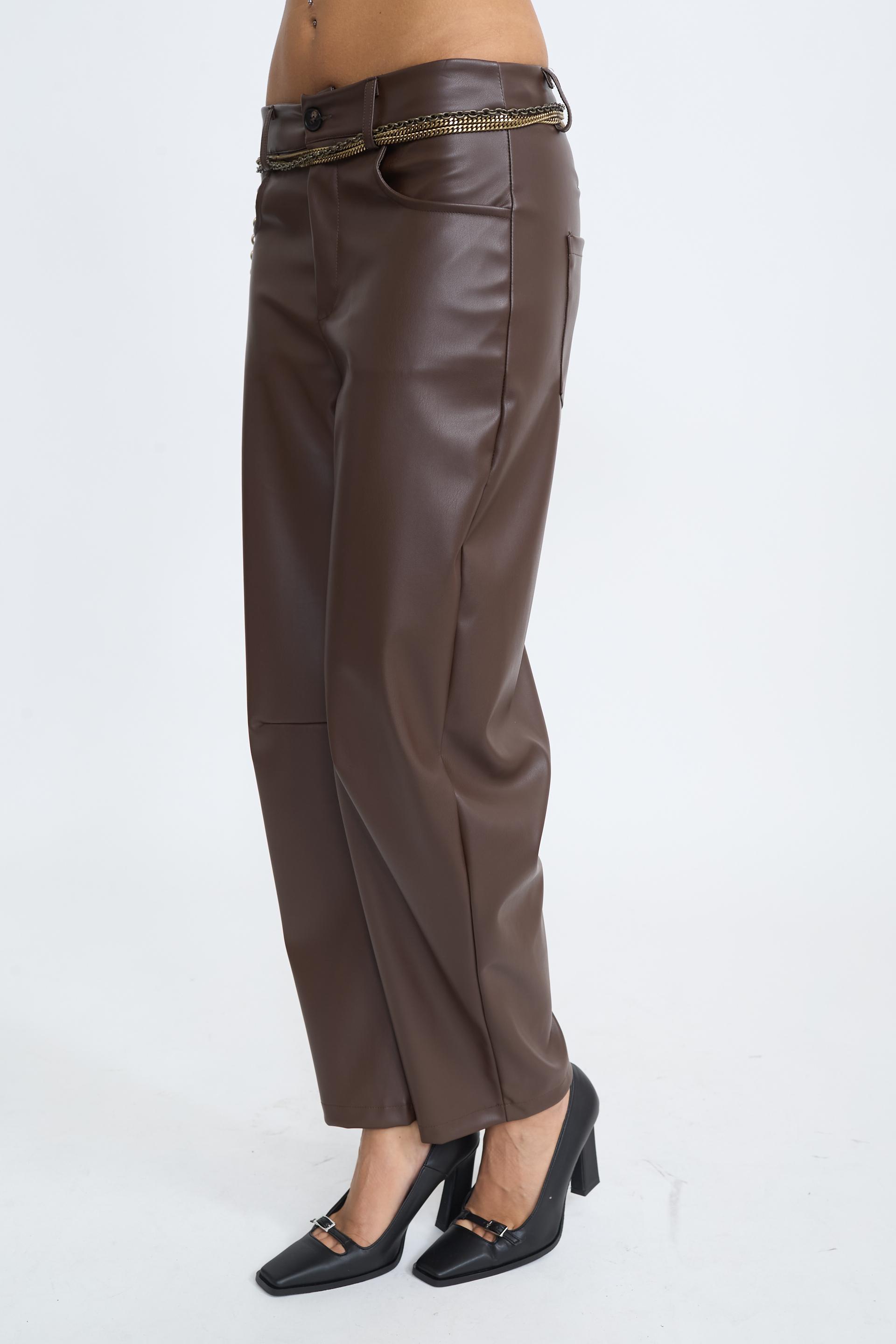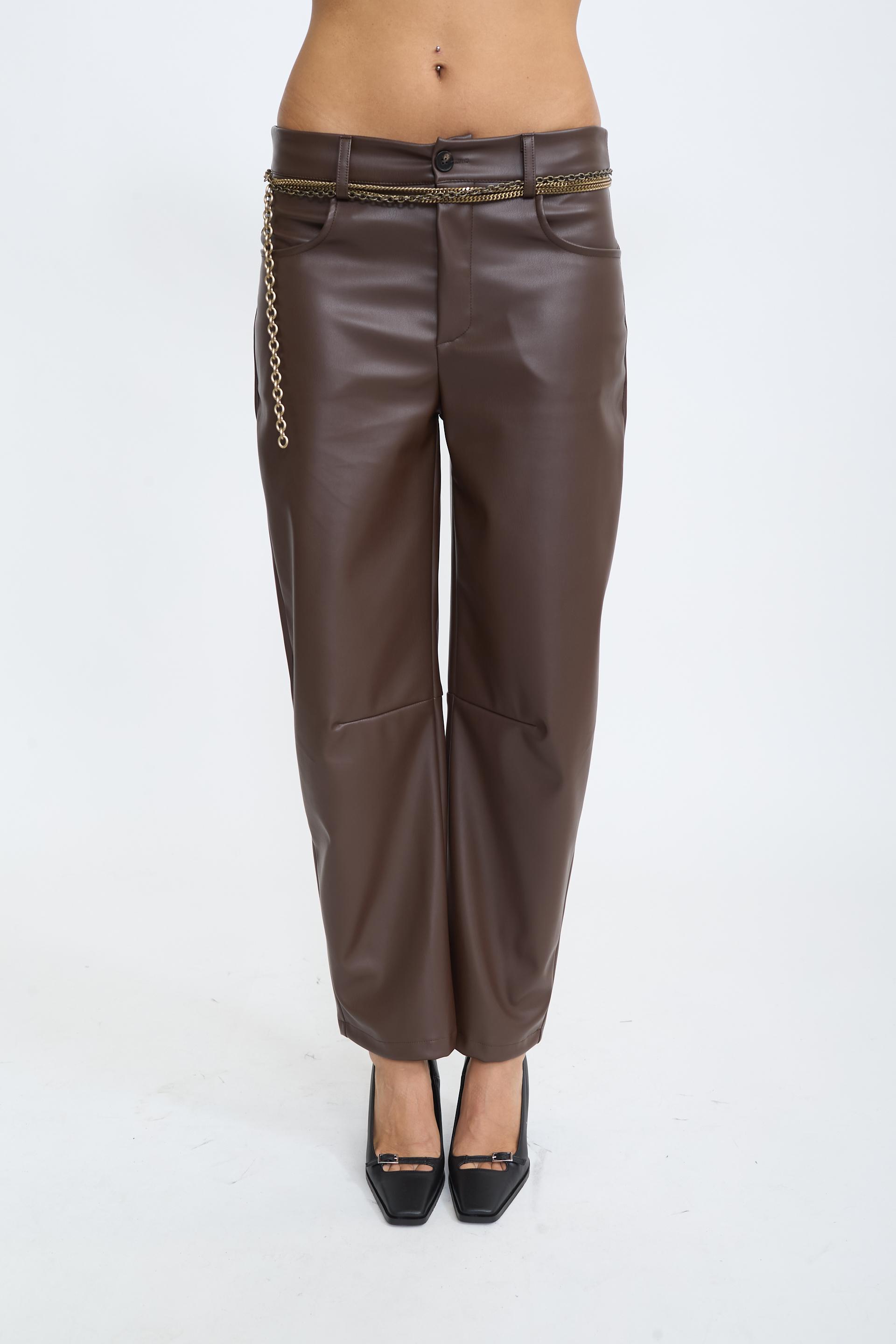 Pantalone barrel effetto pelle con cucitura al ginocchio. Tasche laterali e tasche posteriori applicate. Passanti in vita e chiusura tramite cerniera e bottone. | ||