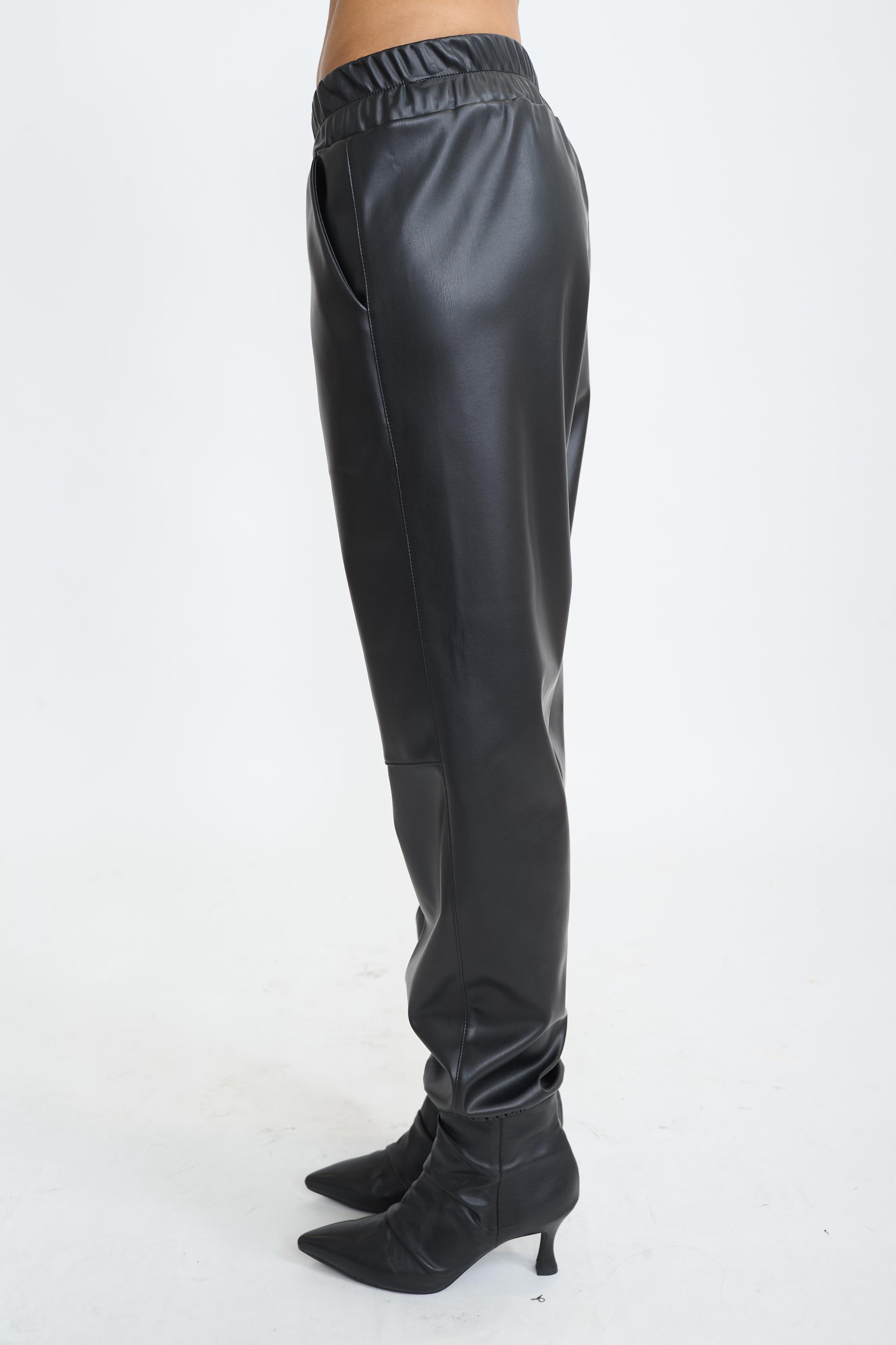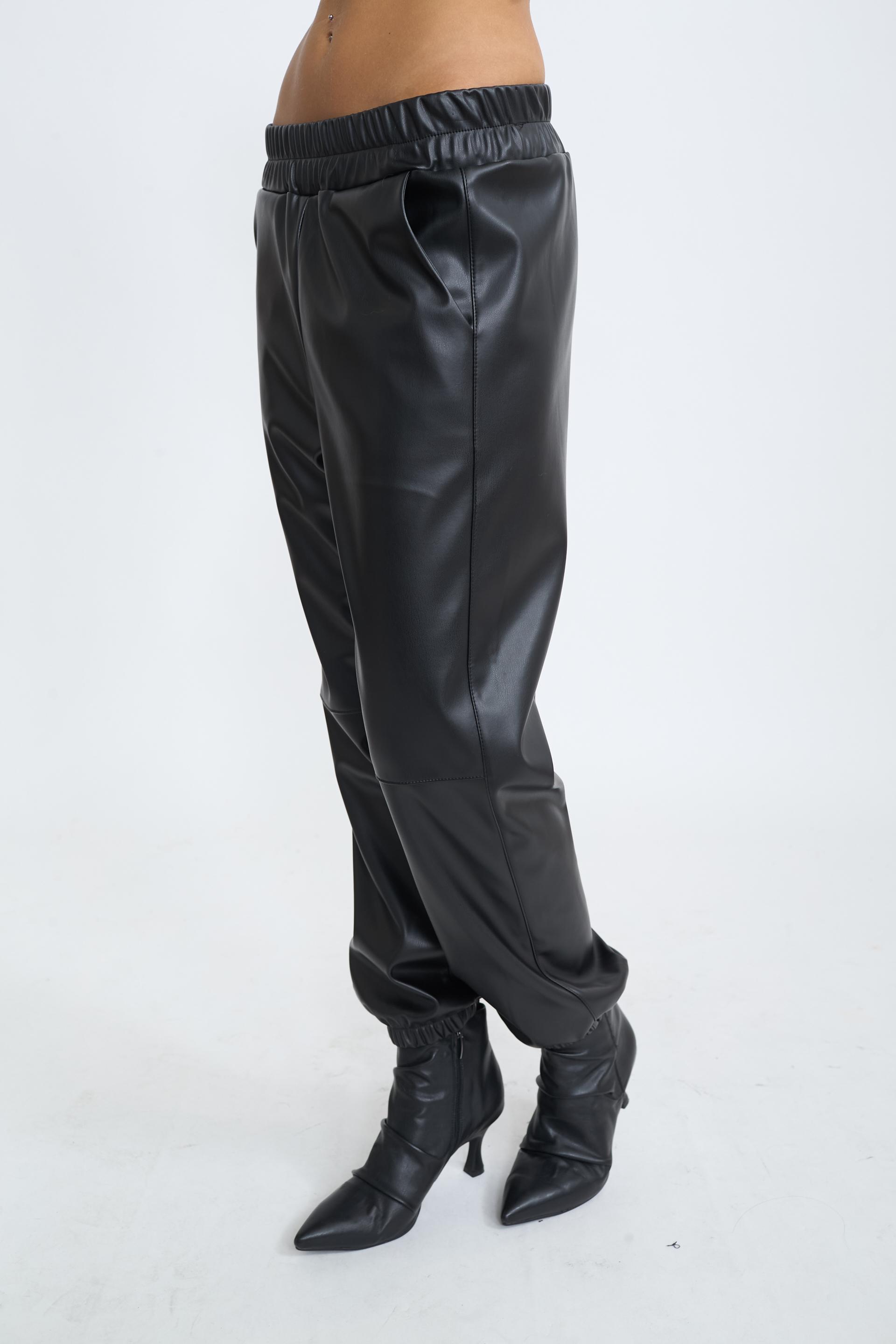 Pantalone modello jogger effetto pelle con elastico in vita e alla caviglia. Tasche laterali. | ||