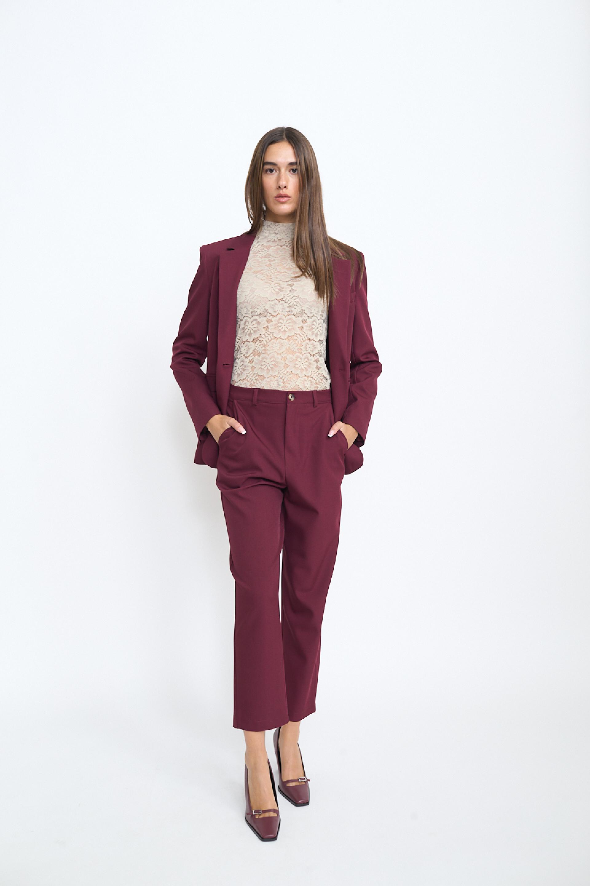 | Pantalone cicca con tasche laterali e passanti in vita. Chiusura tramite cerniera e bottone. | ||