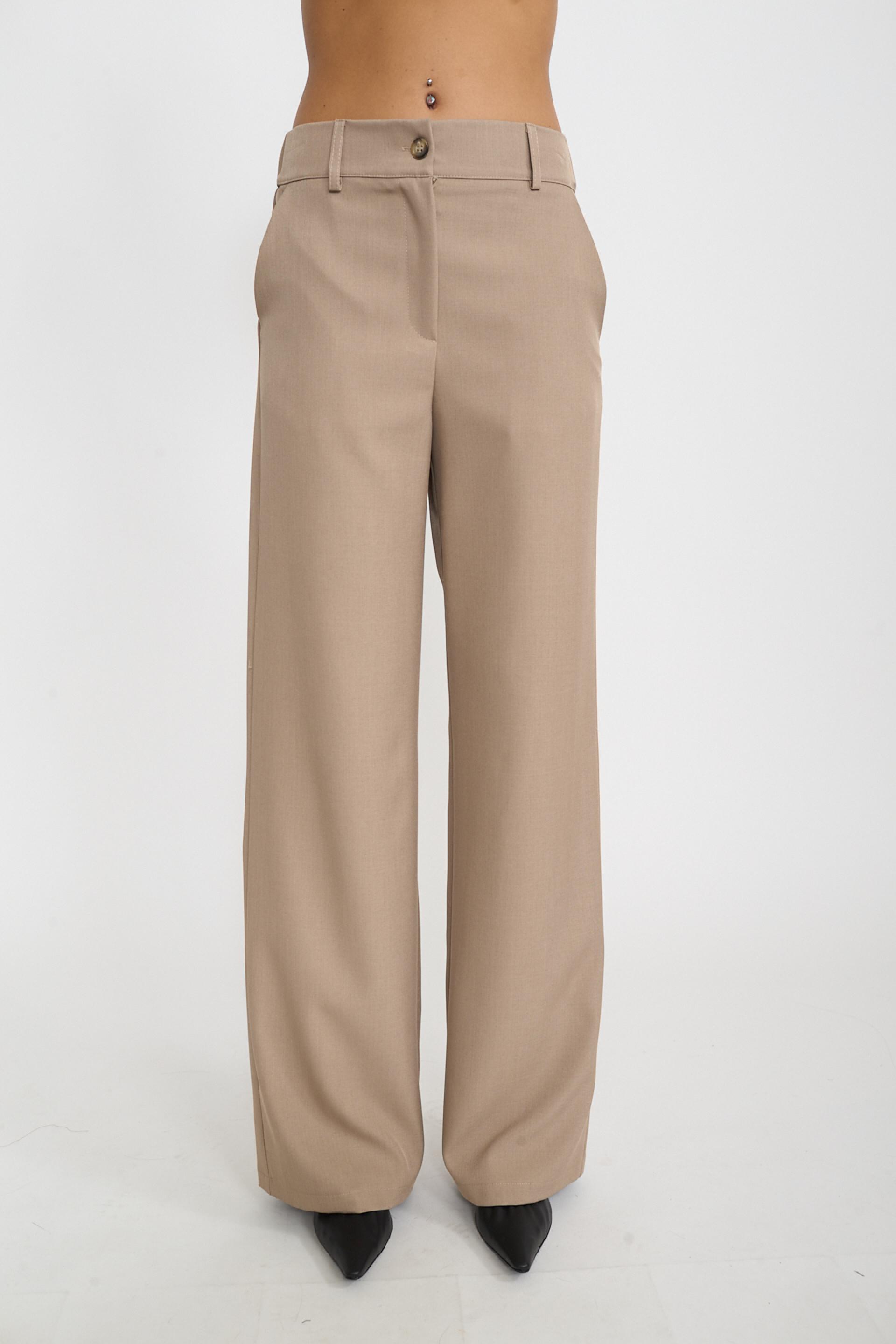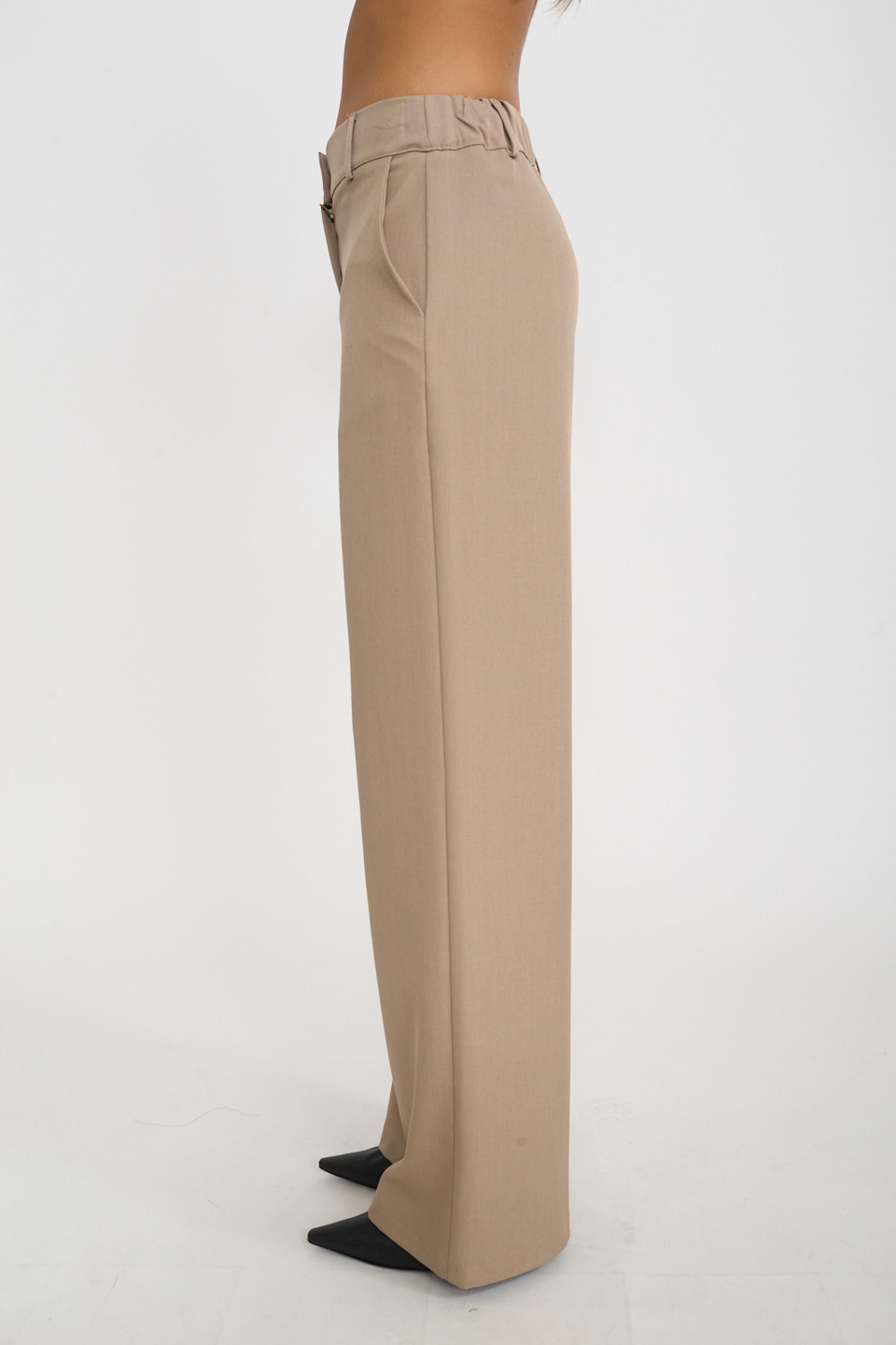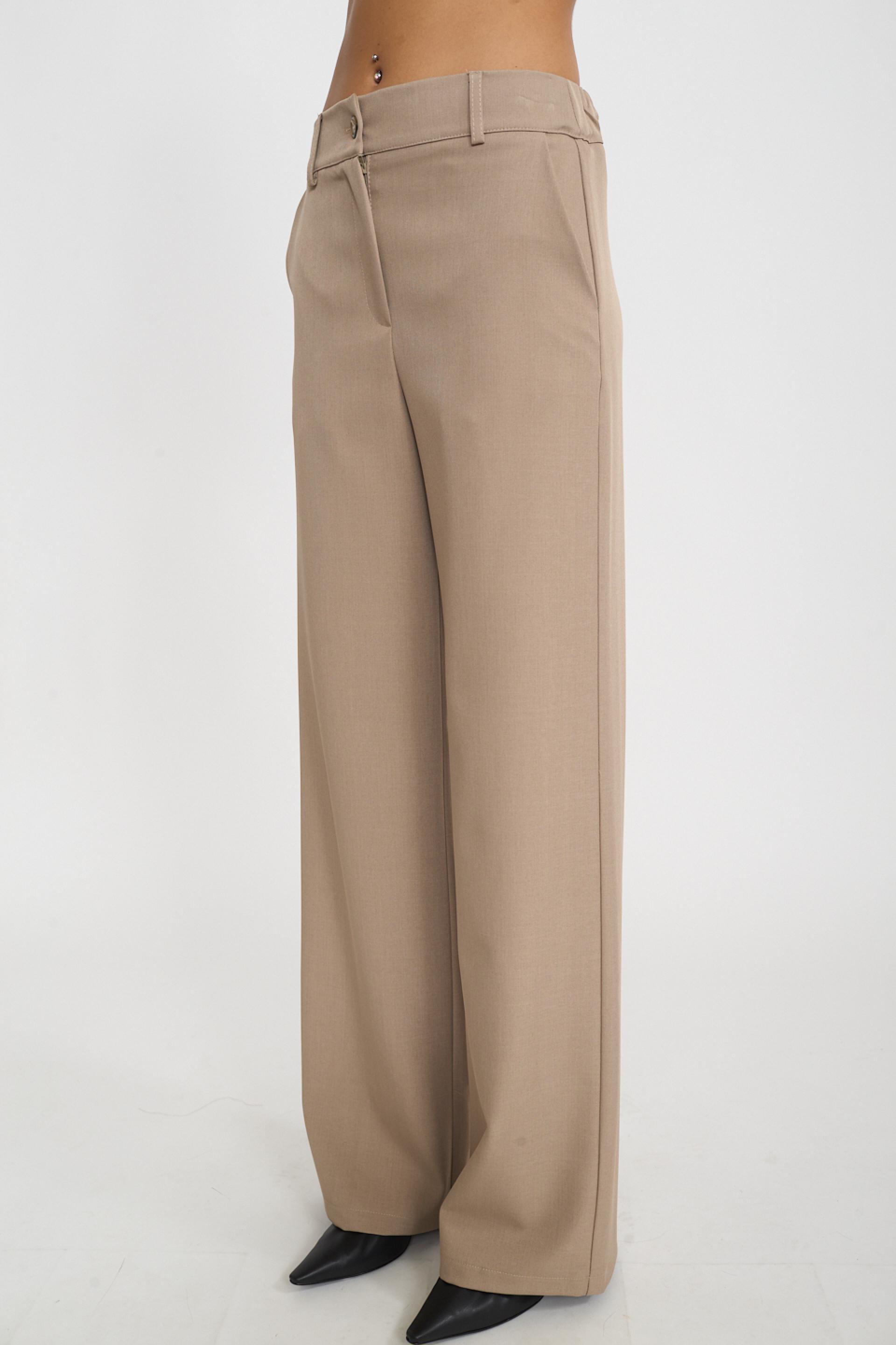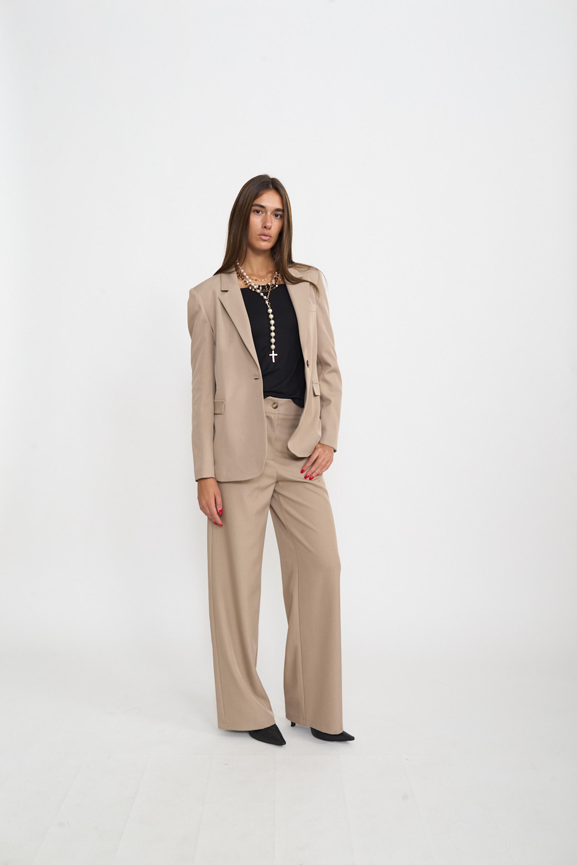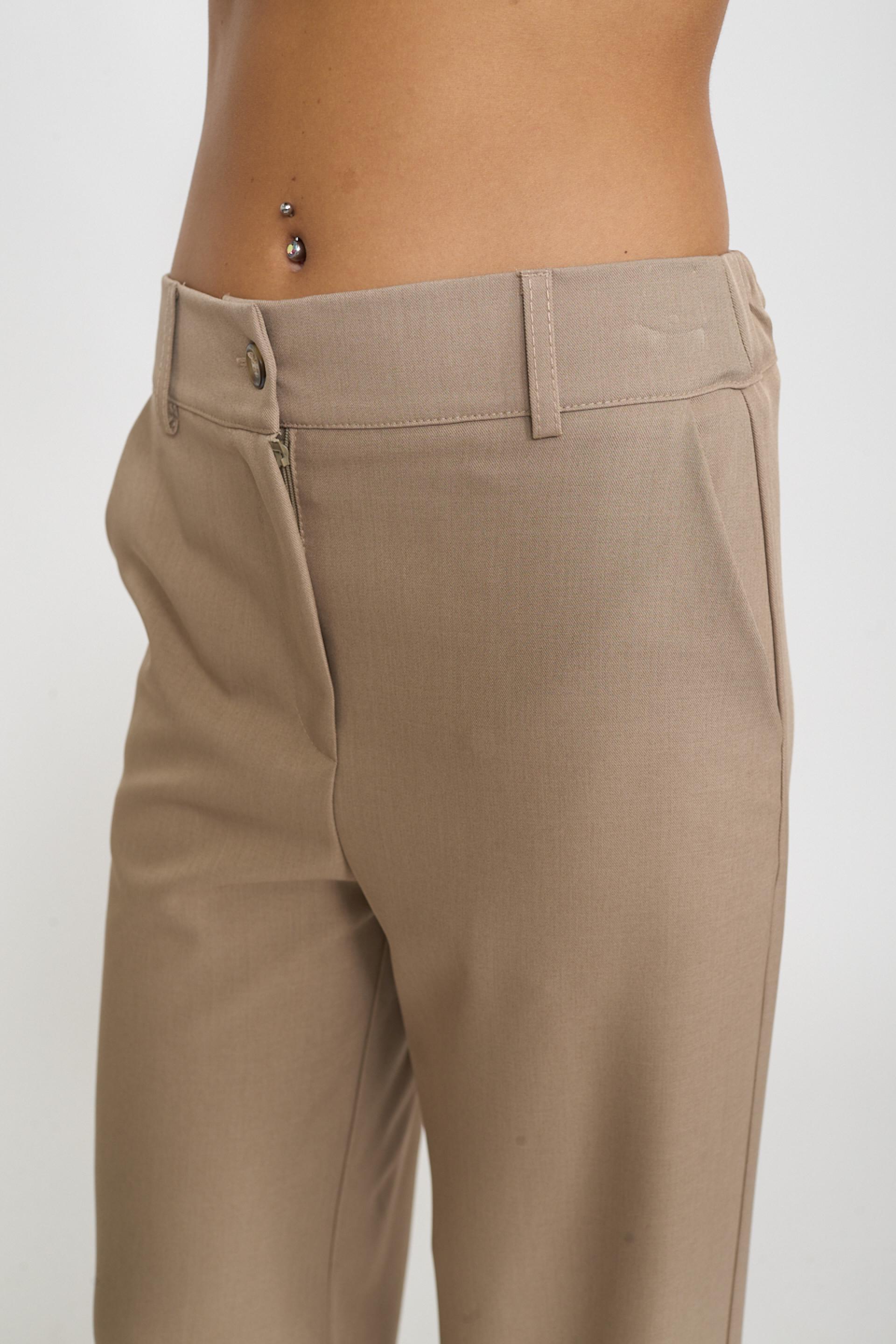 | Pantalone palazzo con elastico dietro la vita. Tasche laterali e passanti in vita. Chiusura tramite cerniera e bottone. | ||