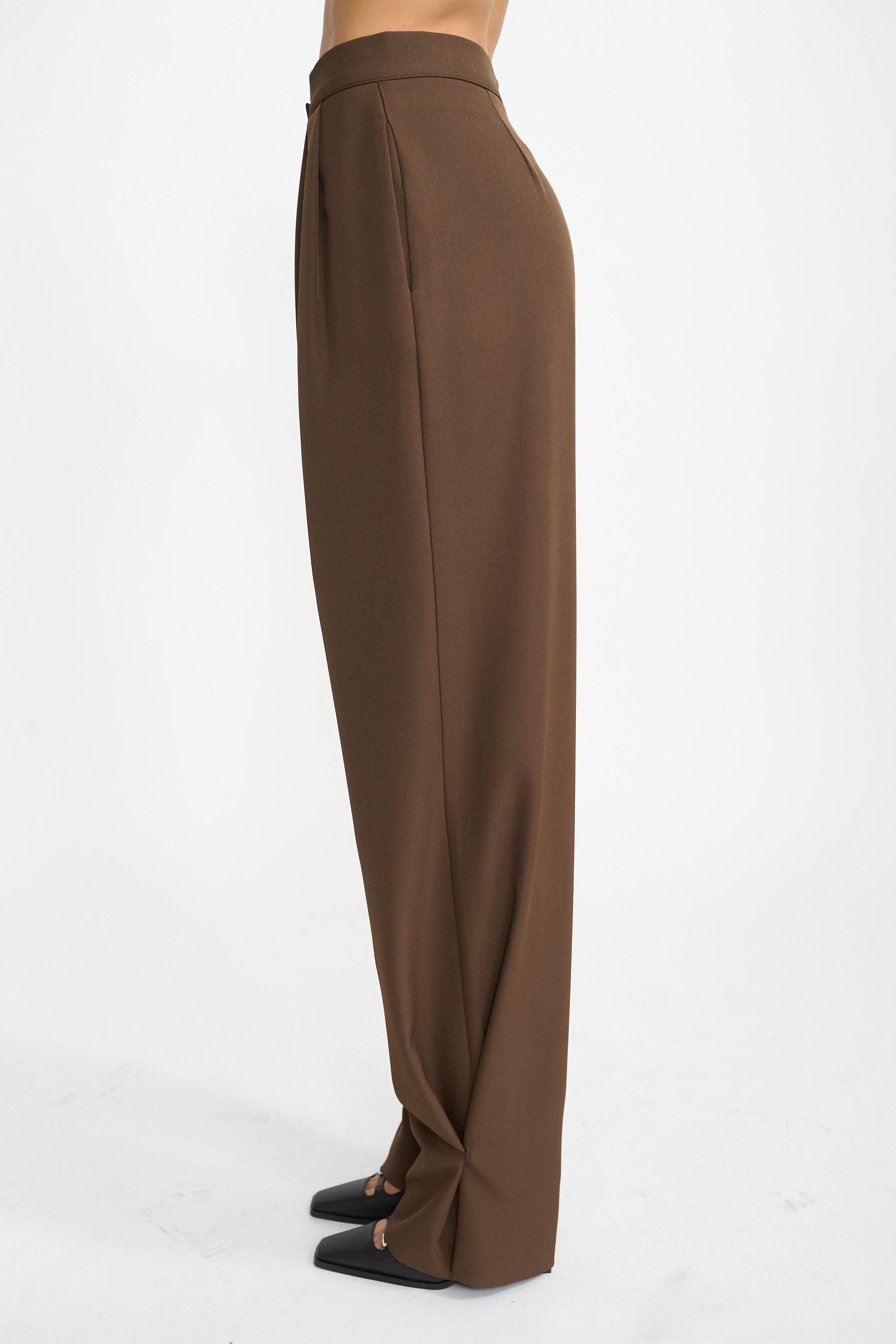 | Pantalone palazzo con pieghe e tasche laterali. Dettaglio di bottone alla caviglia. | ||