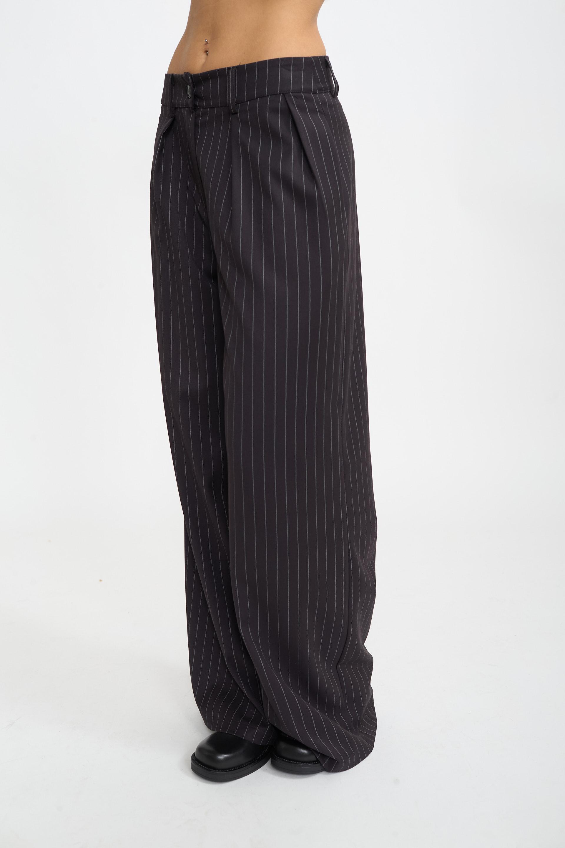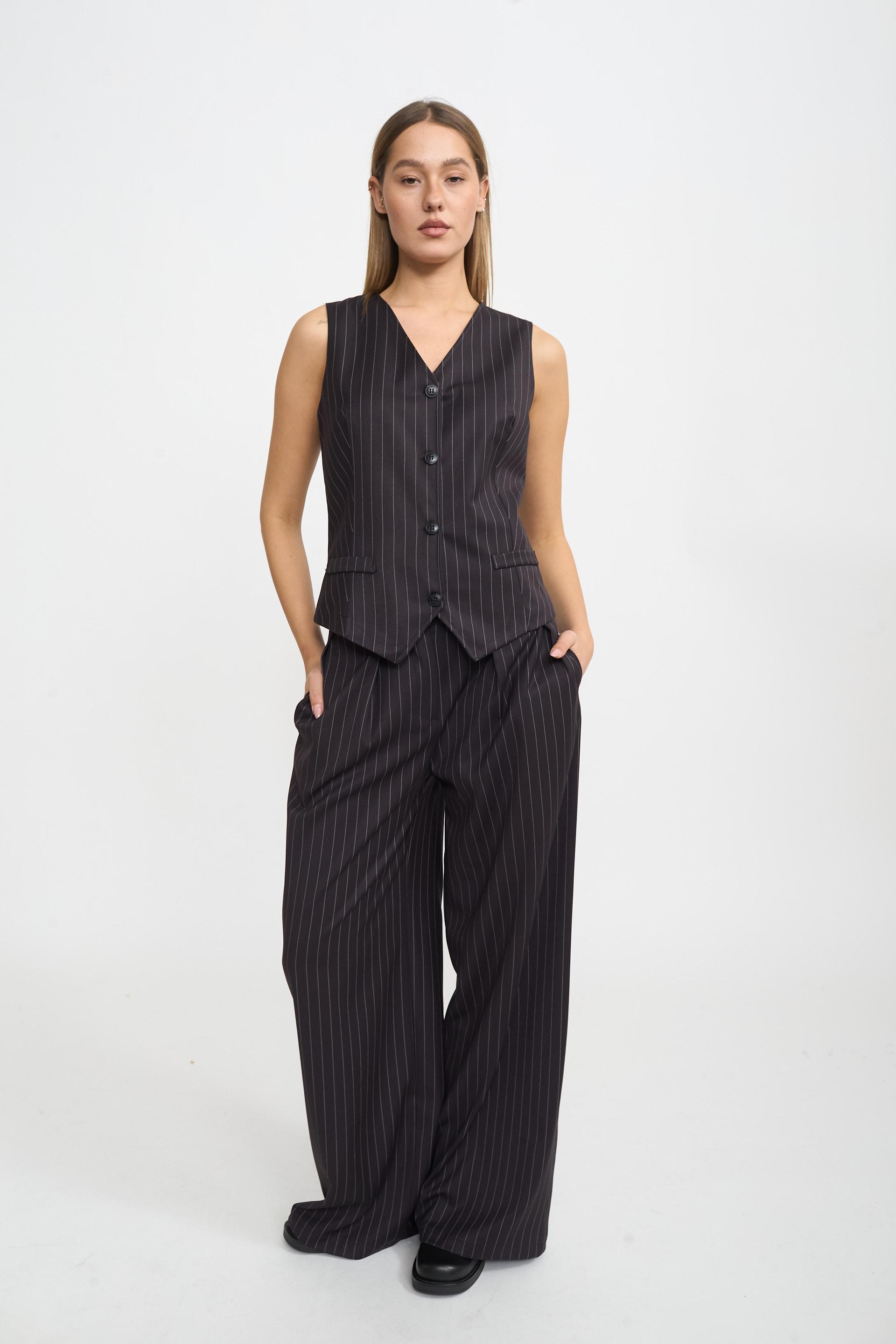 | Pantalone palazzo gessato con pinces e tasche laterali. Passanti in vita e chiusura tramite bottone e cerniera. | ||