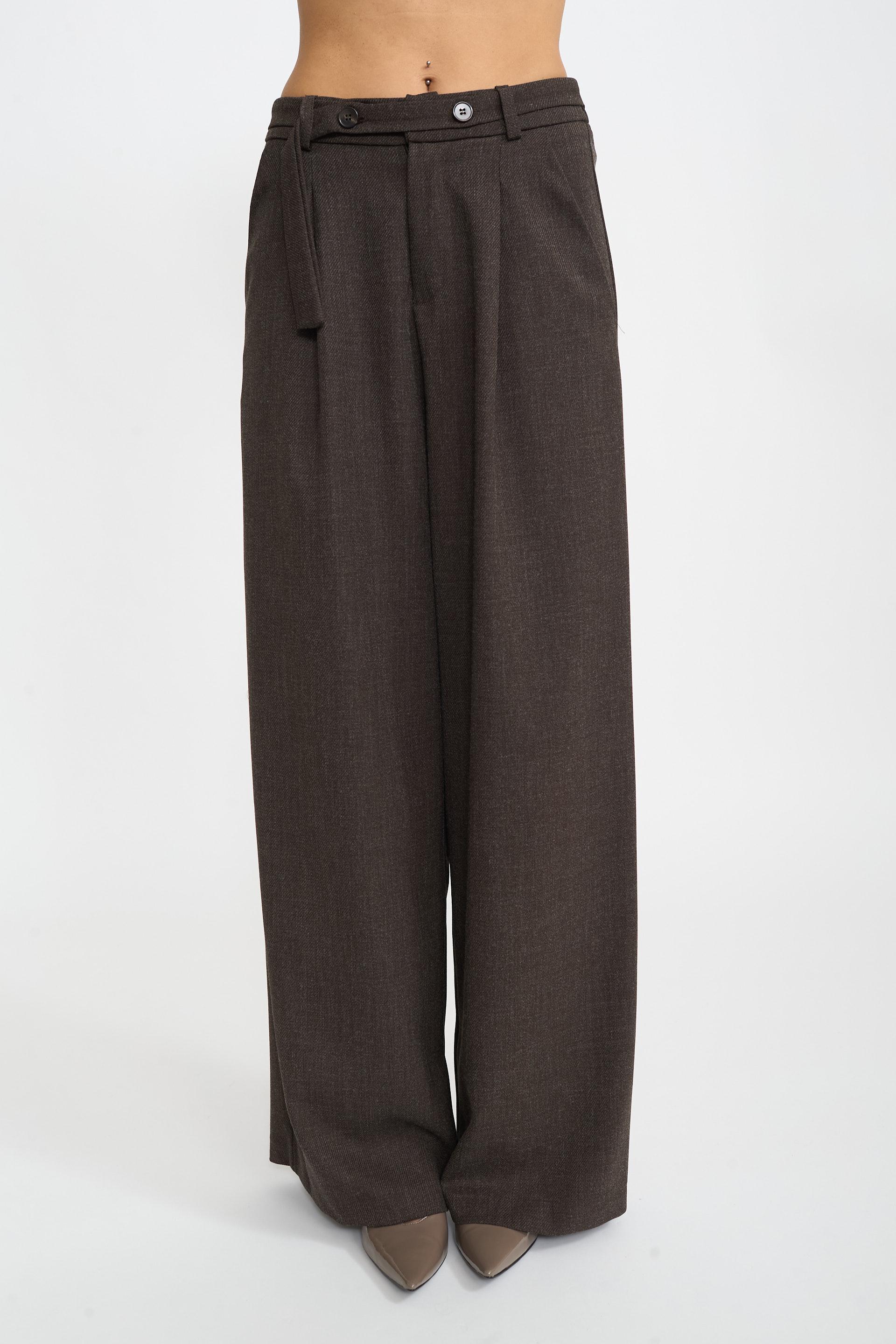 | Pantalone palazzo con pinces ed elastico dietro la vita. Tasche laterali e dettaglio di cintina in tessuto. Chiusura tramite gancetto metallico e 2 bottoni. | ||