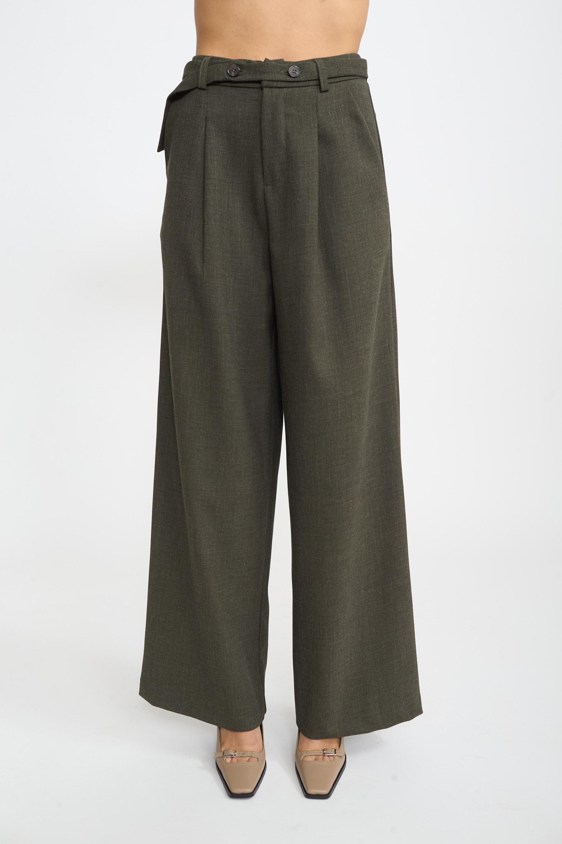 | Pantalone palazzo con pinces ed elastico dietro la vita. Tasche laterali e dettaglio di cintina in tessuto. Chiusura tramite gancetto metallico e 2 bottoni. | ||
