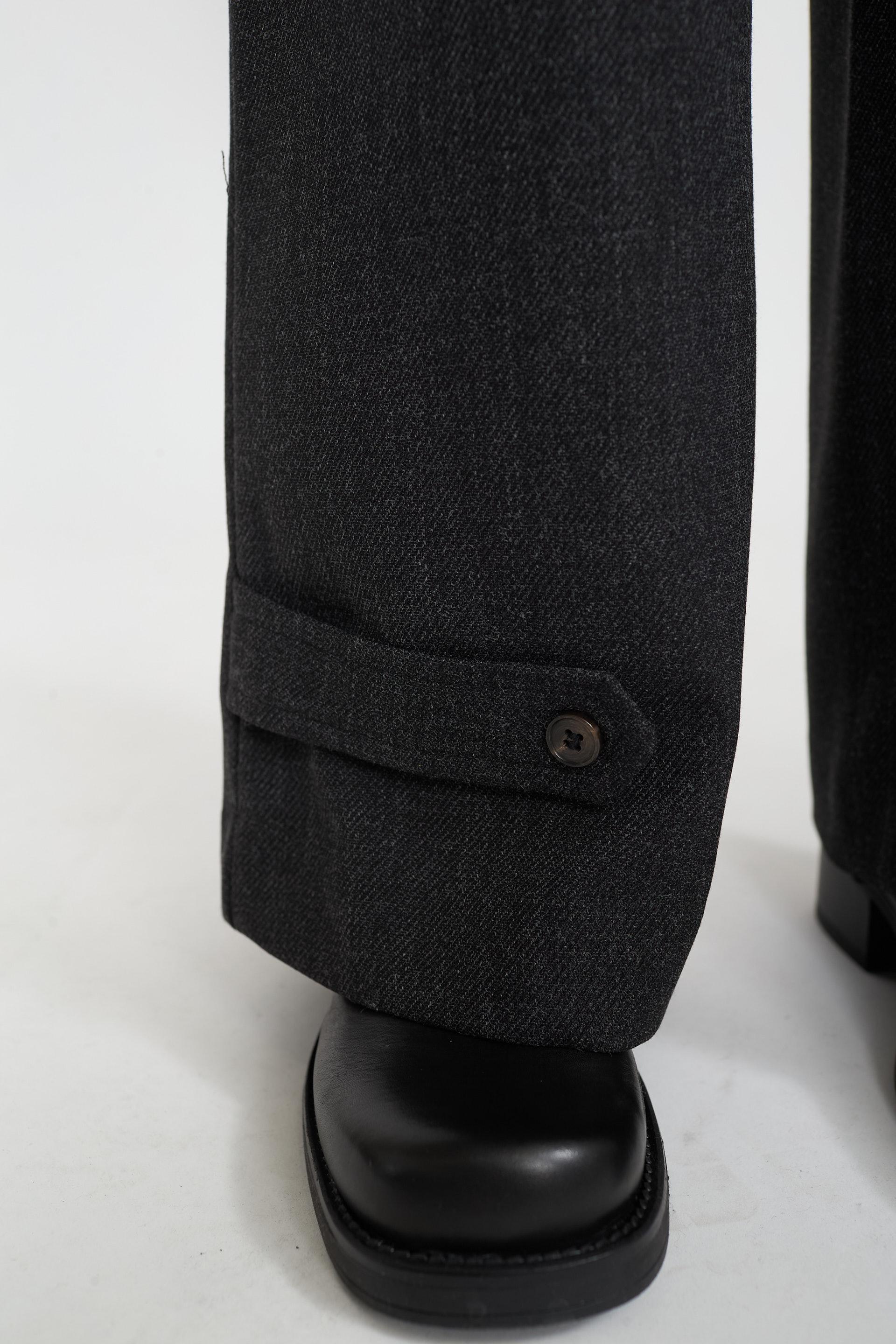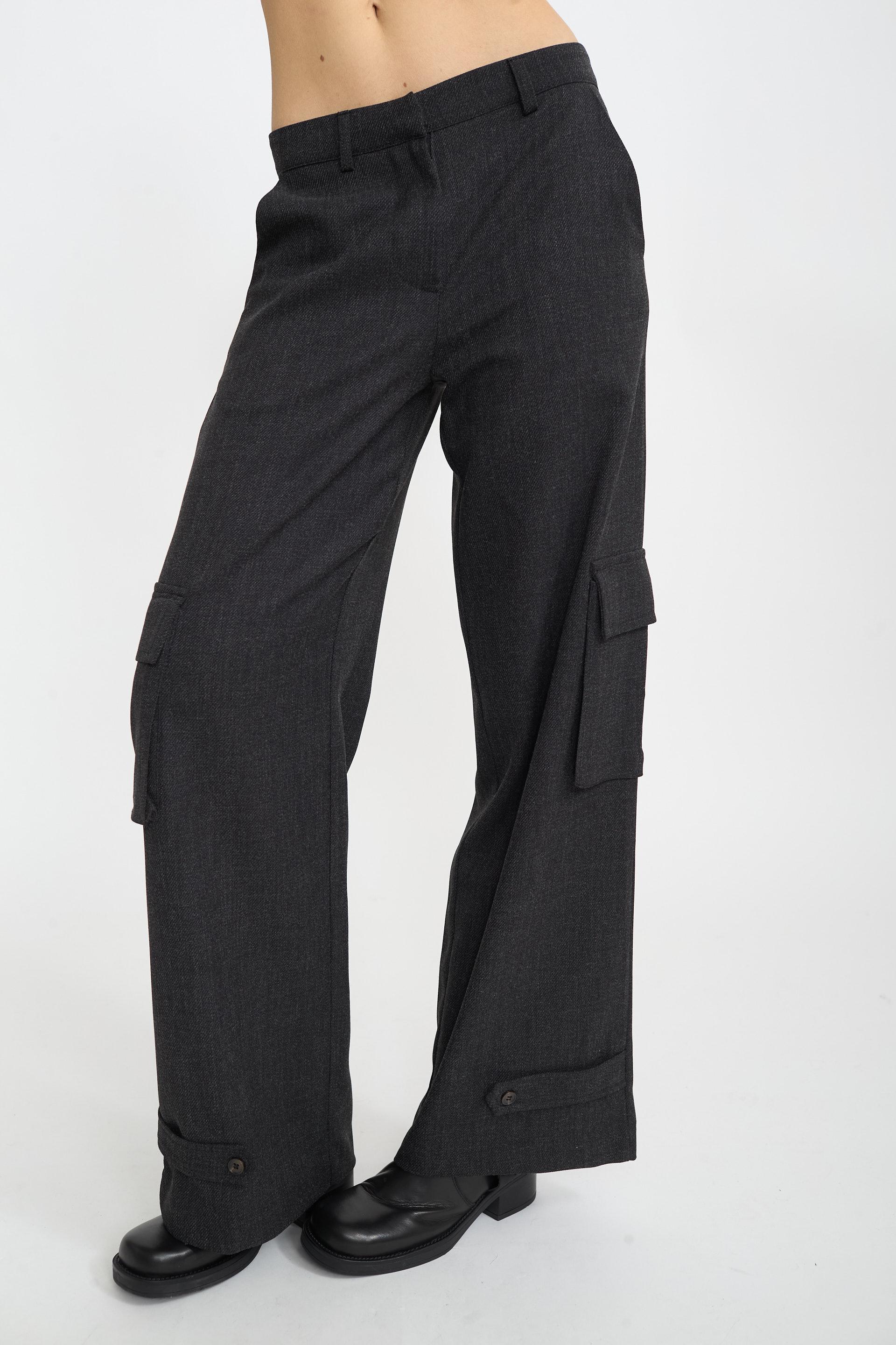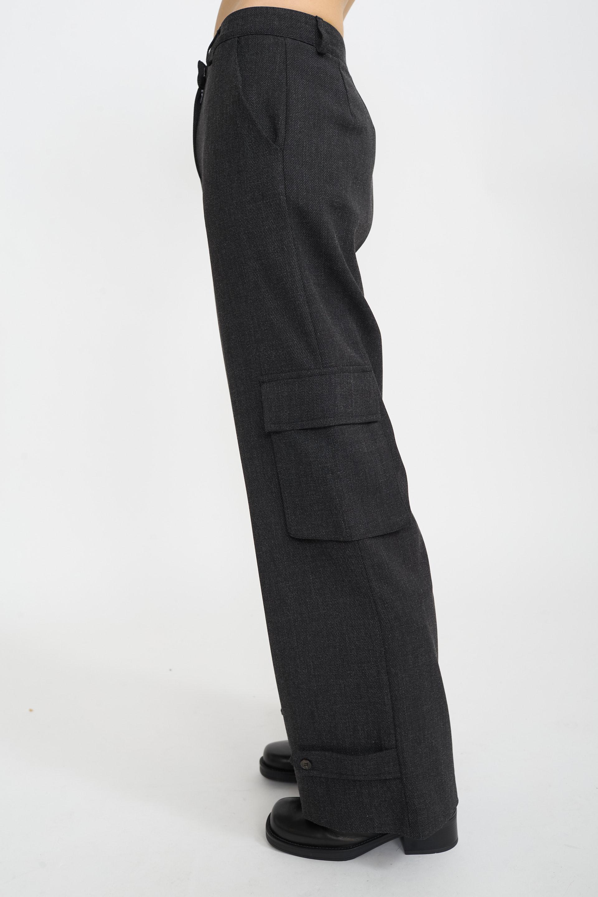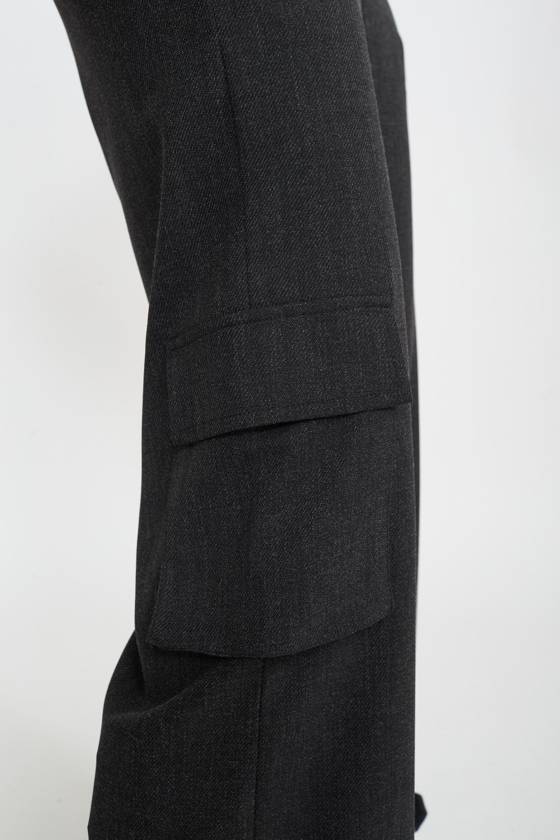 | Pantalone gamba larga con tasconi applicati al ginocchio. Tasche laterali e passanti in vita. Chiusura tramite gancetto. | ||