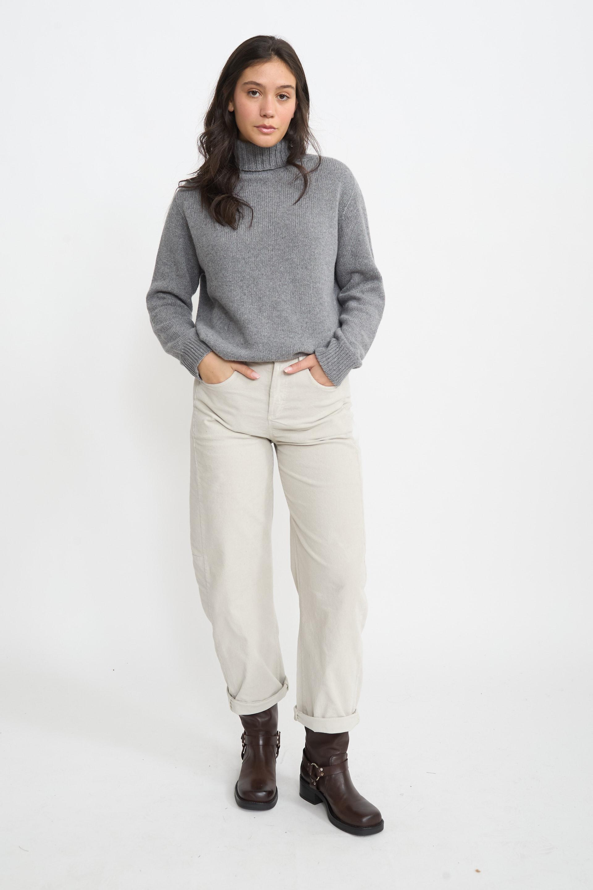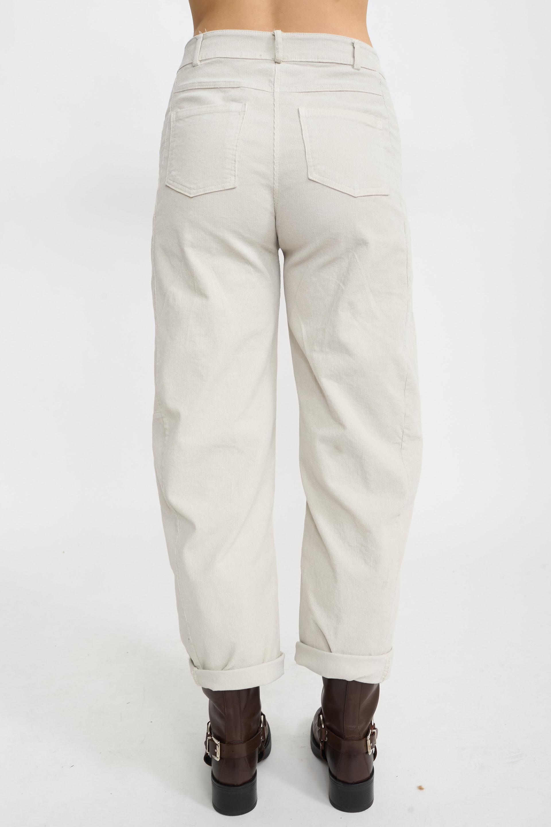 | Pantalone barrel in velluto con cucitura al ginocchio. Tasche laterali e tasche posteriori applicate. Passanti in vita e chiusura tramite bottone metallico e cerniera. | ||