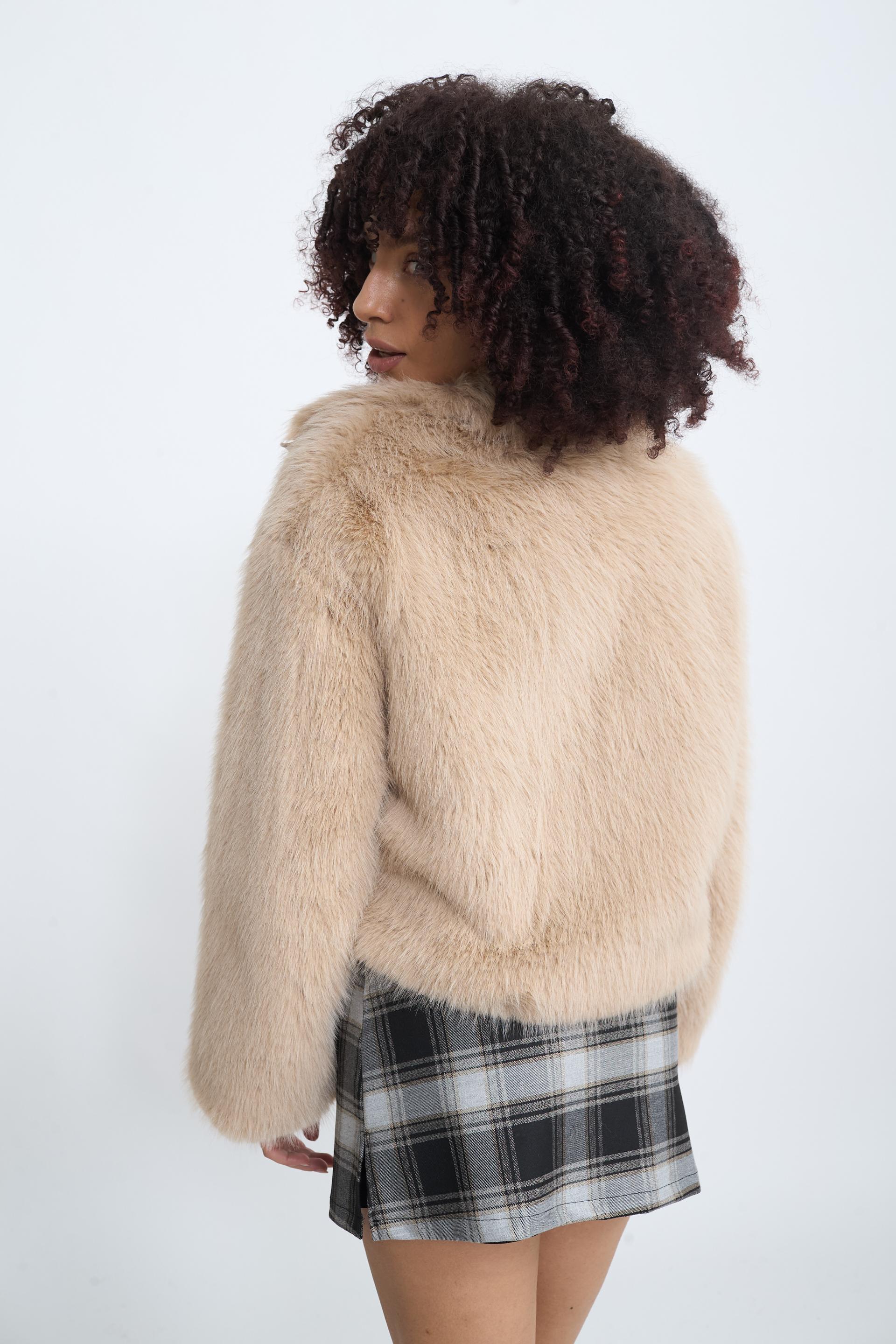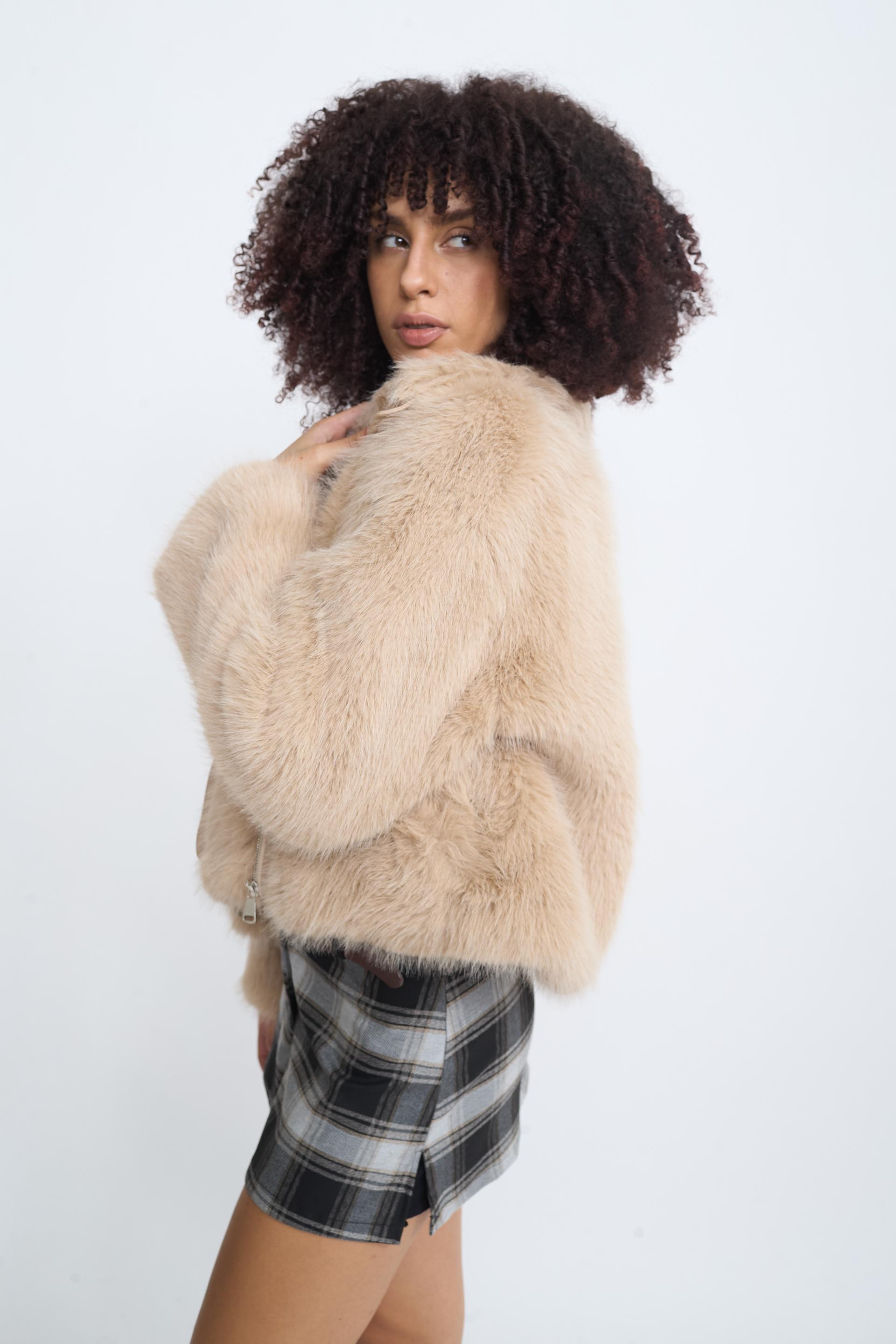 Eco-pelliccia modello chiodo con rifiniture in eco-pelle. Tasche laterali e chiusura tramite zip. Fodera interna tono su tono. | ||