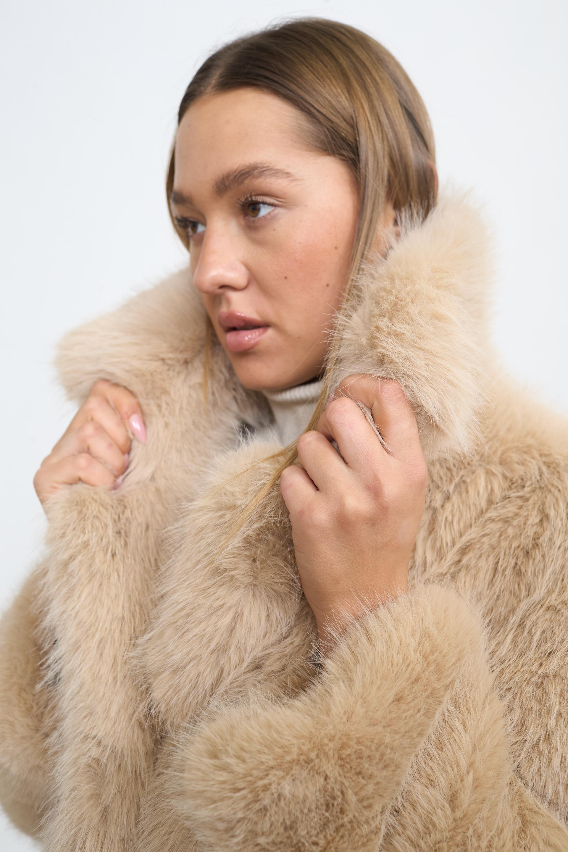 Eco-pelliccia con collo revers con tasche. Chiusura tramite gancio. Fodera interna. | ||