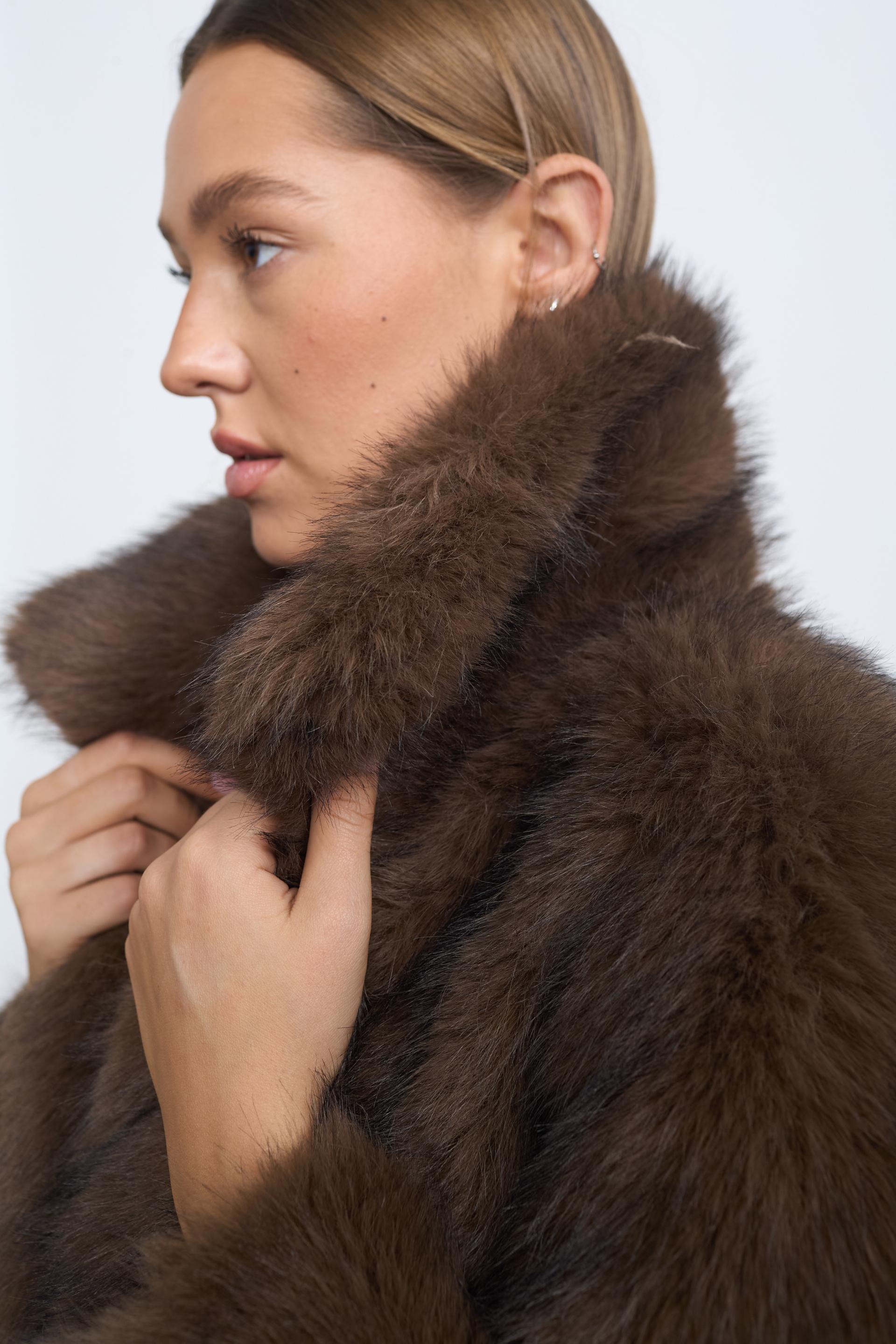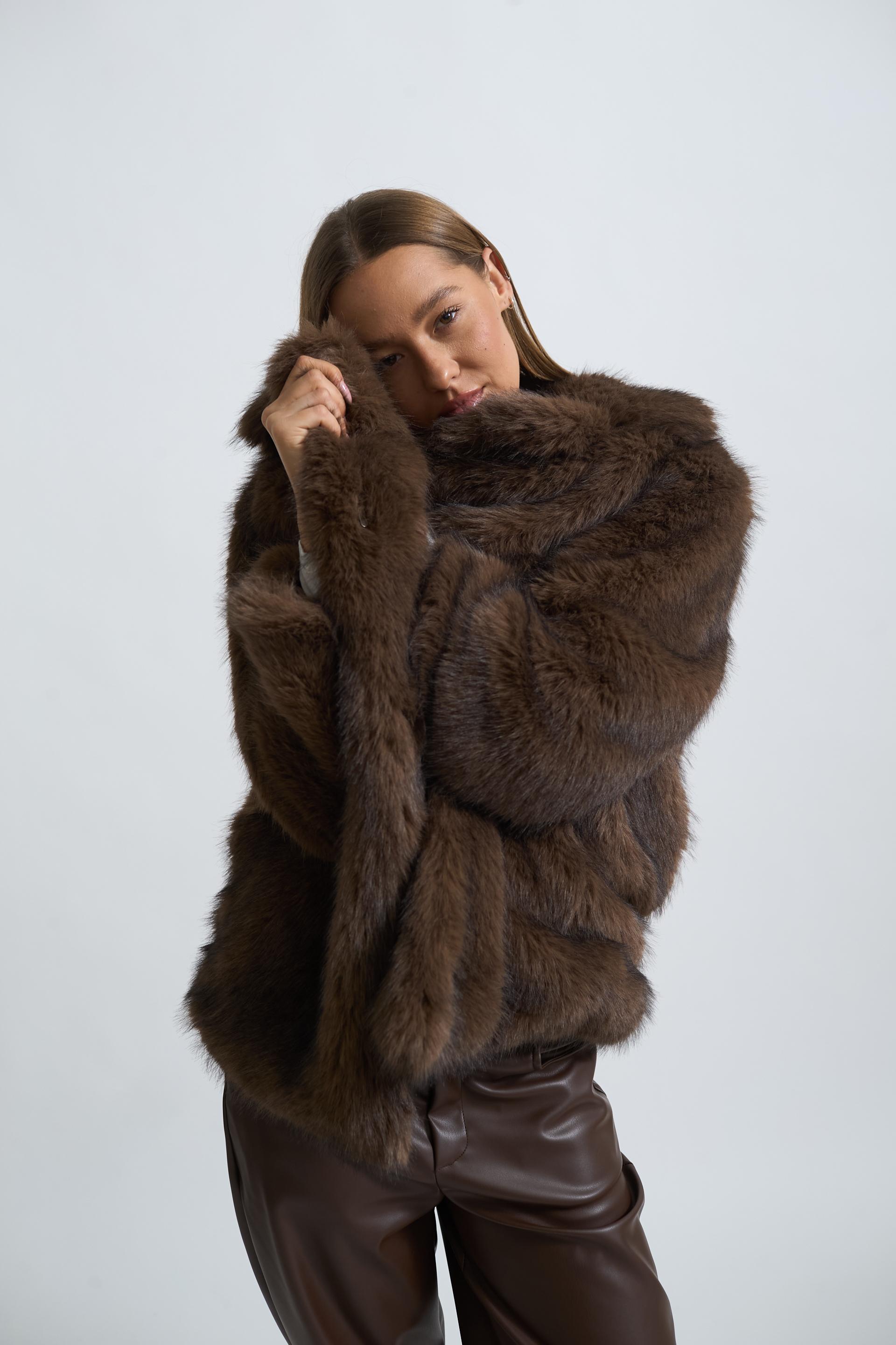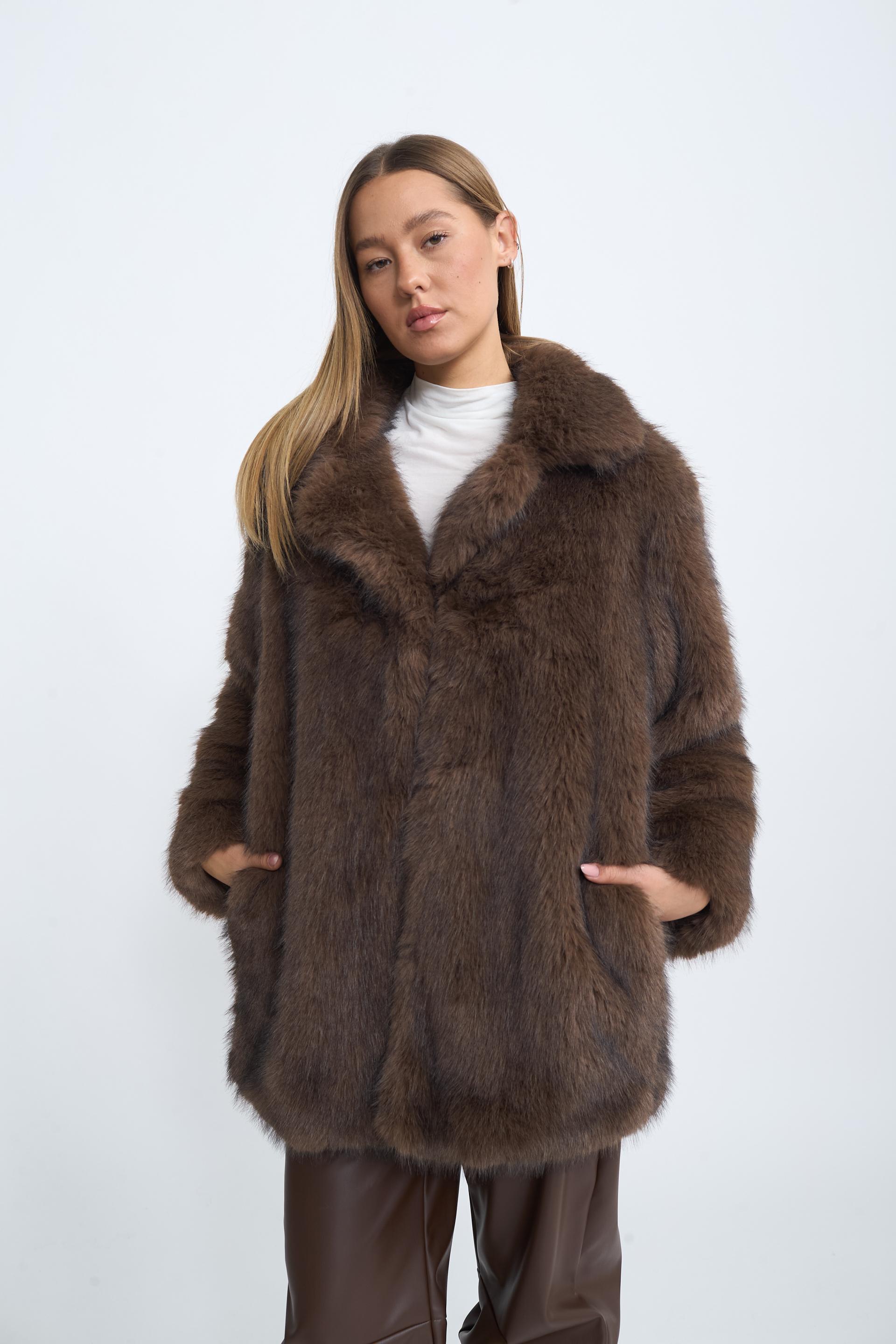 Eco-pelliccia con collo revers con tasche. Chiusura tramite gancio. Fodera interna. | ||