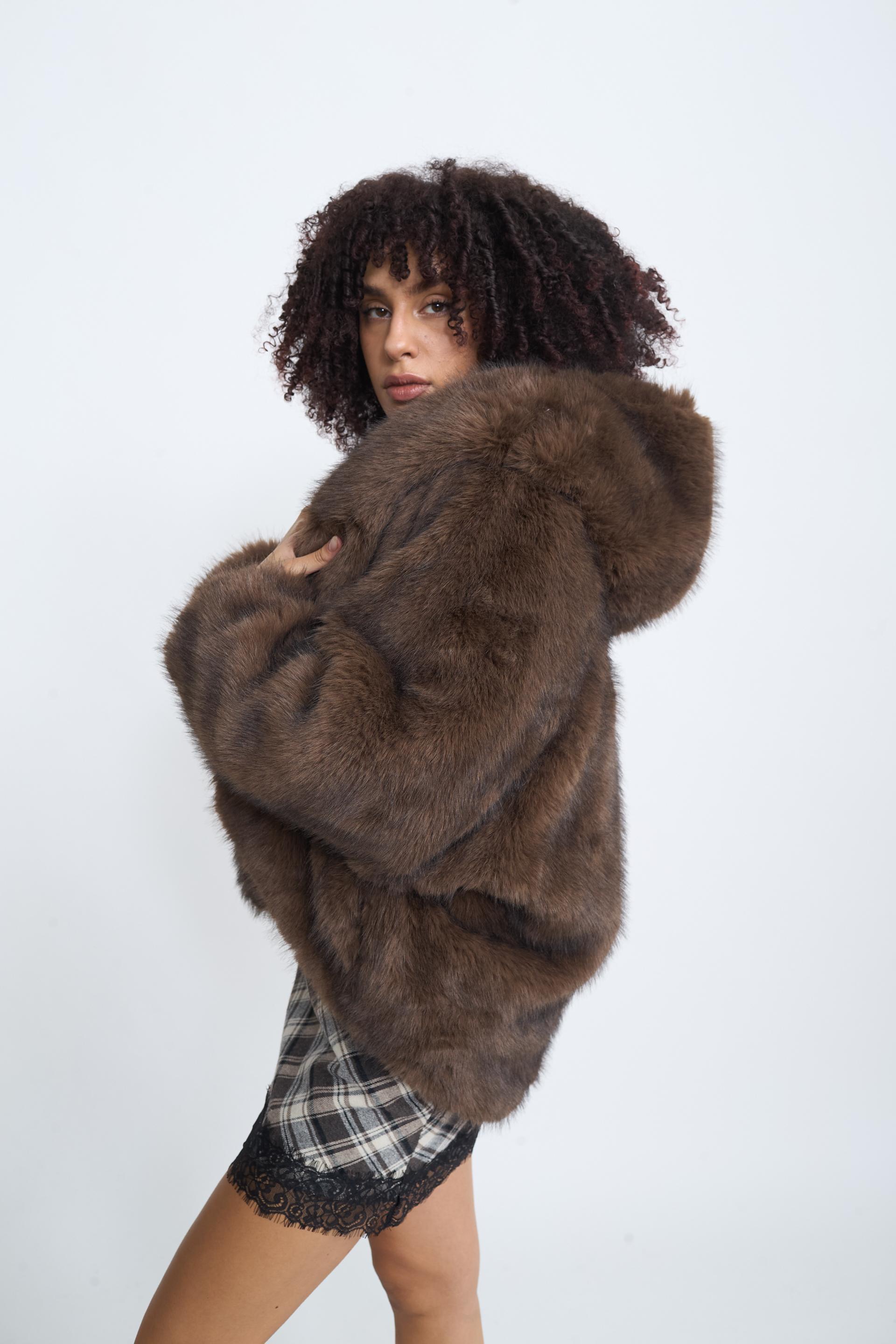 Pelliccia con cappuccio over. Fodera interna. Chiusura tramite gancio. | ||