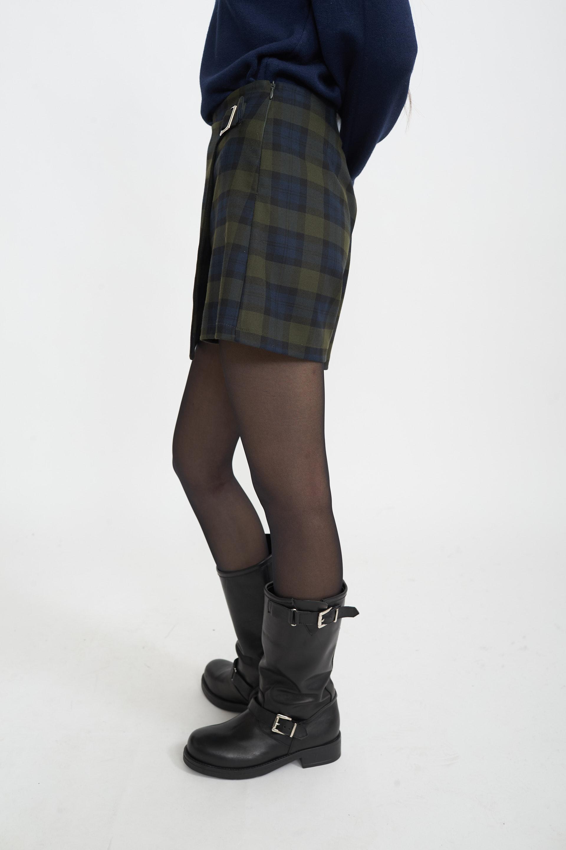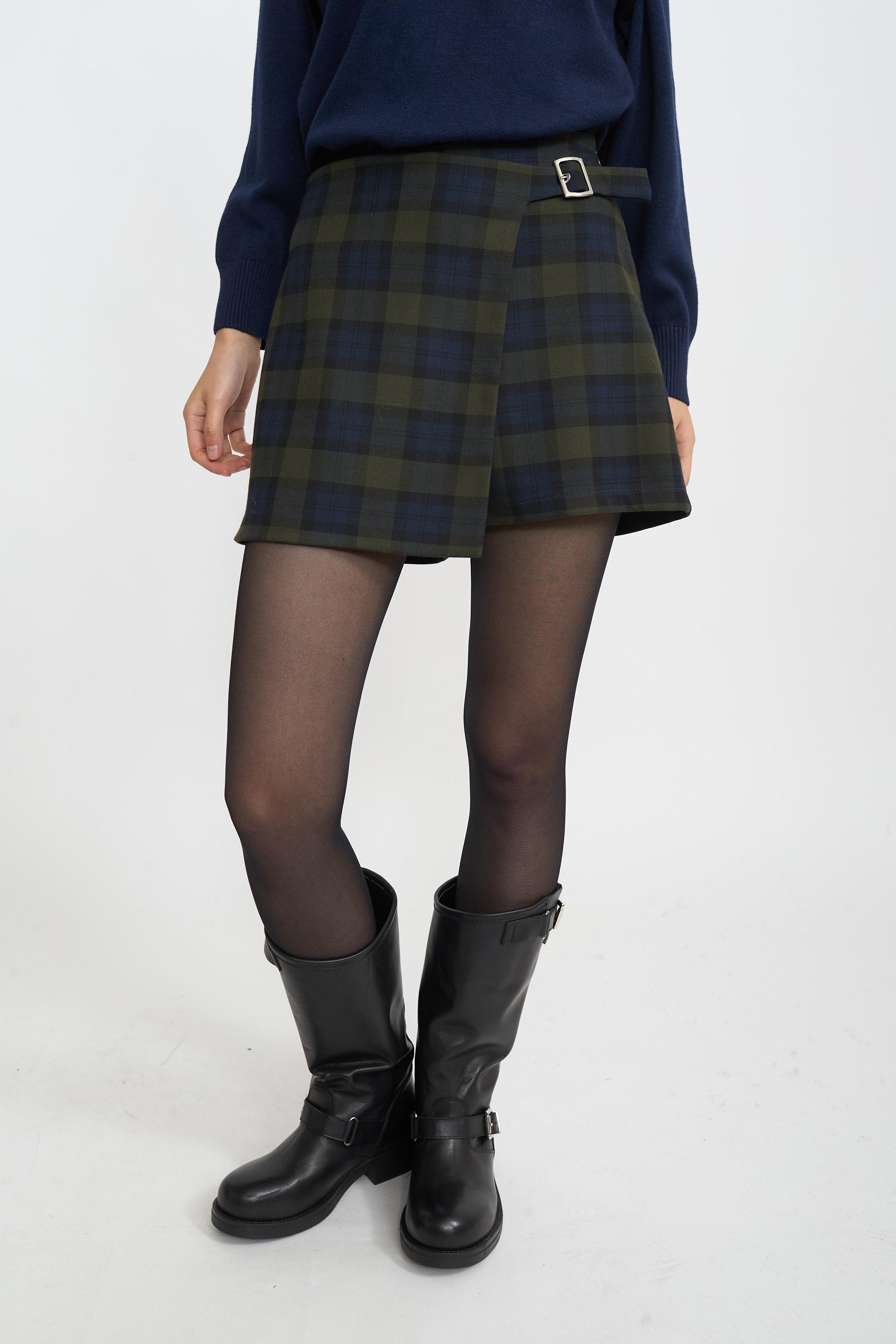 | Shorts portafoglio in misto viscosa a quadri. Dettaglio di porzione di cinta con fibbia. Chiusura laterale tramite cerniera nascosta nella cucitura. | ||