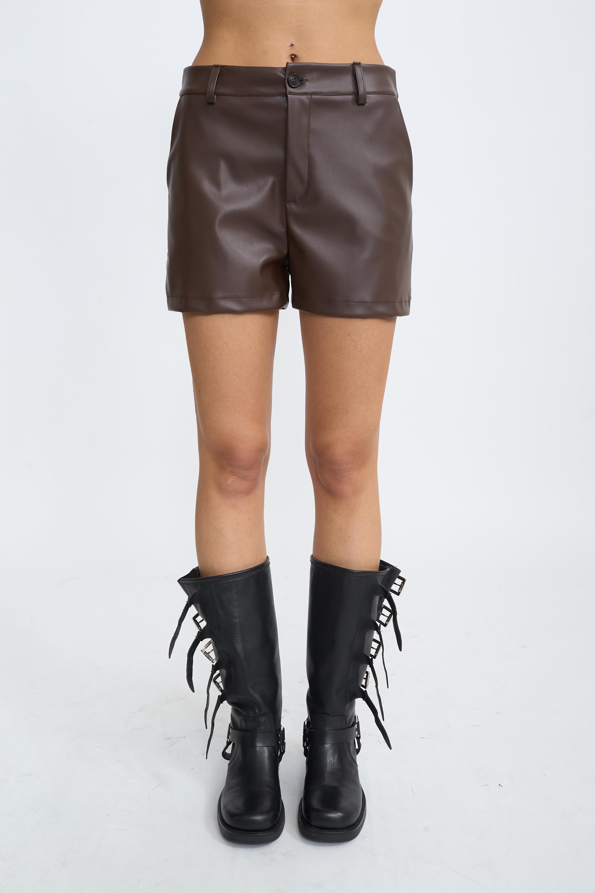 Shorts in tessuto effetto pelle con tasche laterali e finte tasche posteriori con pattina. Passanti in vita e chiusura tramite cerniera e bottone. | ||