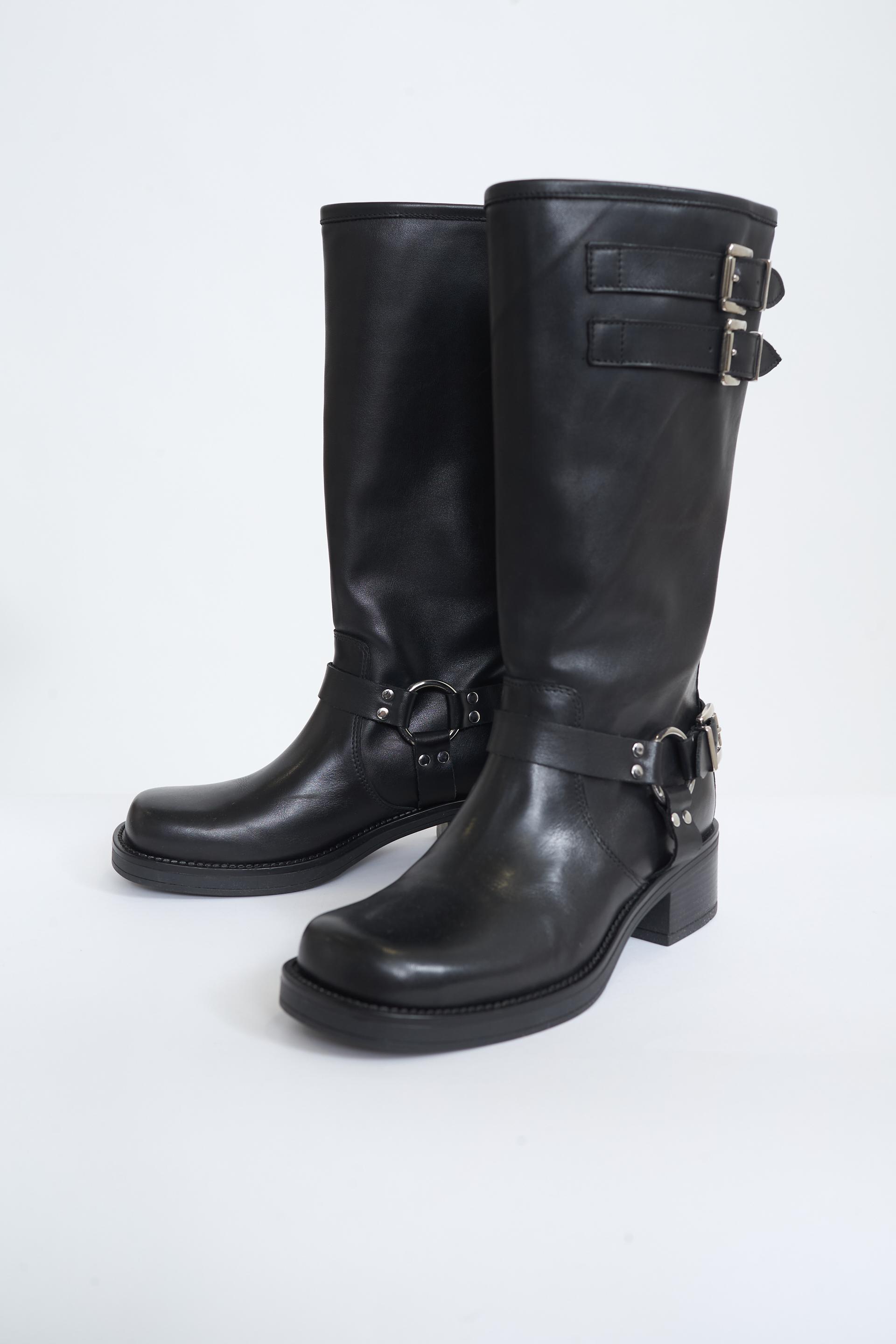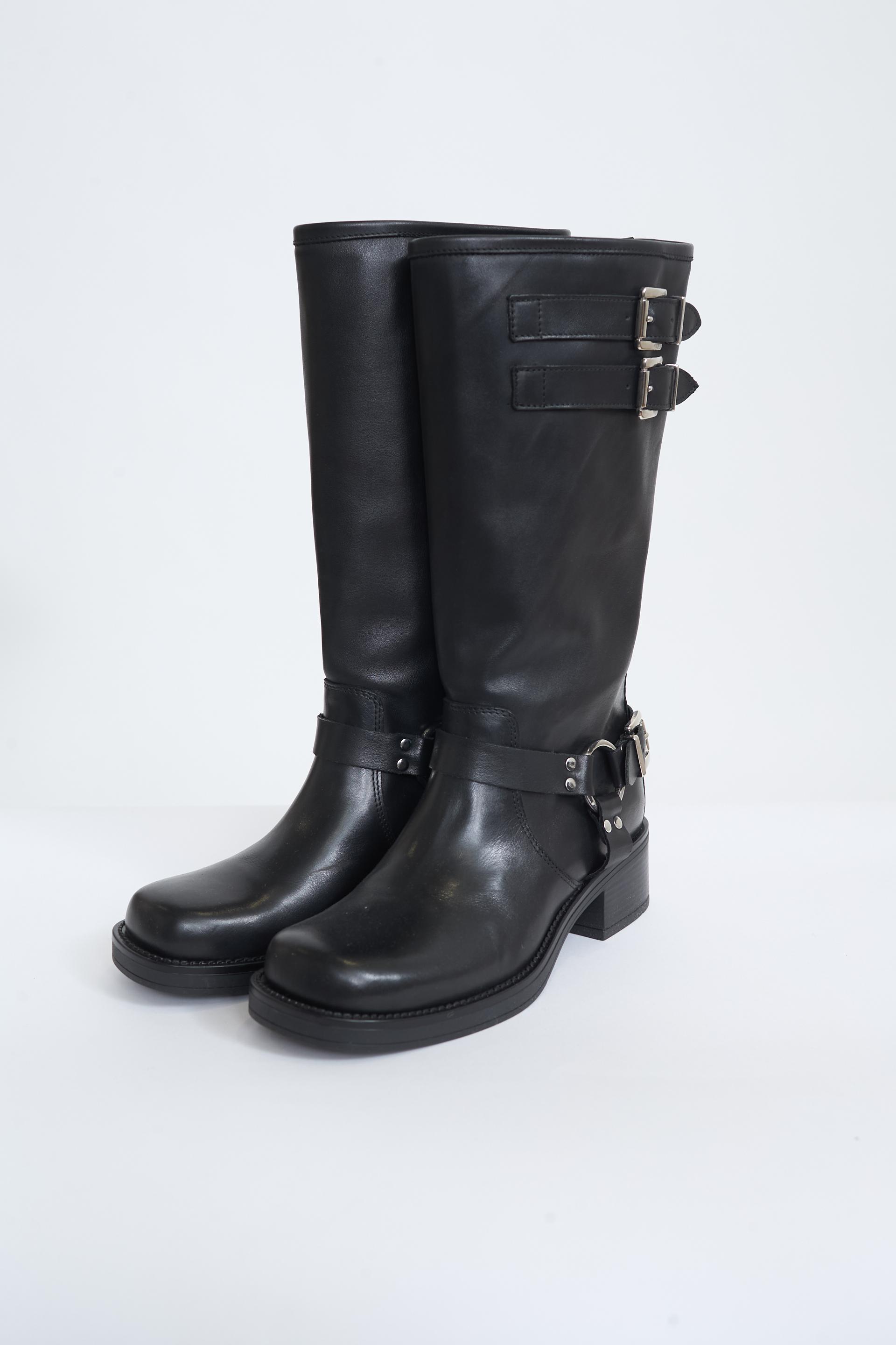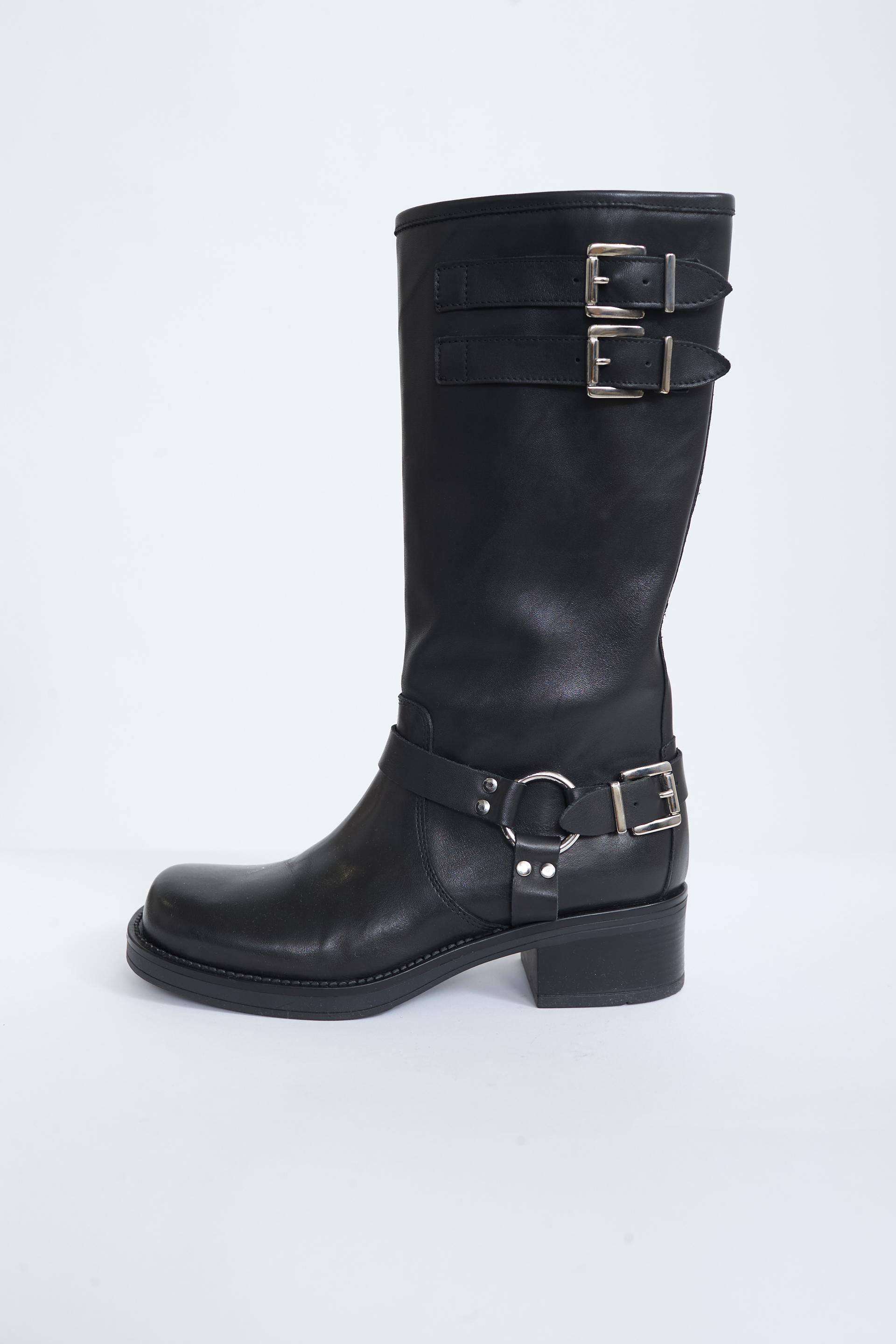 Stivale modello biker con punta stondata e dettaglio di cavigliera con anello e borchie. Doppia fibbia. | ||