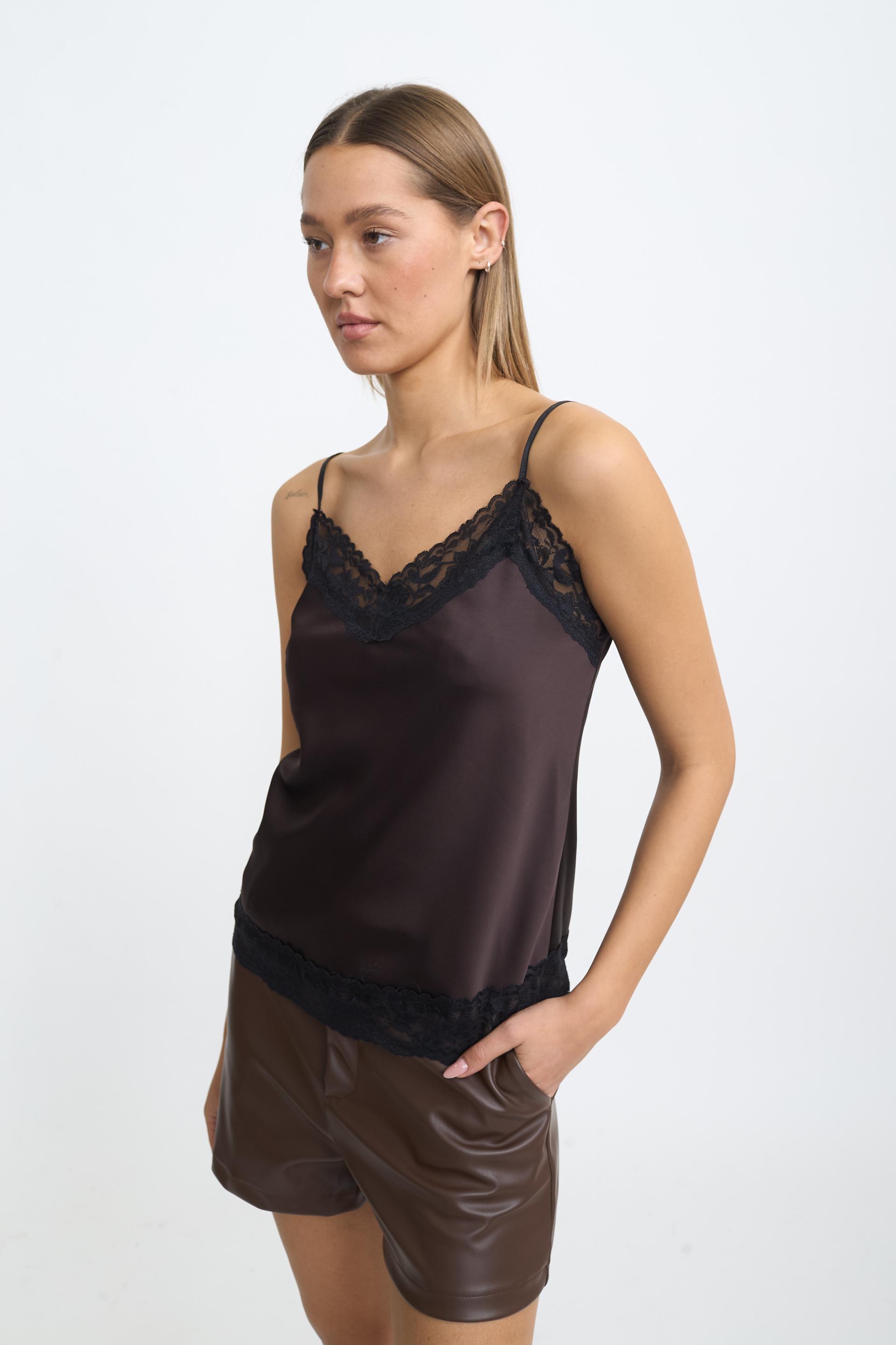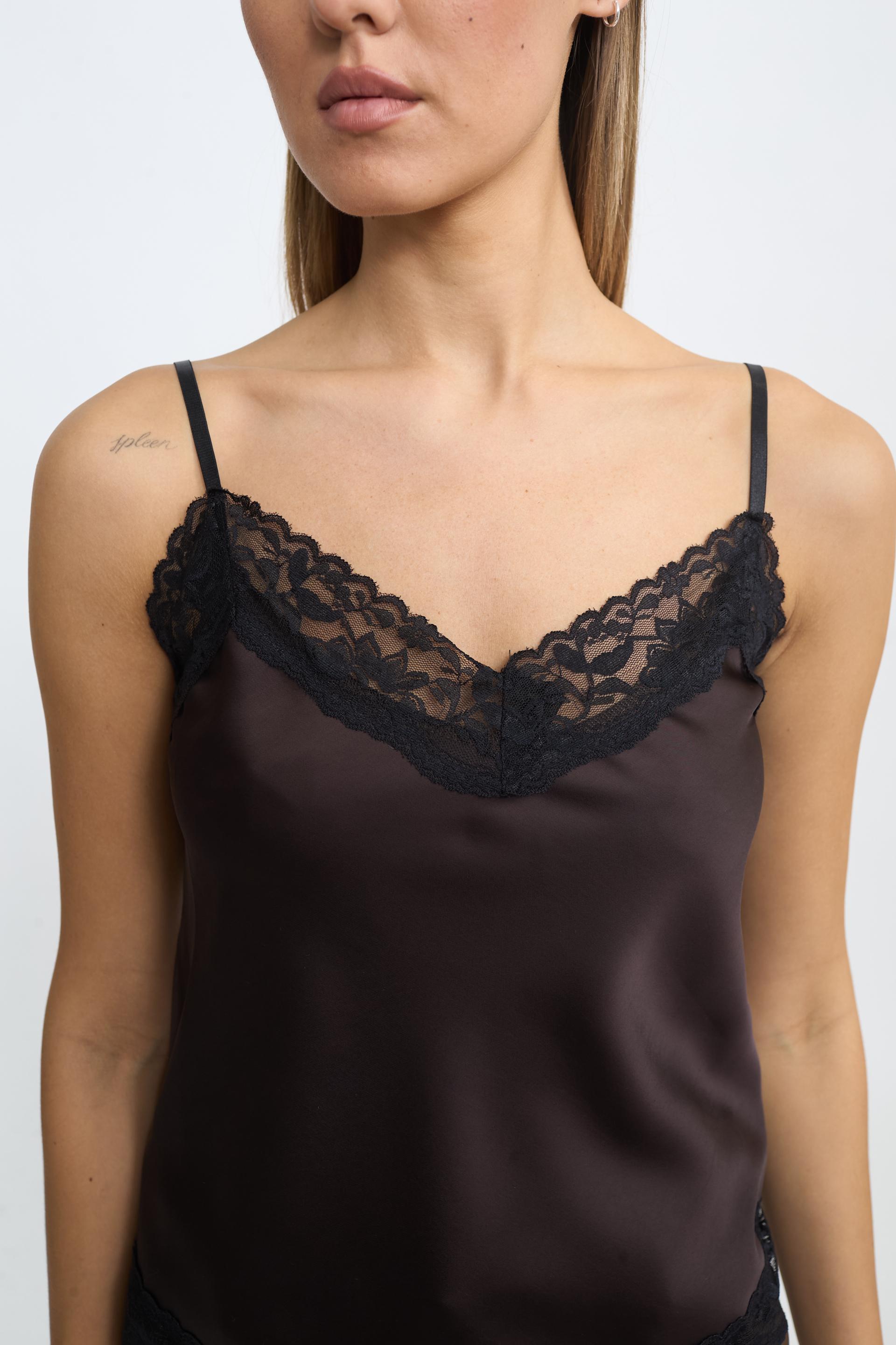 Top in raso con bretelline regolabili e dettagli pizzo su scollo e orlo. | ||