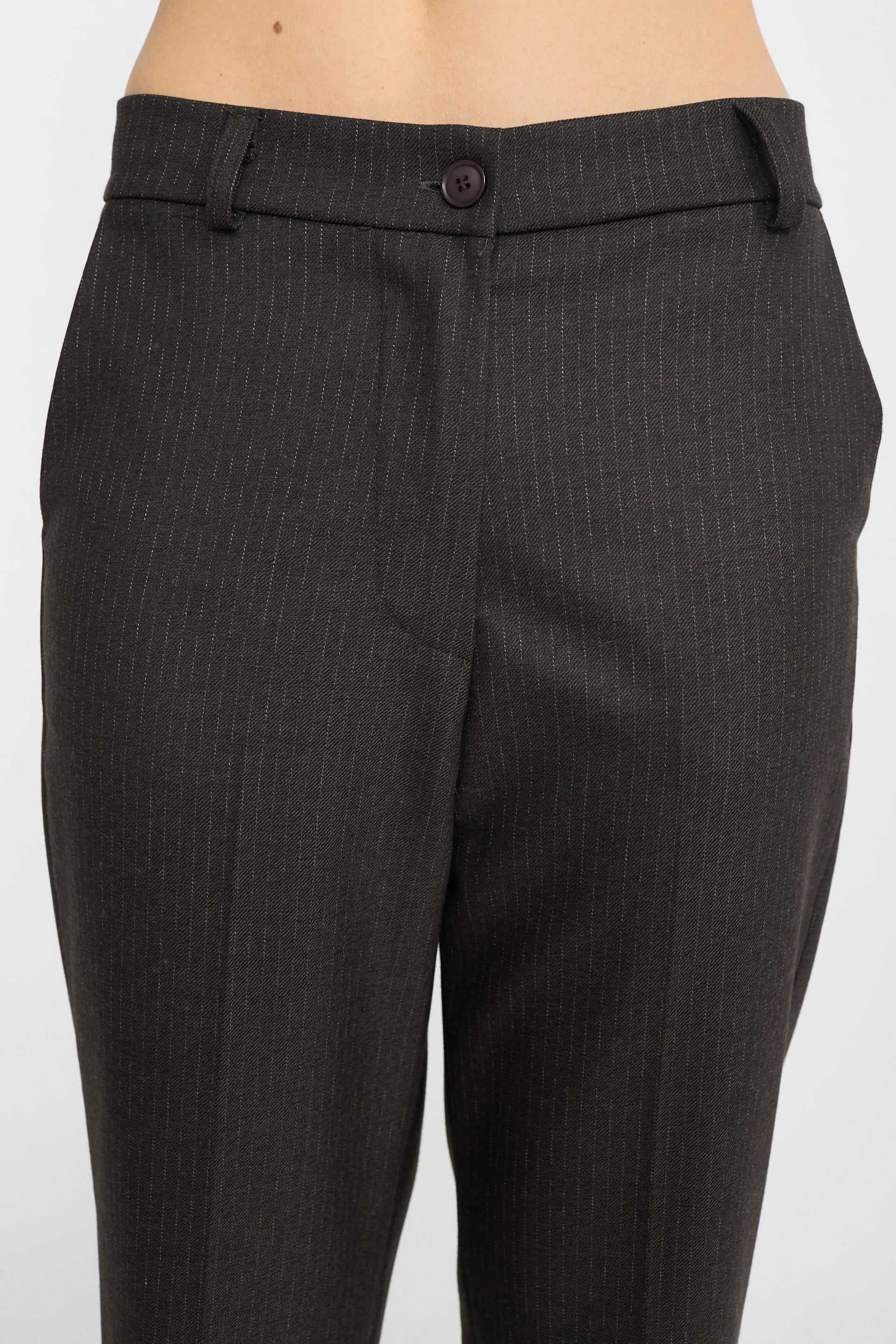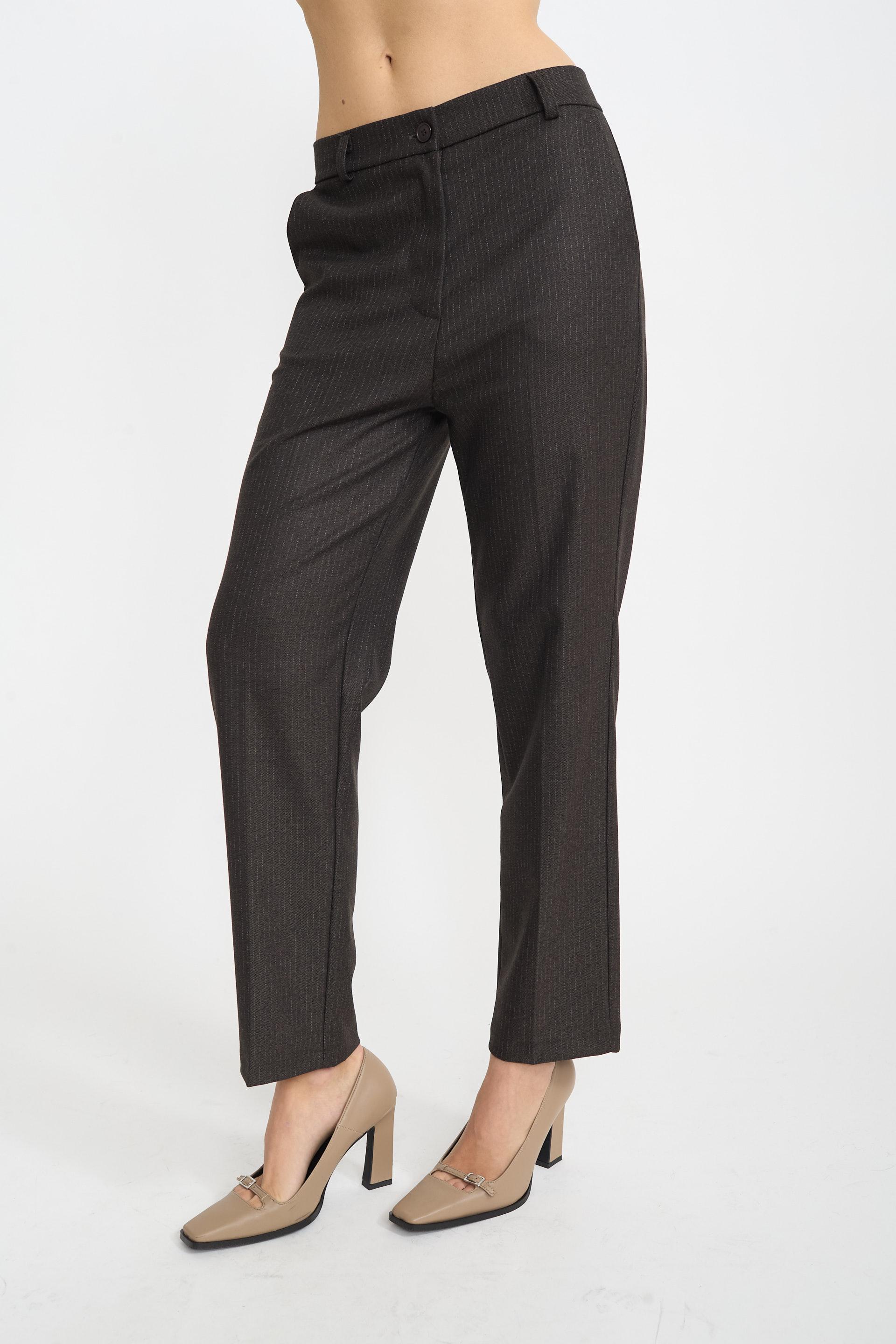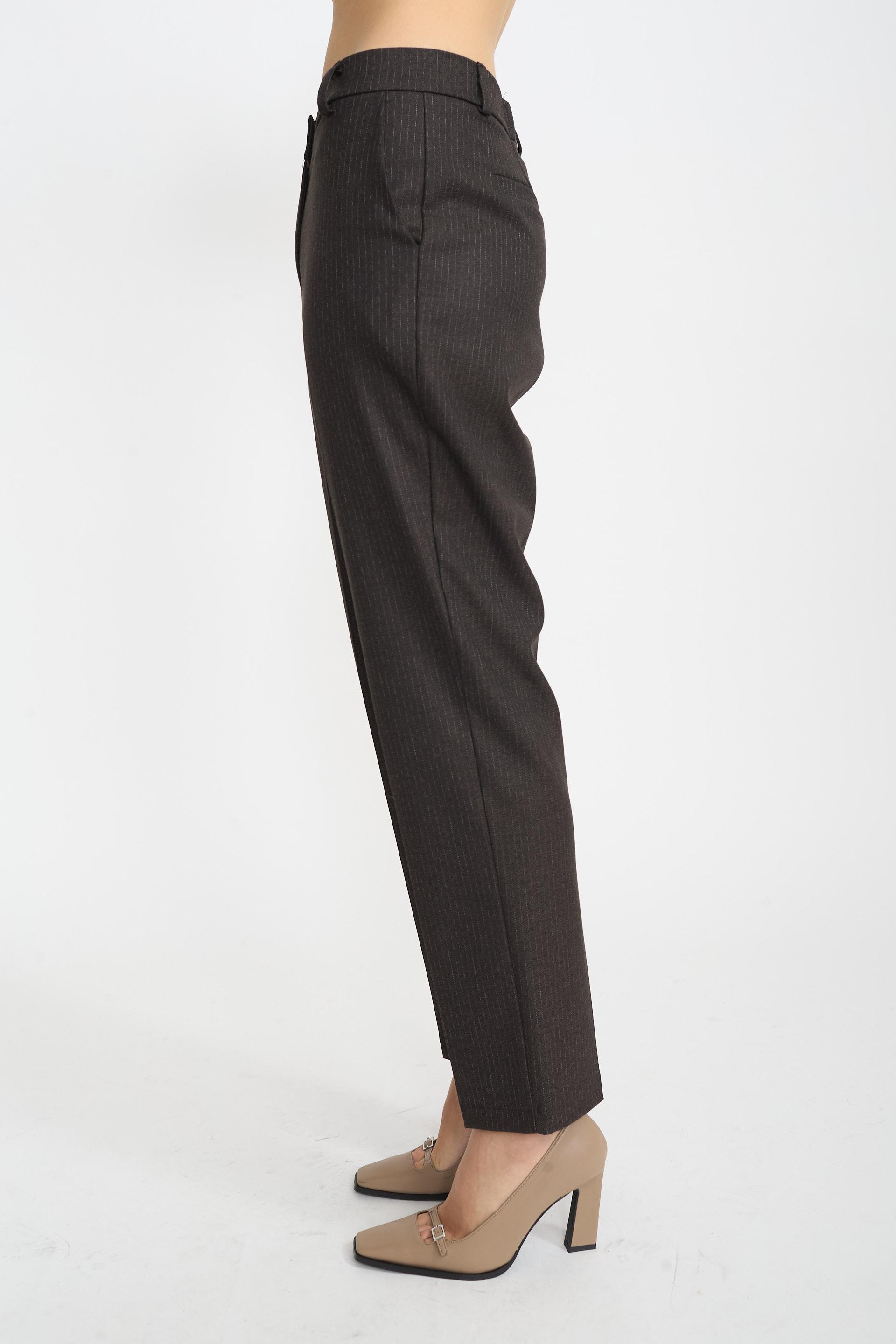| Pantalone modello uomo gessato con tasche laterali e finte tasche posteriori a filetto. Passanti in vita e chiusura tramite bottone e cerniera. | ||