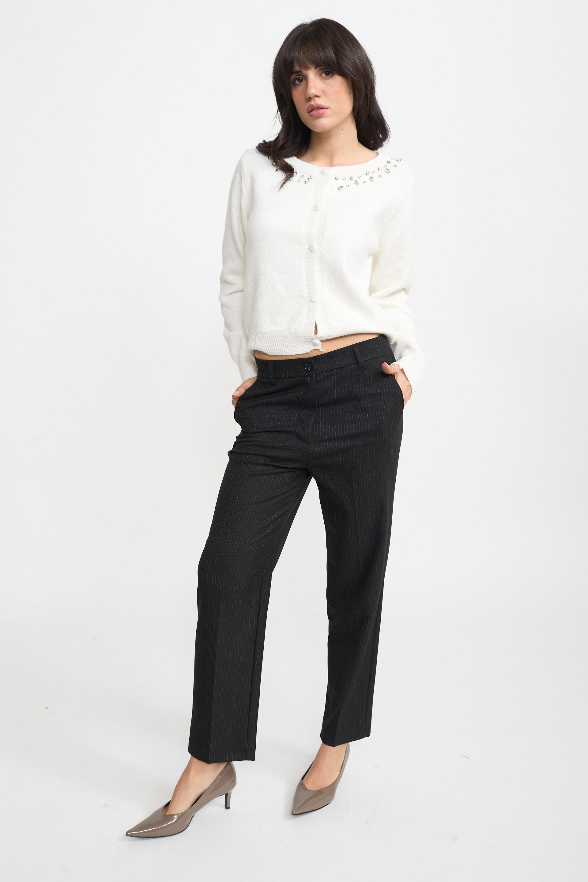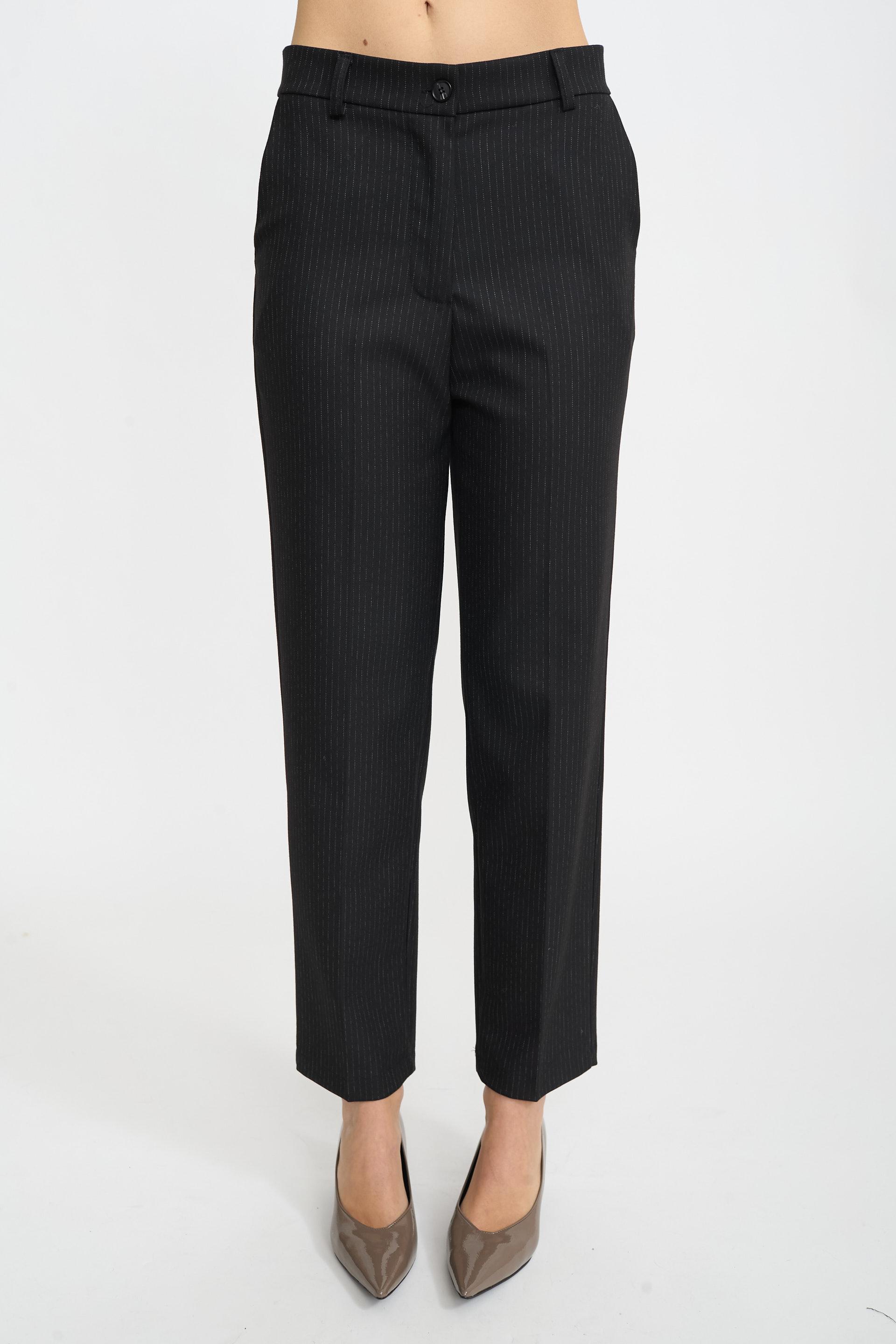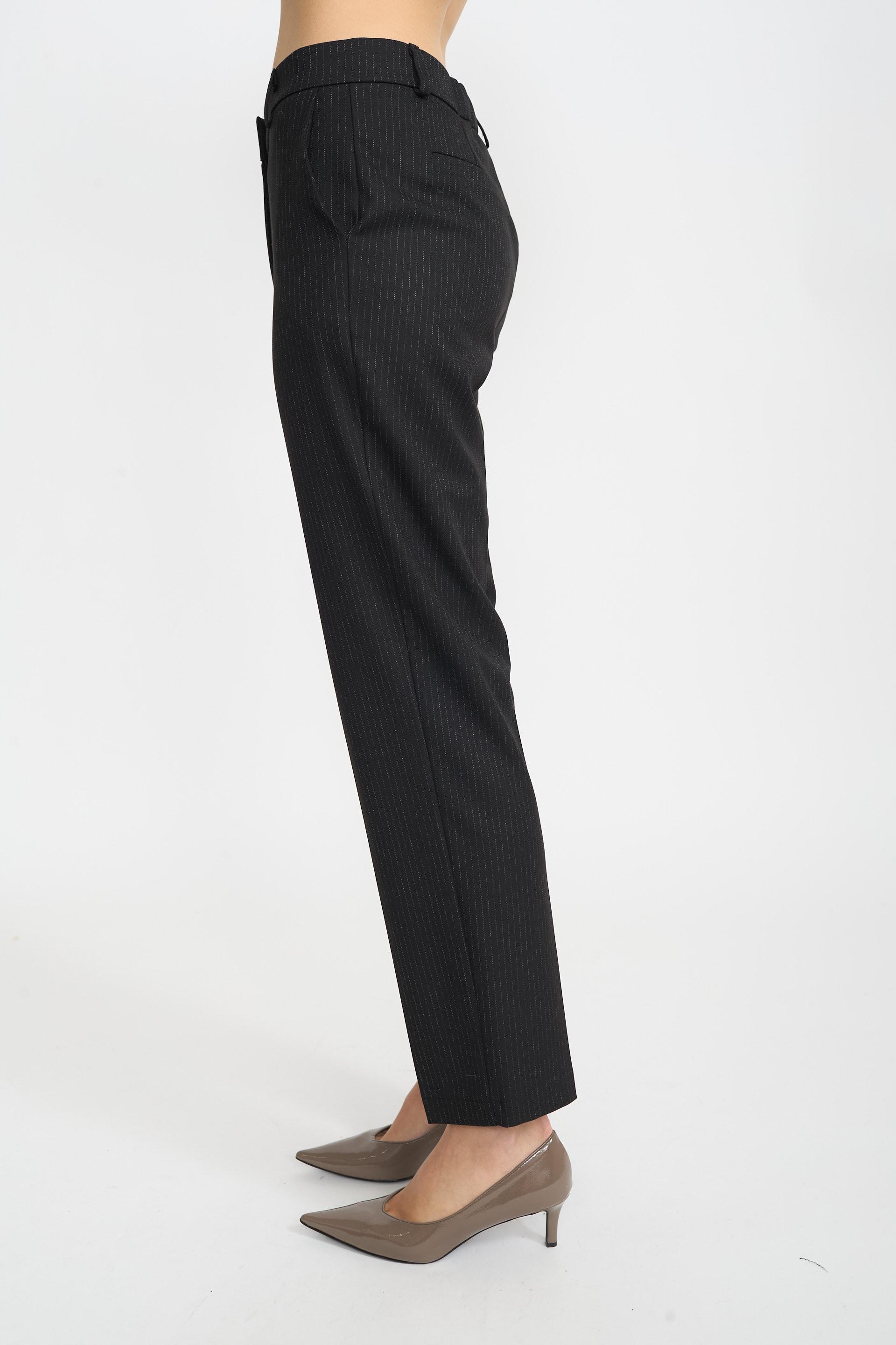 | Pantalone modello uomo gessato con tasche laterali e finte tasche posteriori a filetto. Passanti in vita e chiusura tramite bottone e cerniera. | ||