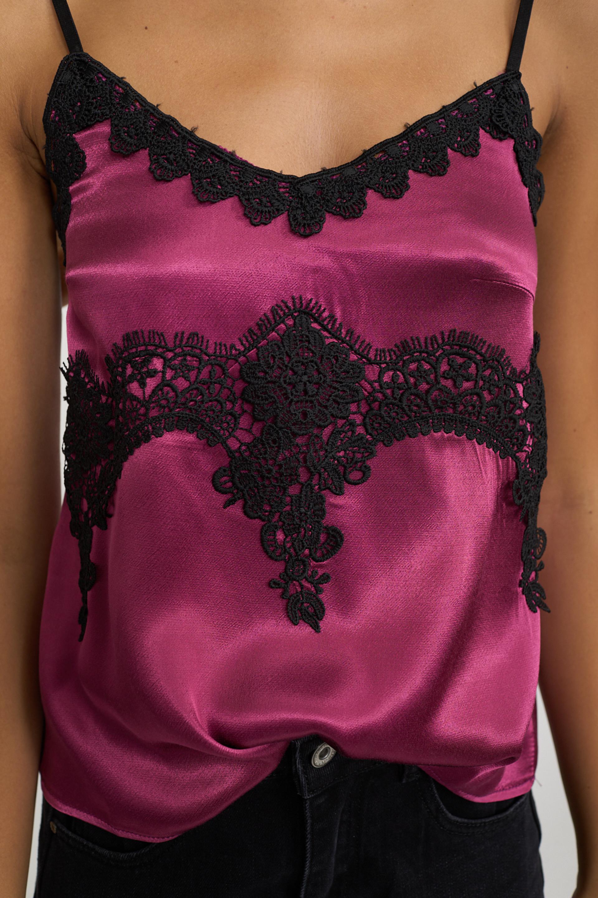 | Top in raso di viscosa con dettaglio frontale di inserti in pizzo. Bretelline regolabili. elastico posteriore e orlo leggermente asimmetrico fronte-retro. | ||