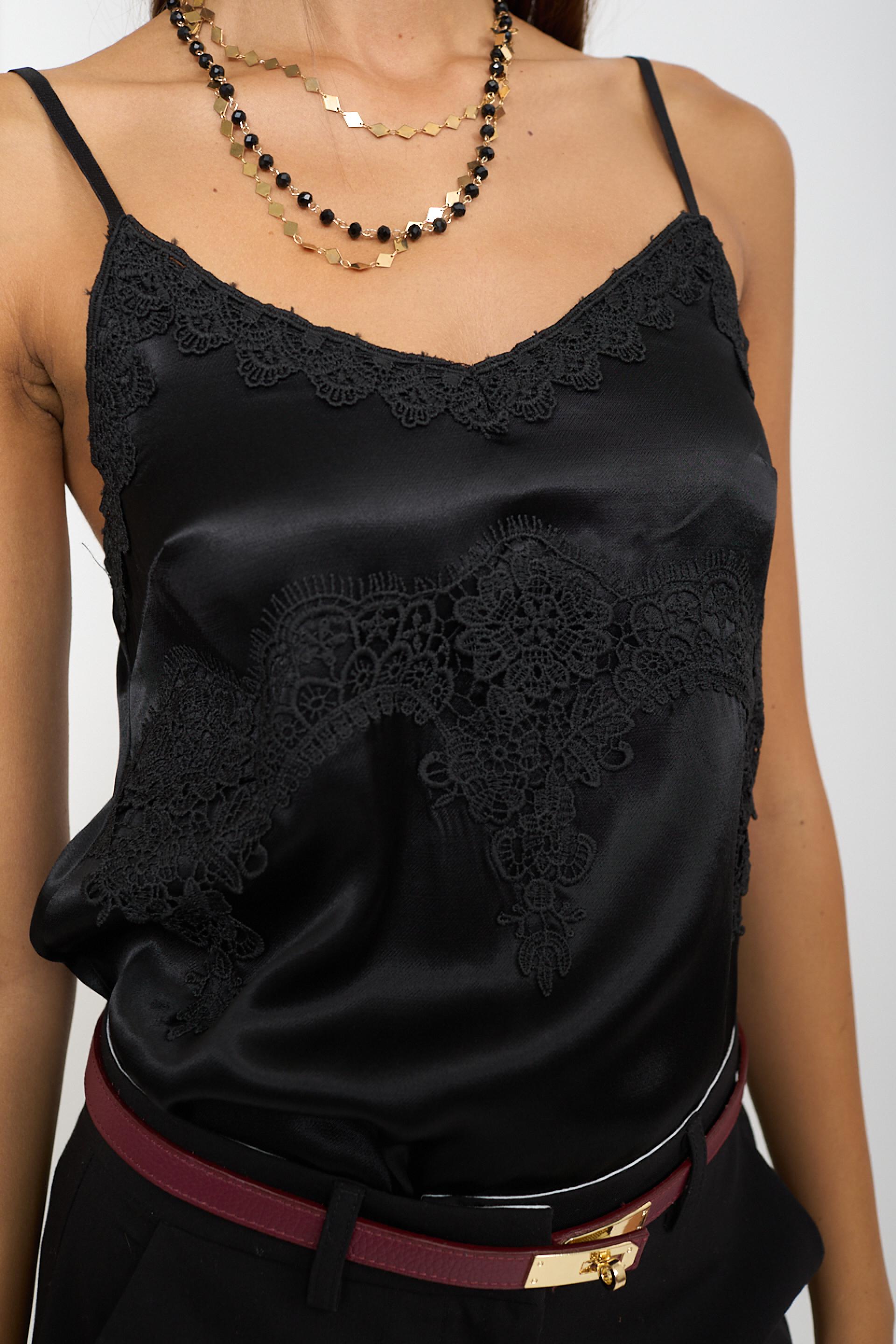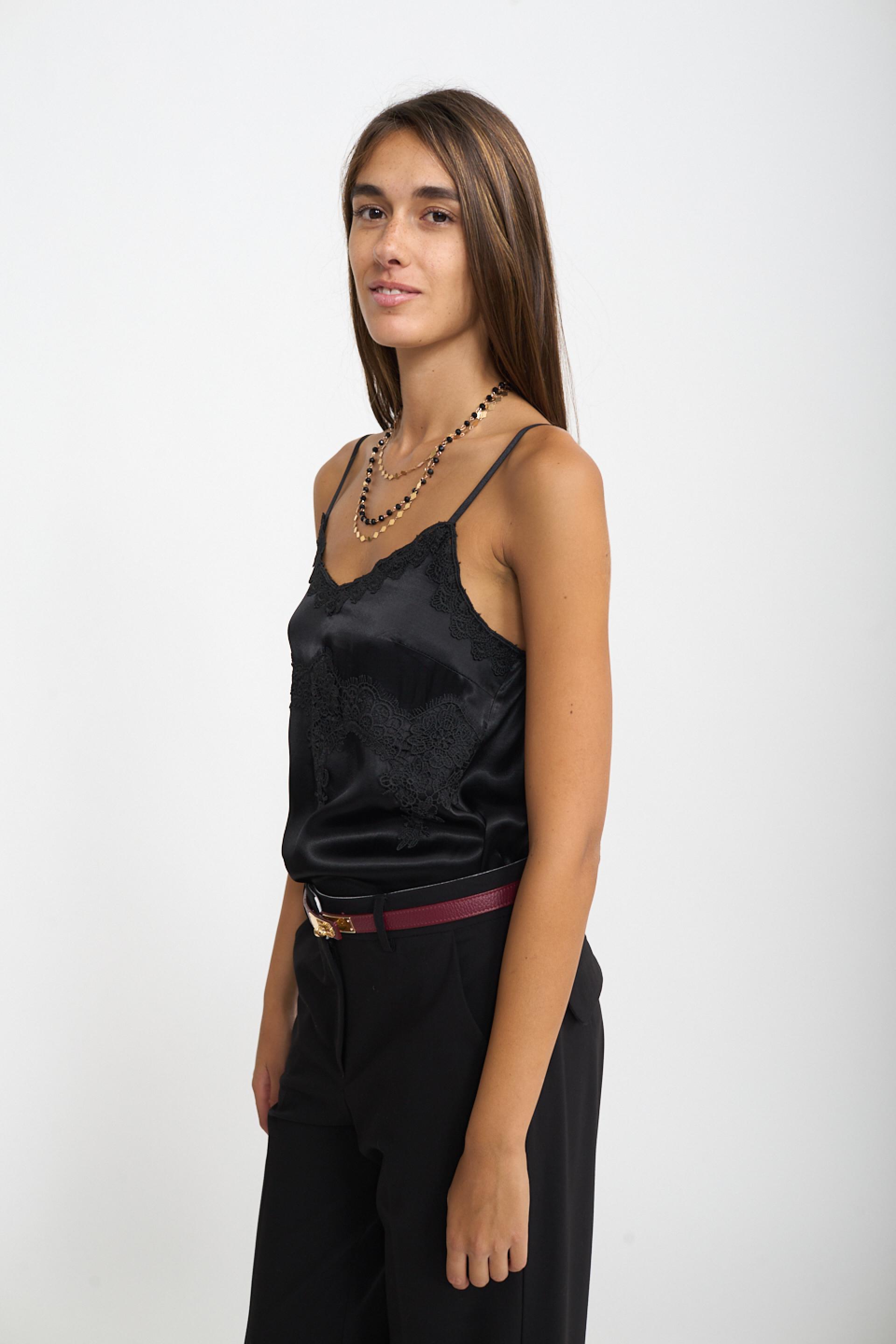 | Top in raso di viscosa con dettaglio frontale di inserti in pizzo. Bretelline regolabili. elastico posteriore e orlo leggermente asimmetrico fronte-retro. | ||