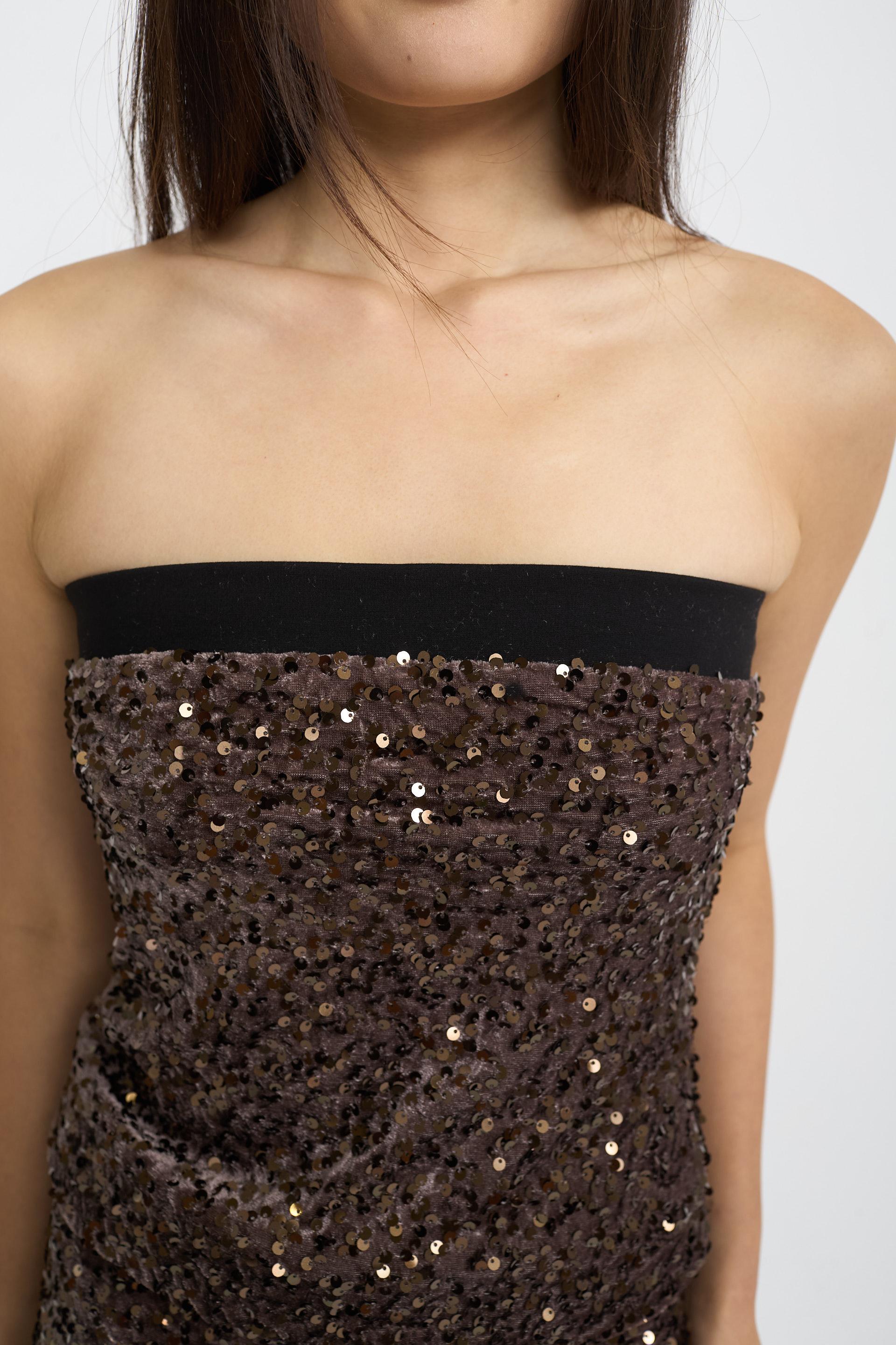 | Top fascia paillettes con fascia elastica su scollo e orlo. Fodera interna in viscosa. | ||