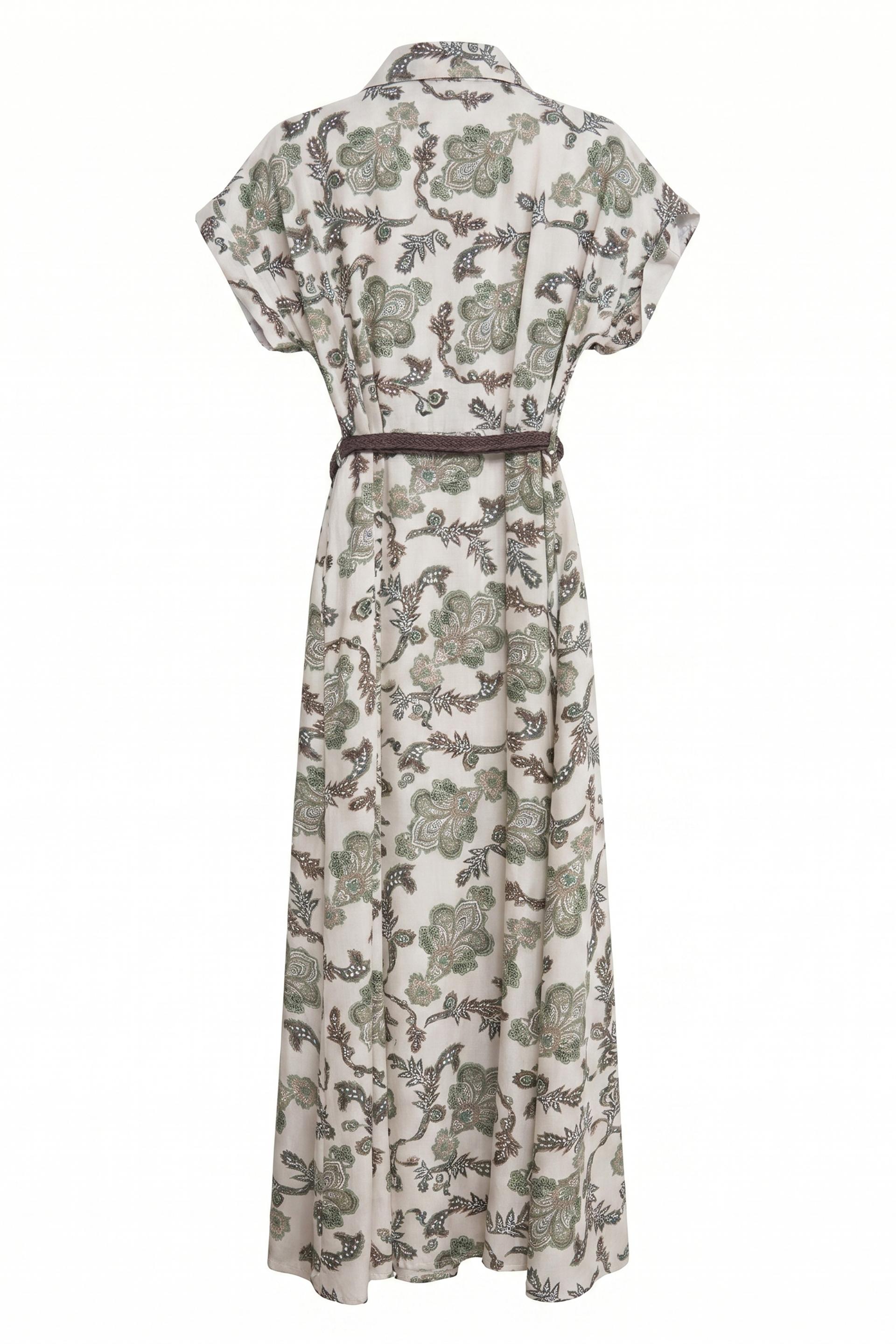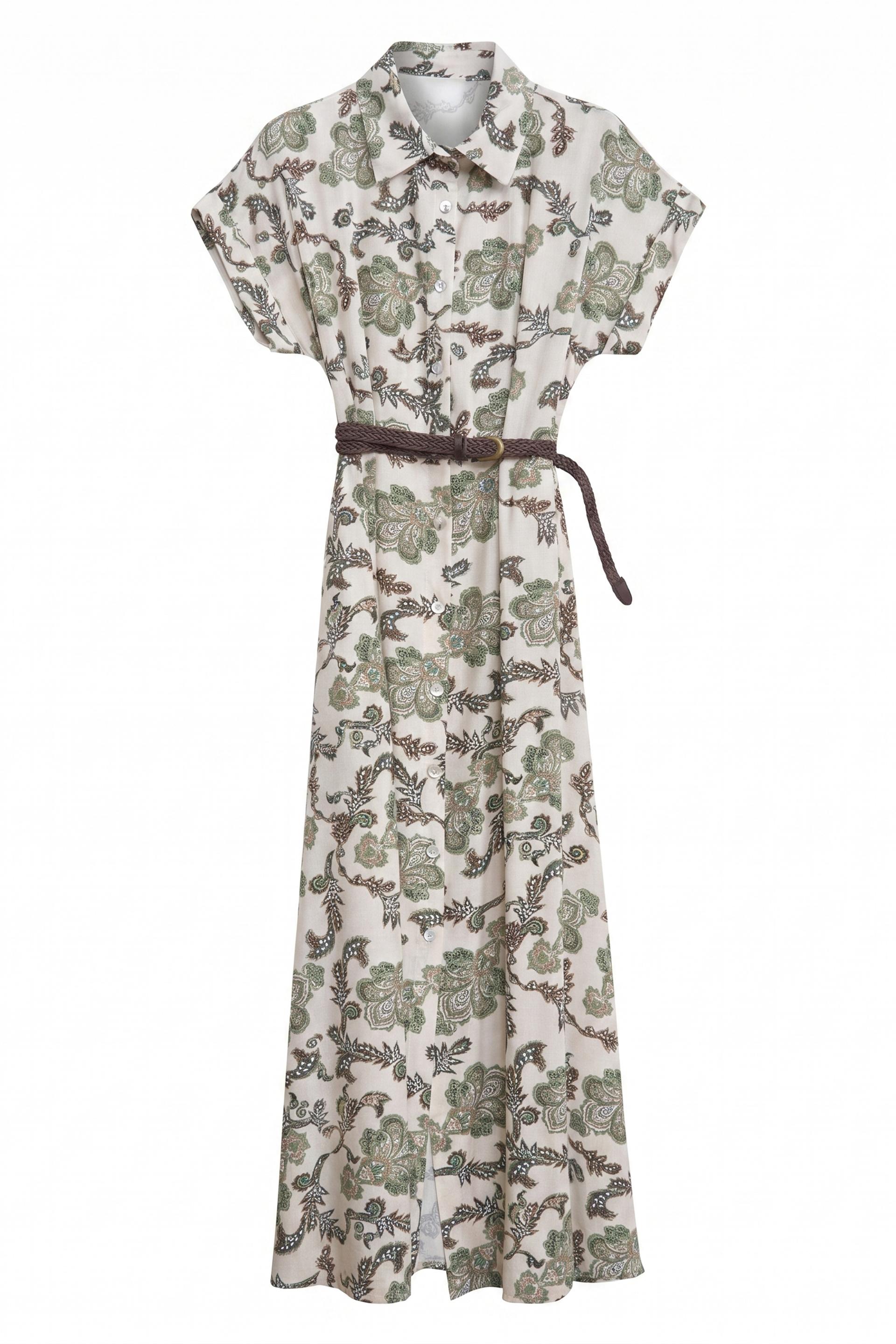 | Chemisier lungo a mezza manica in viscosa fantasia. Passanti i vita e cintina compresa. Chiusura centrale tramite bottoni. | ||