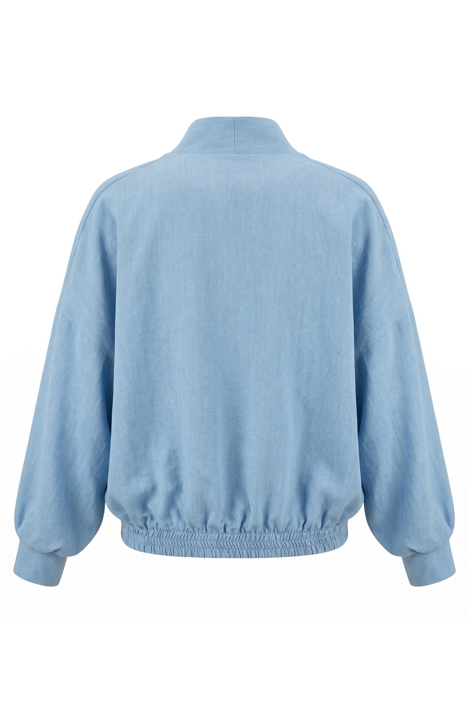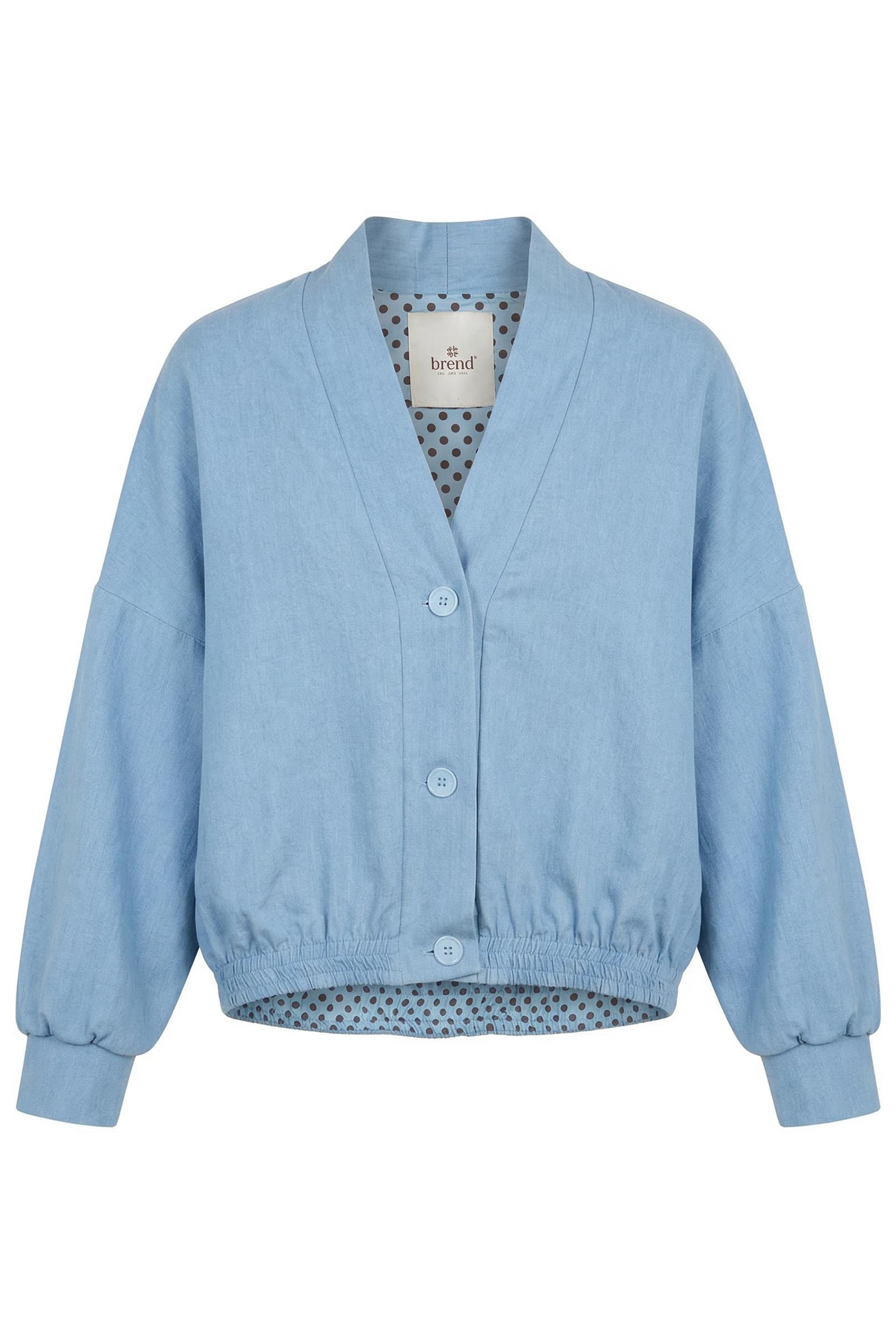 | Bomber 3 bottoni effetto denim con manica scesa ed elastico in vita. Dettaglio di fodera fantasia pois. | ||