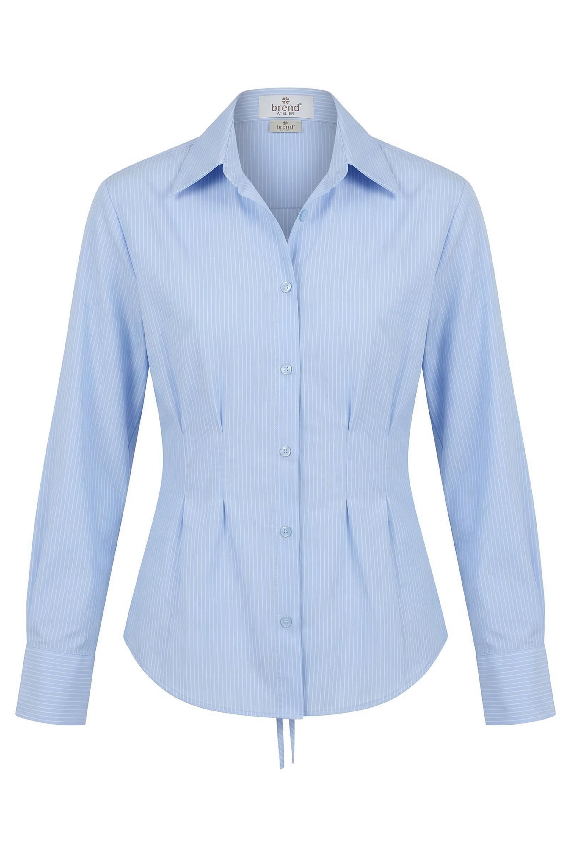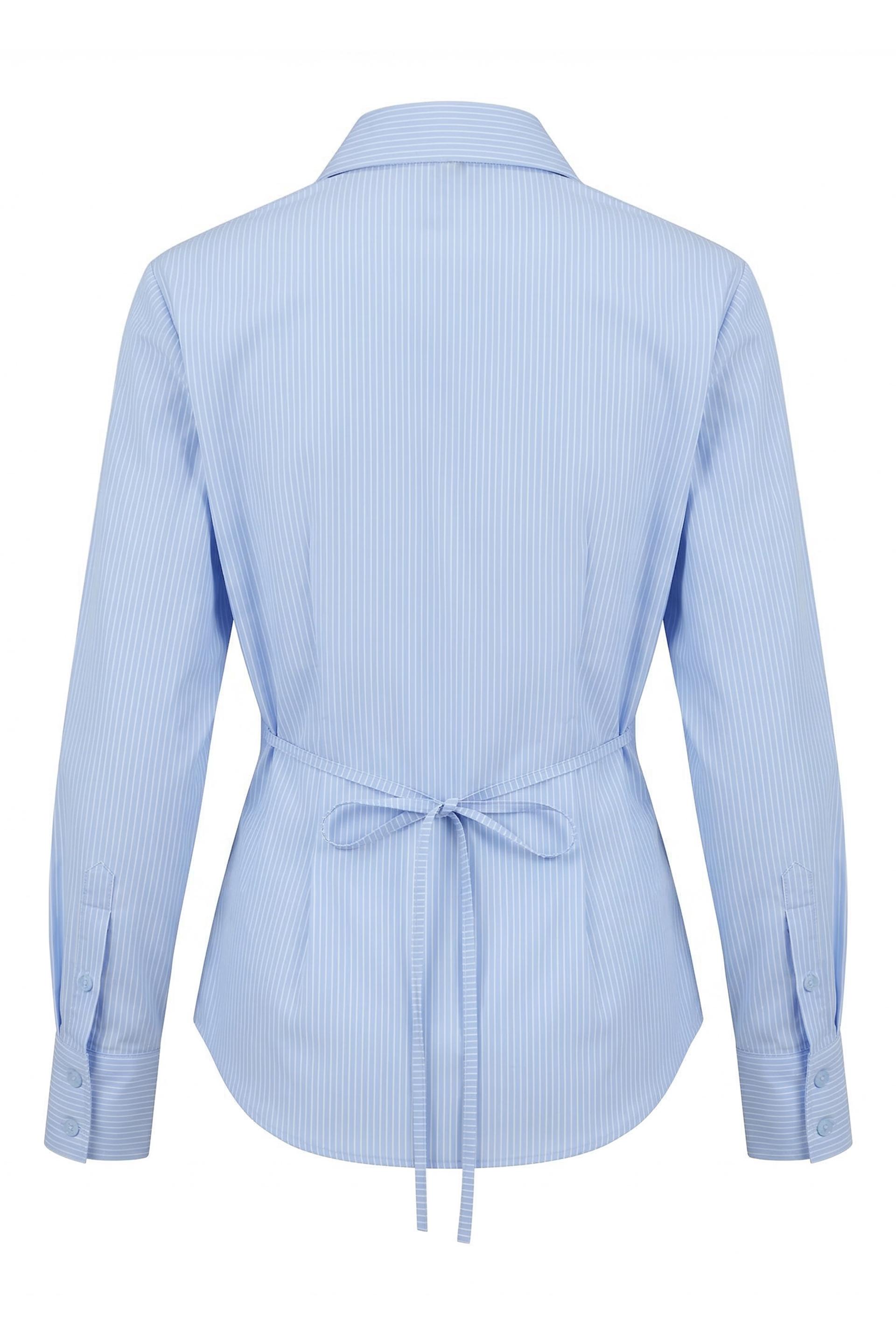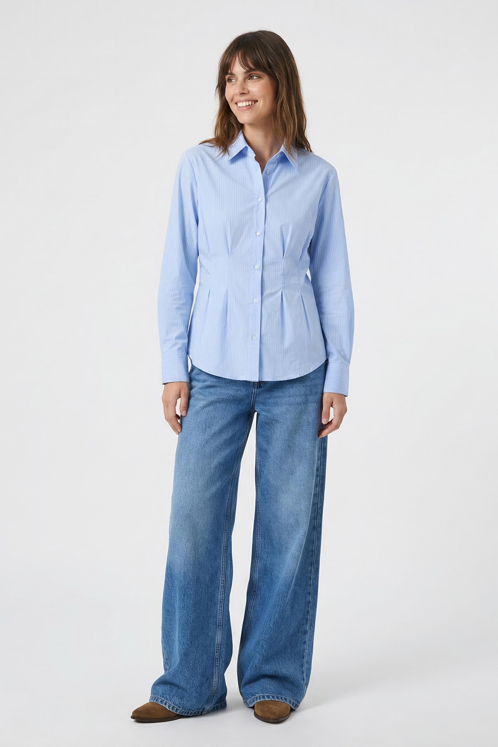 | Camicia in cotone rigato con cugni in vita e spalline imbottite. Dettaglio di laccio posteriore. Chiusura tramite bottoni tono su tono. | ||
