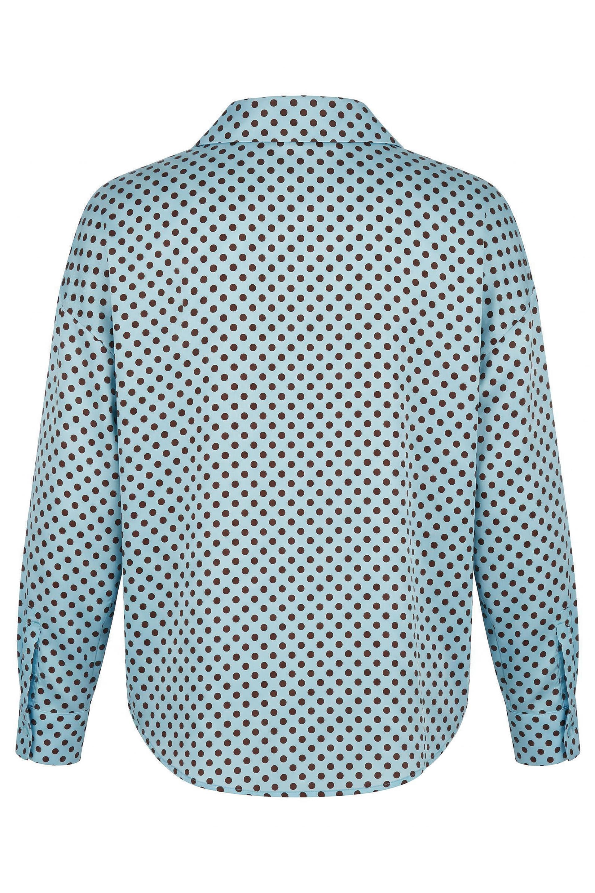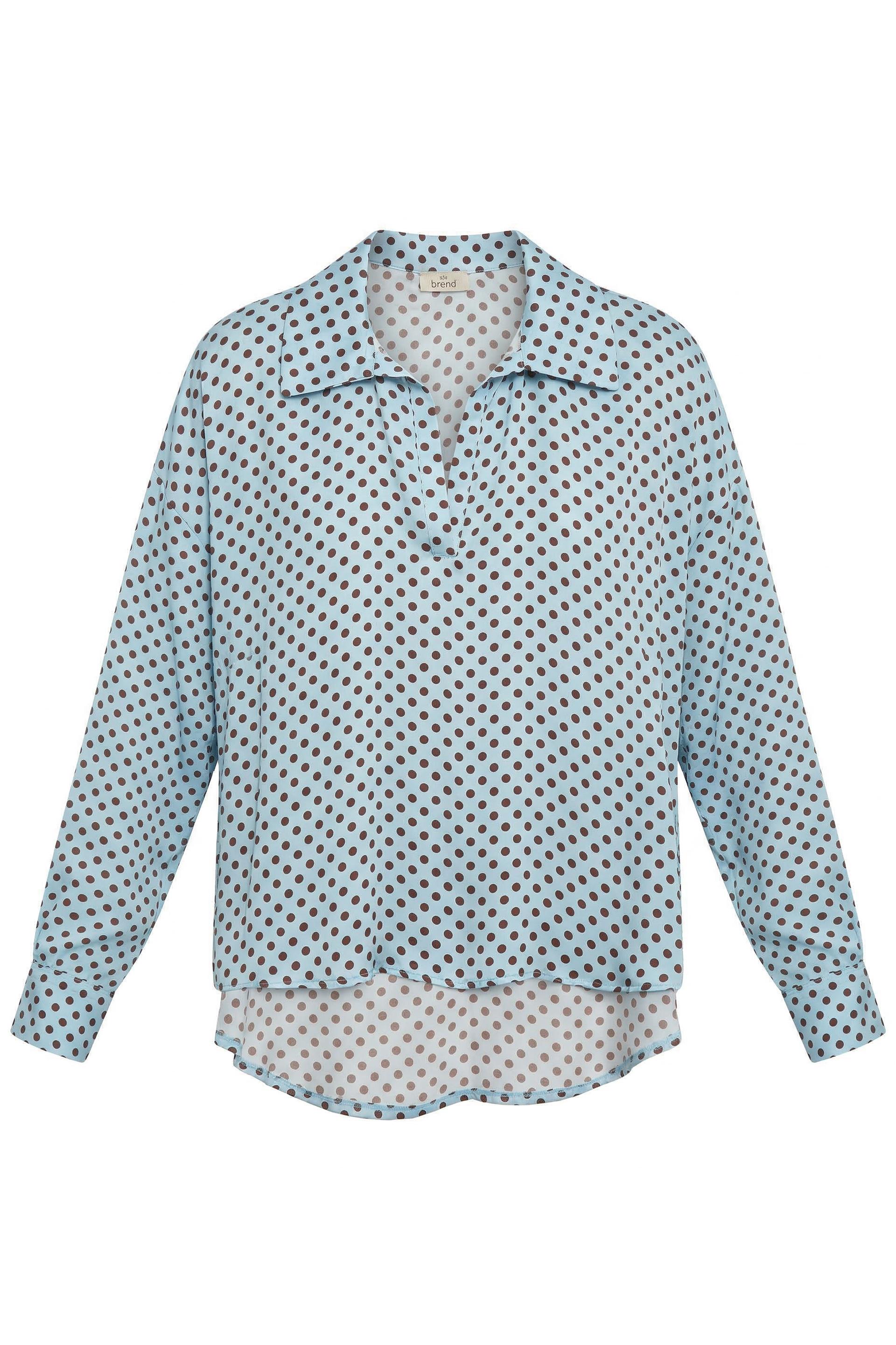 | Camicia modello polo in viscosa fantasia pois. Elastico ai polsi e orlo asimmetrico fronte-retro. | ||