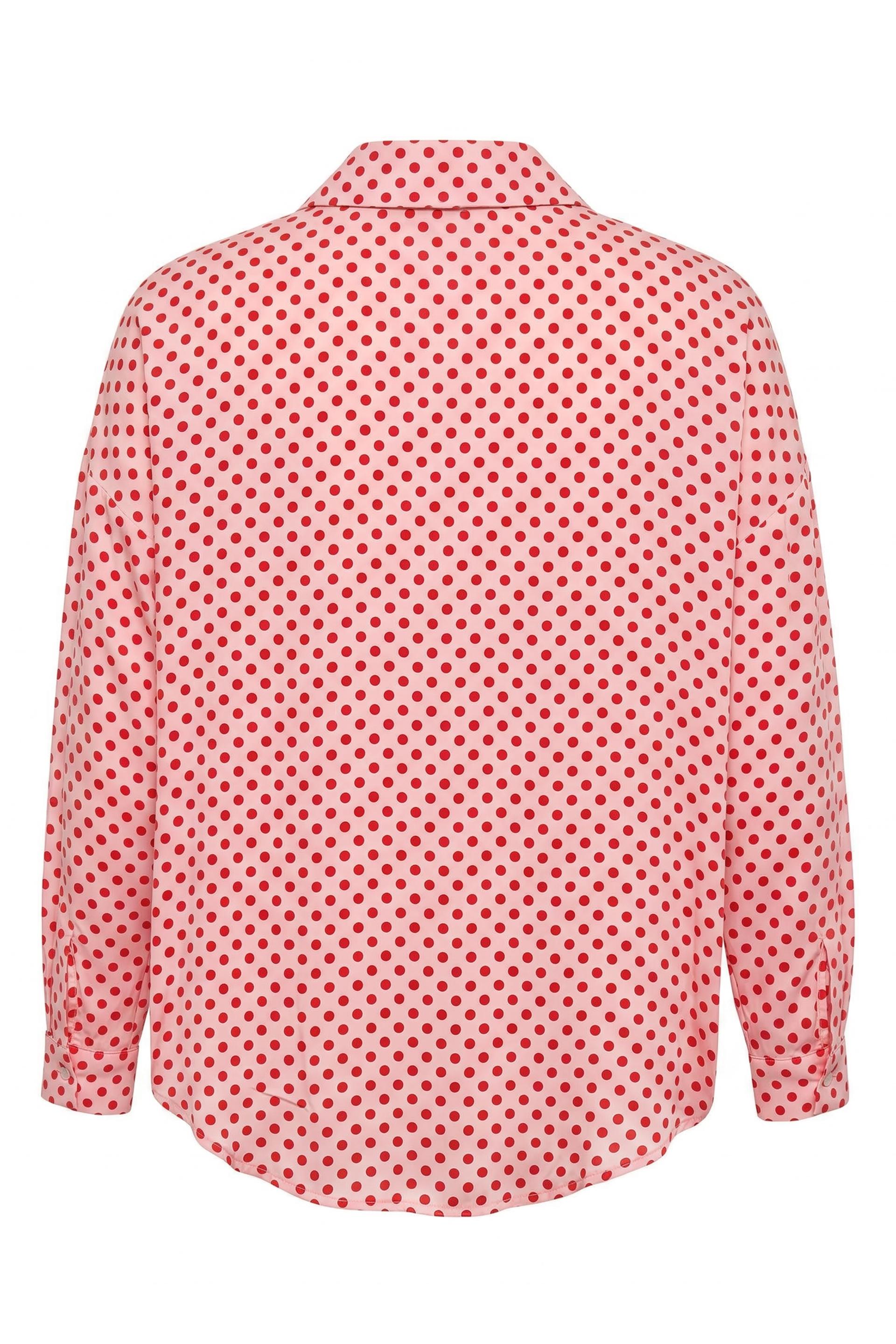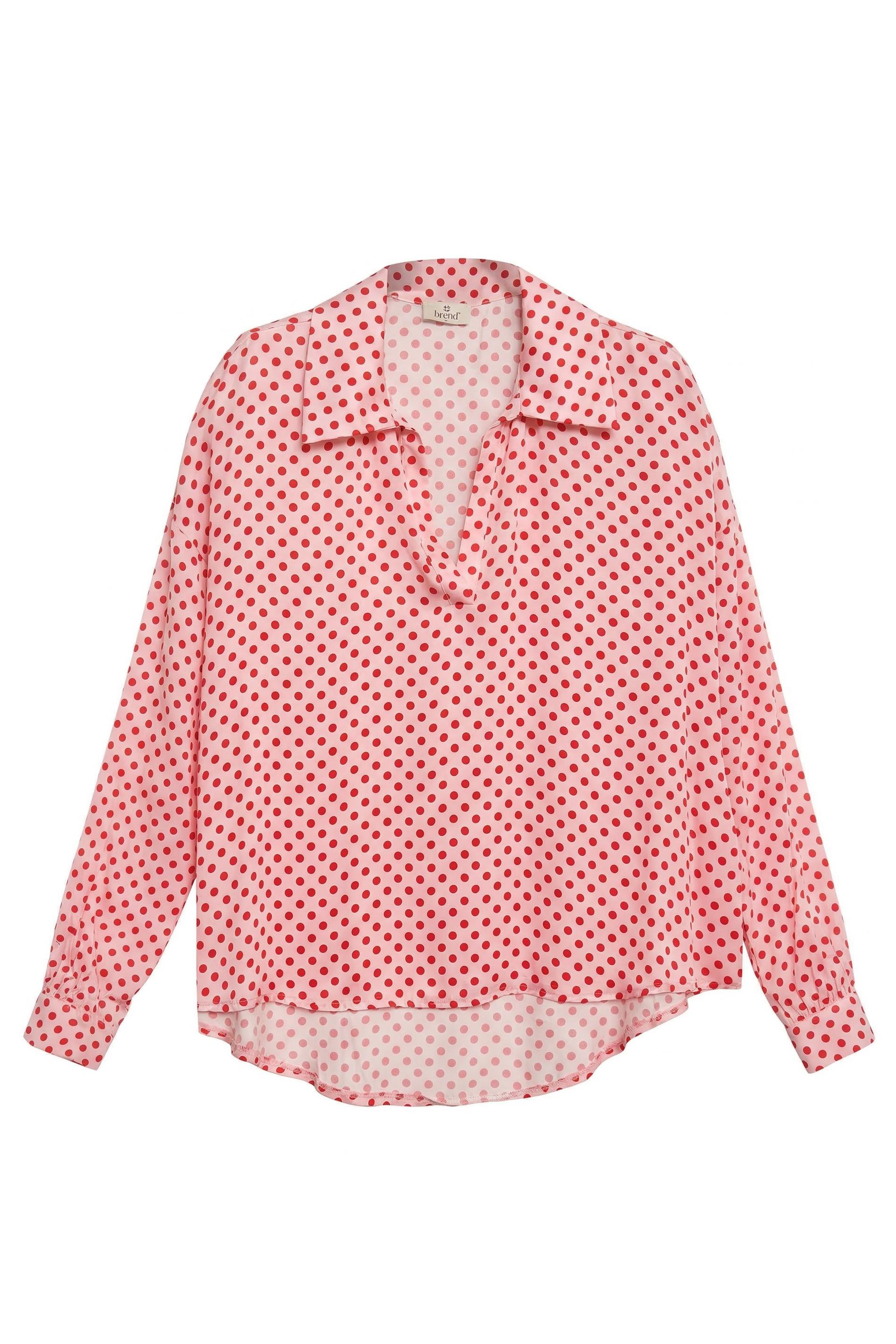 | Camicia modello polo in viscosa fantasia pois. Elastico ai polsi e orlo asimmetrico fronte-retro. | ||