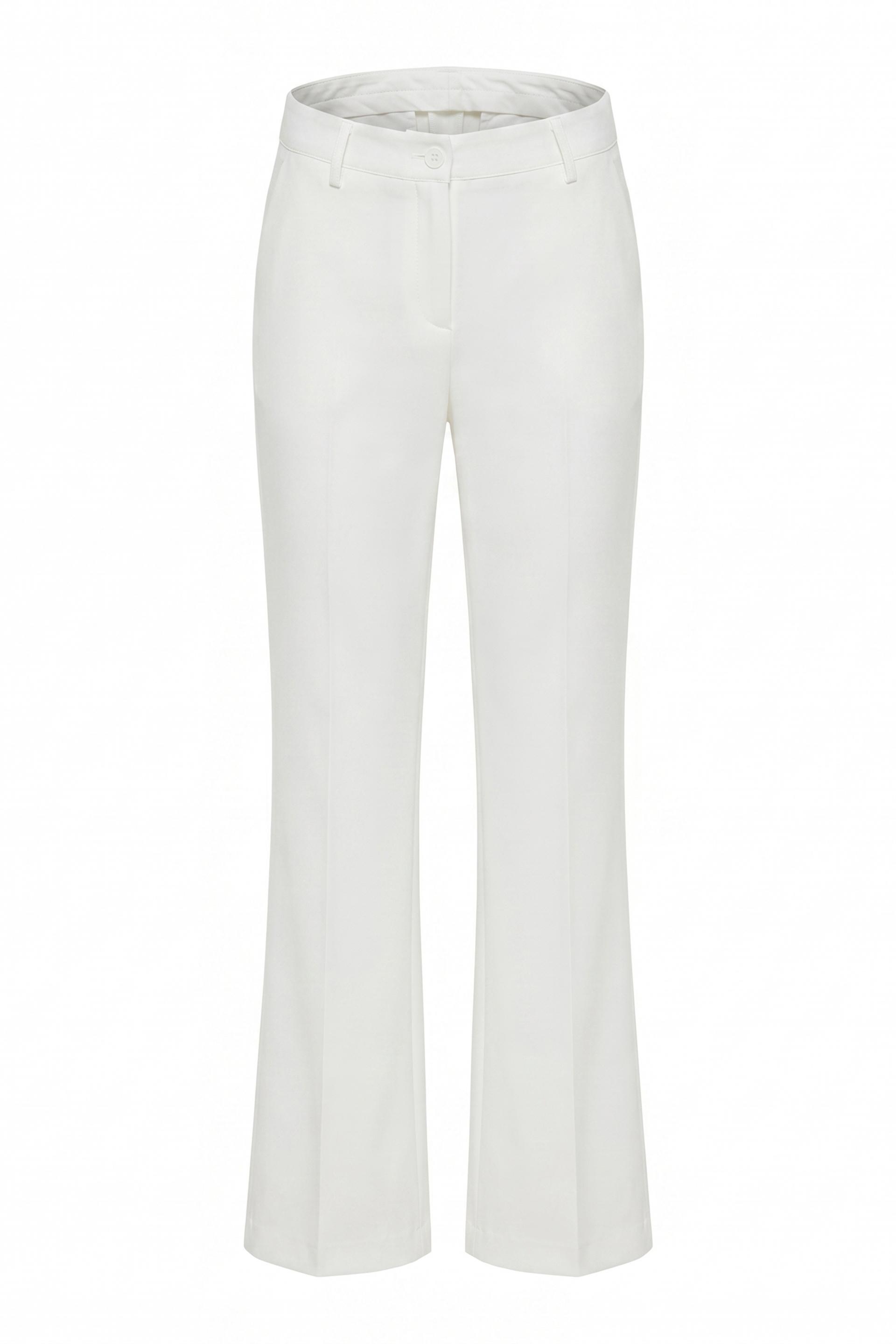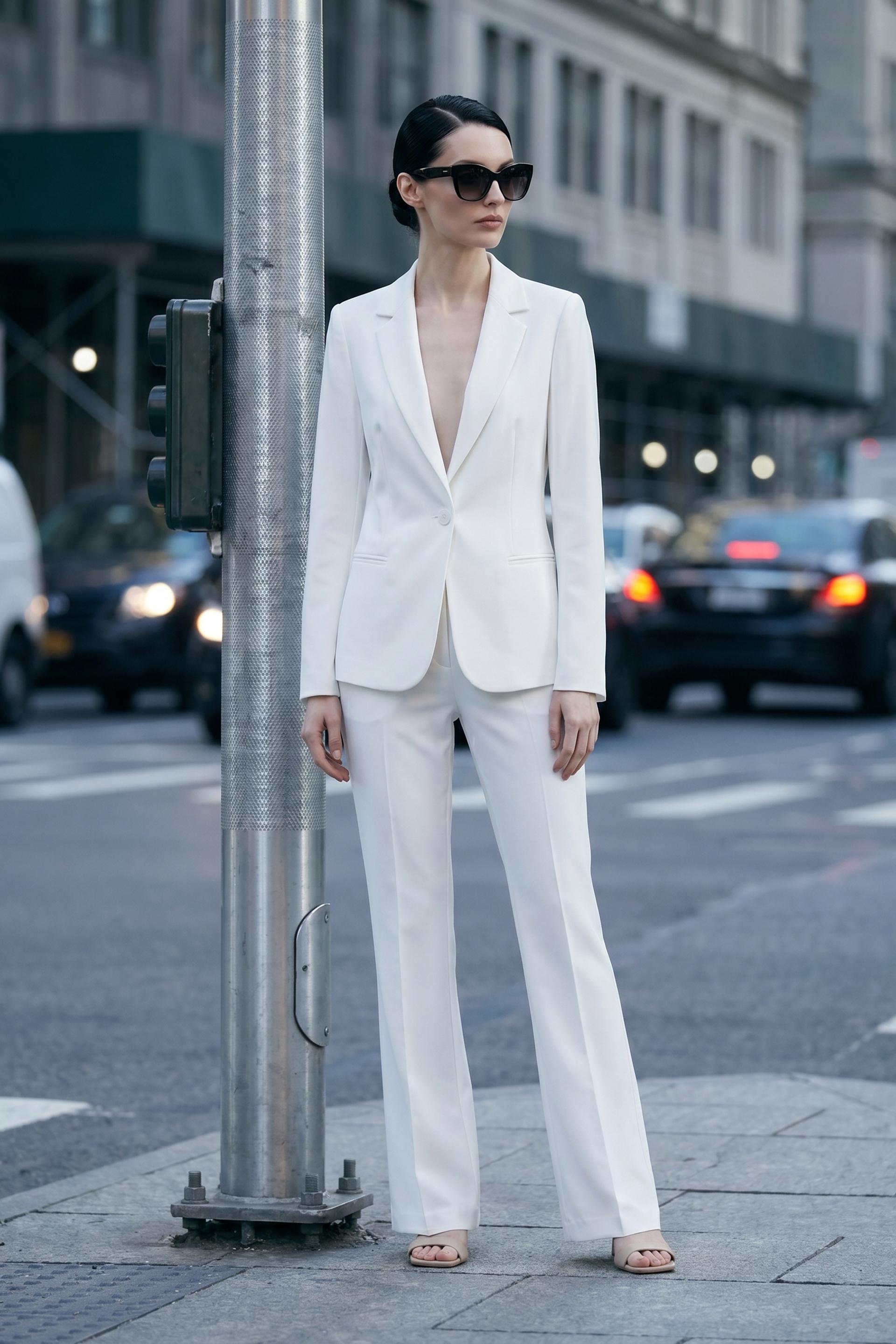 | Completo in tessuto tecnico giacca avvitata 1 bottone con finte tasche a filetto. Spalline imbottite e fodera interna tono su tono. Pantalone flare con tasche laterali, passanti in vita e chiusura tramite bottone e cerniera. | ||
