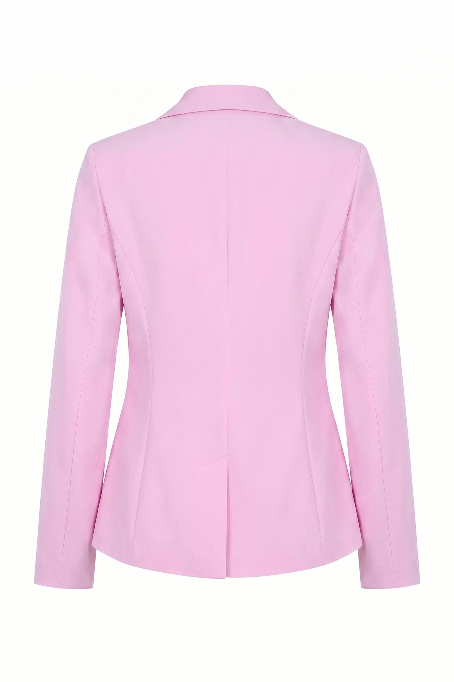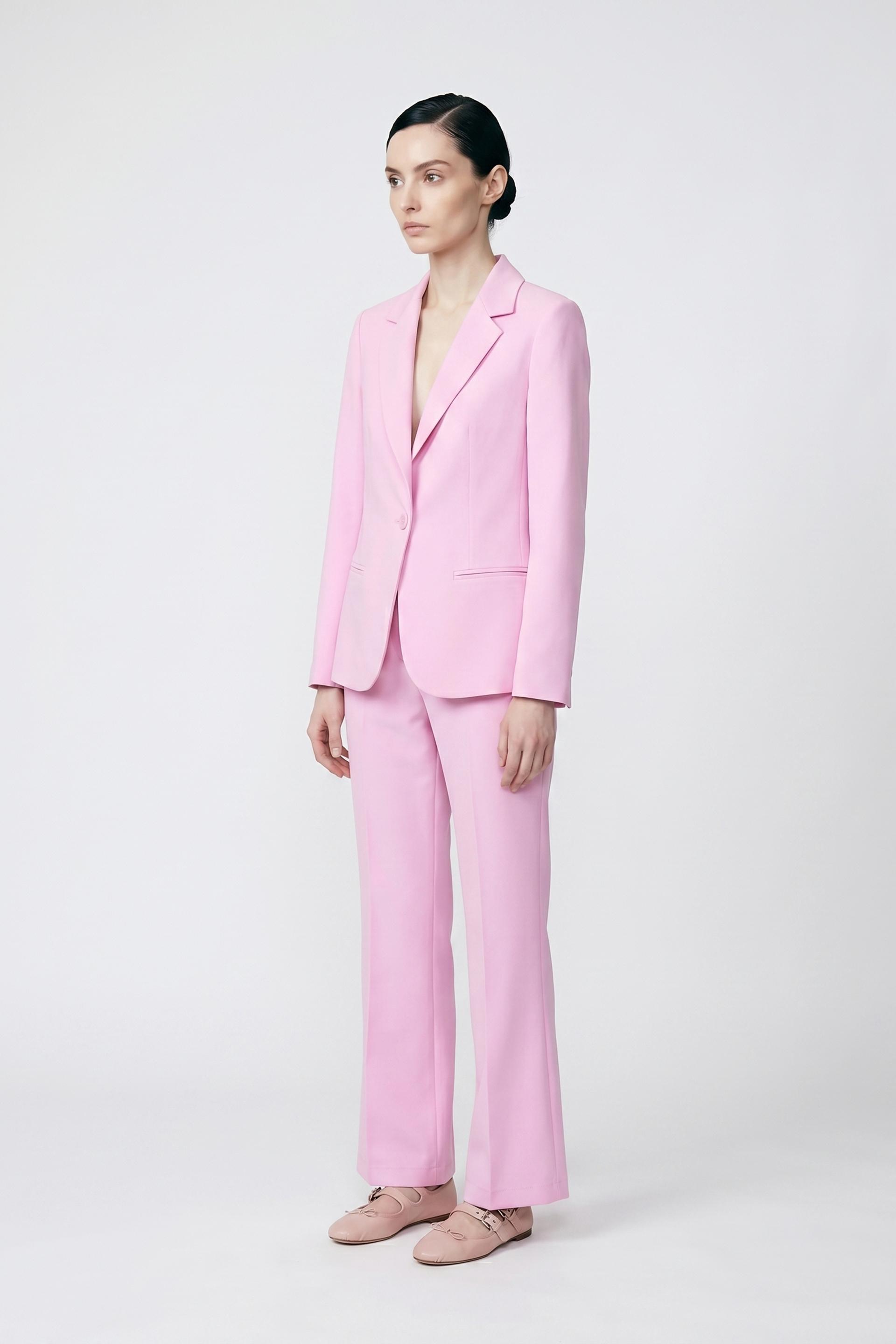 | Completo in tessuto tecnico giacca avvitata 1 bottone con finte tasche a filetto. Spalline imbottite e fodera interna tono su tono. Pantalone flare con tasche laterali, passanti in vita e chiusura tramite bottone e cerniera. | ||