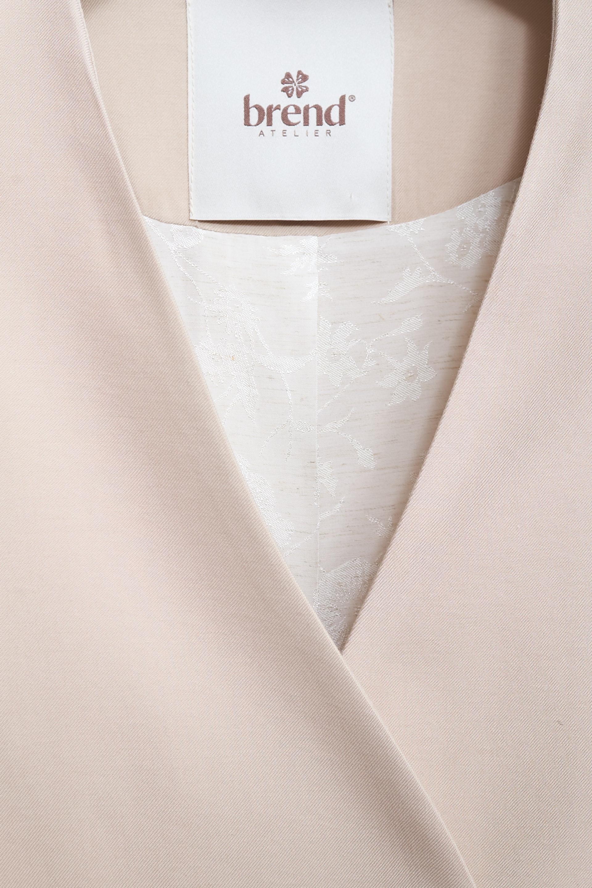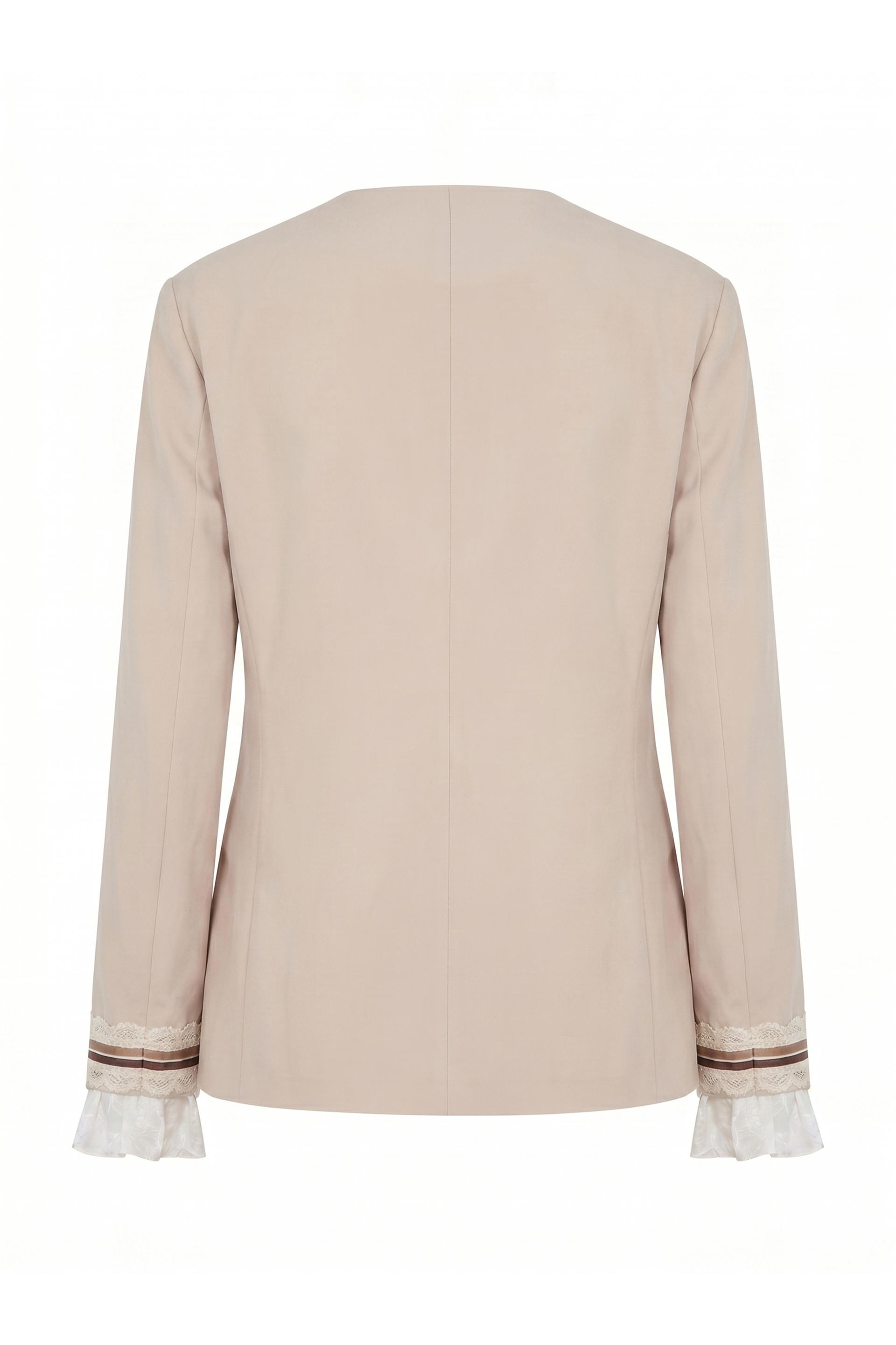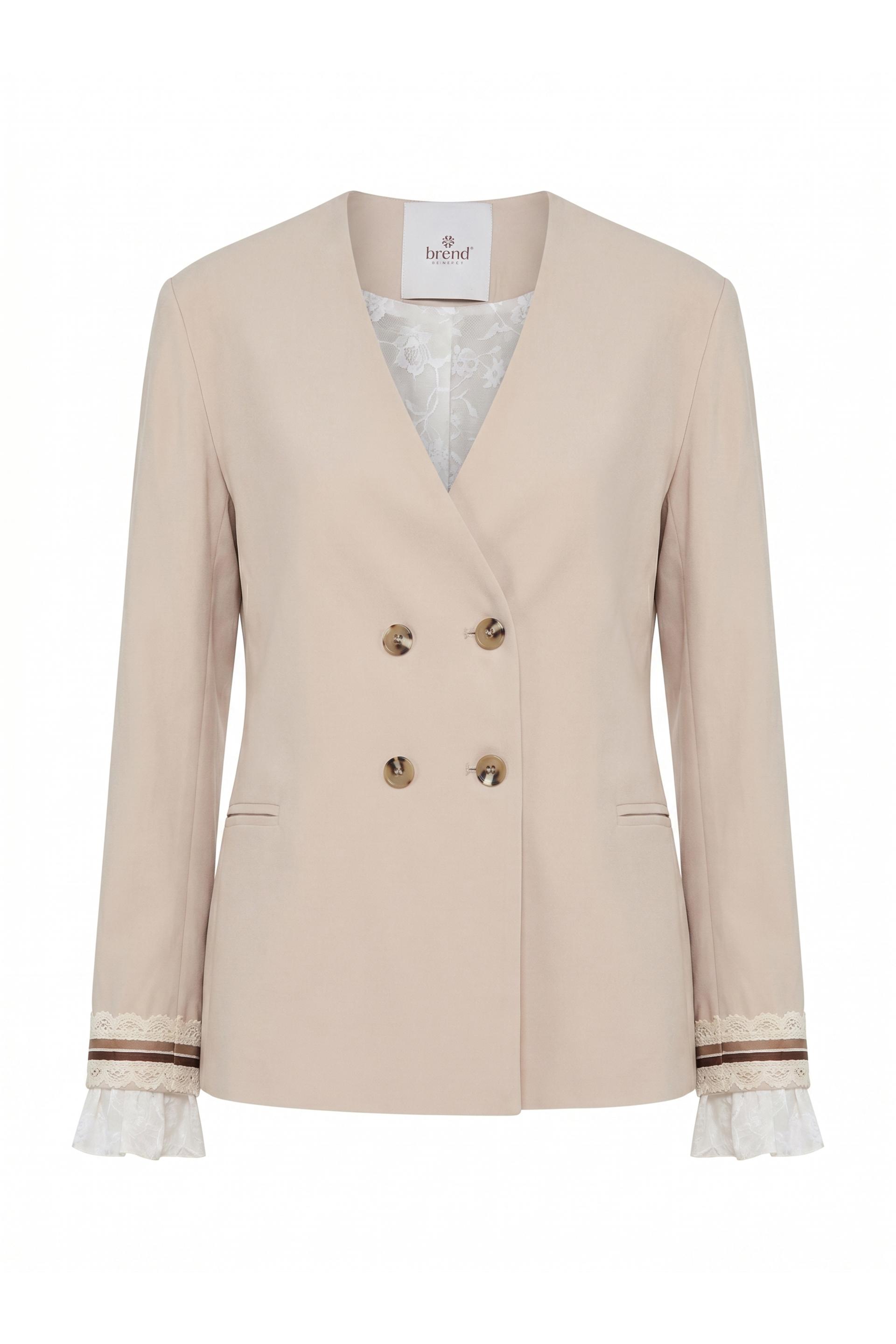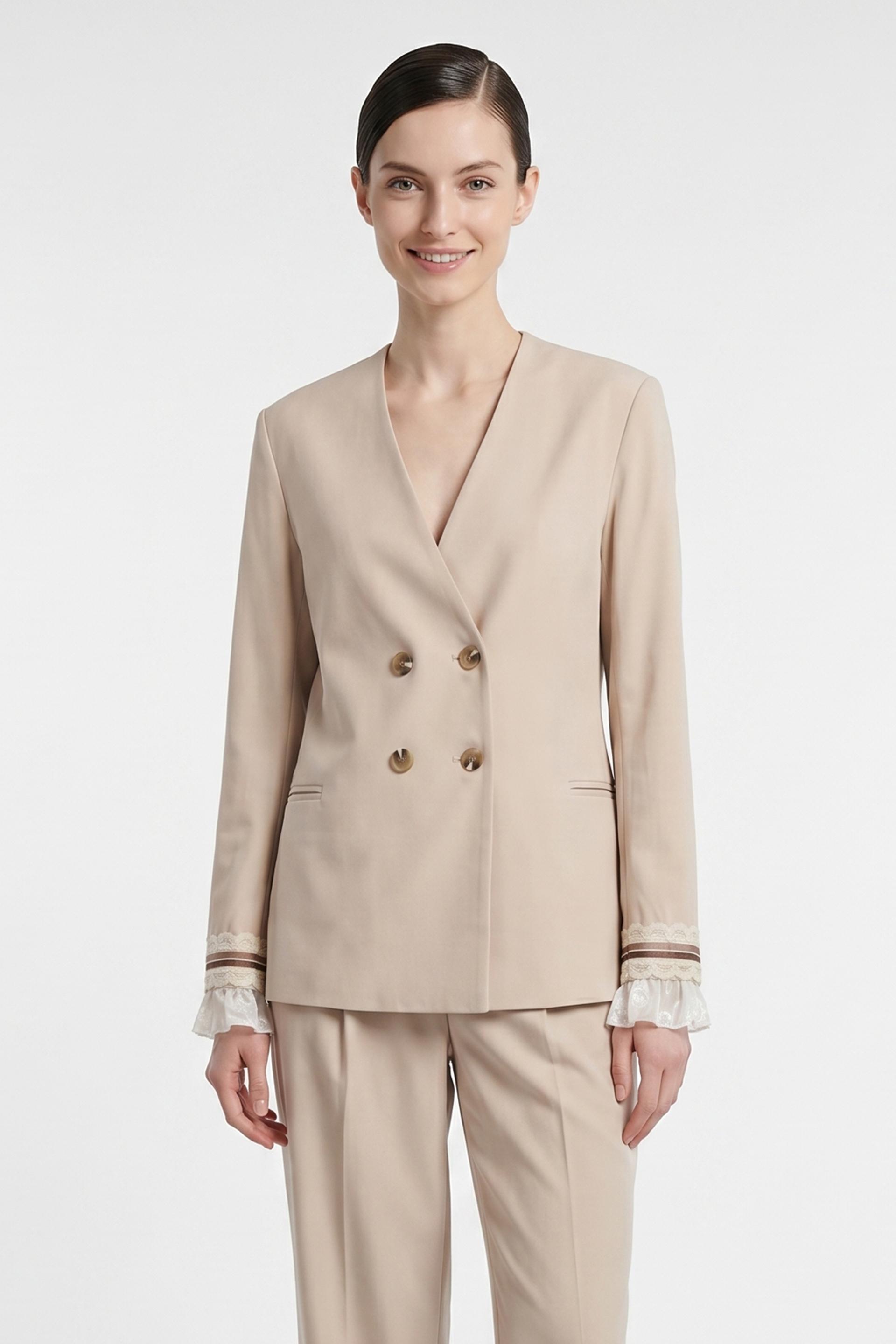 | Giacca doppio petto con finte tasche a filetto e dettaglio di polsini con passamaneria e fascia arricciata in tessuto camicia. Fodera interna doppio tessuto. | ||