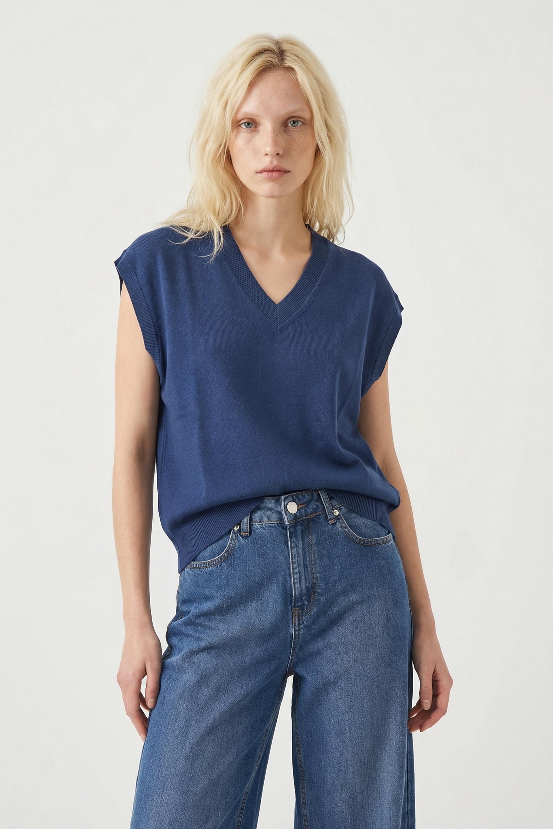| Maglia scollo V over in filato misto viscosa. Lavorazione a costine su scollo e orlo. | ||