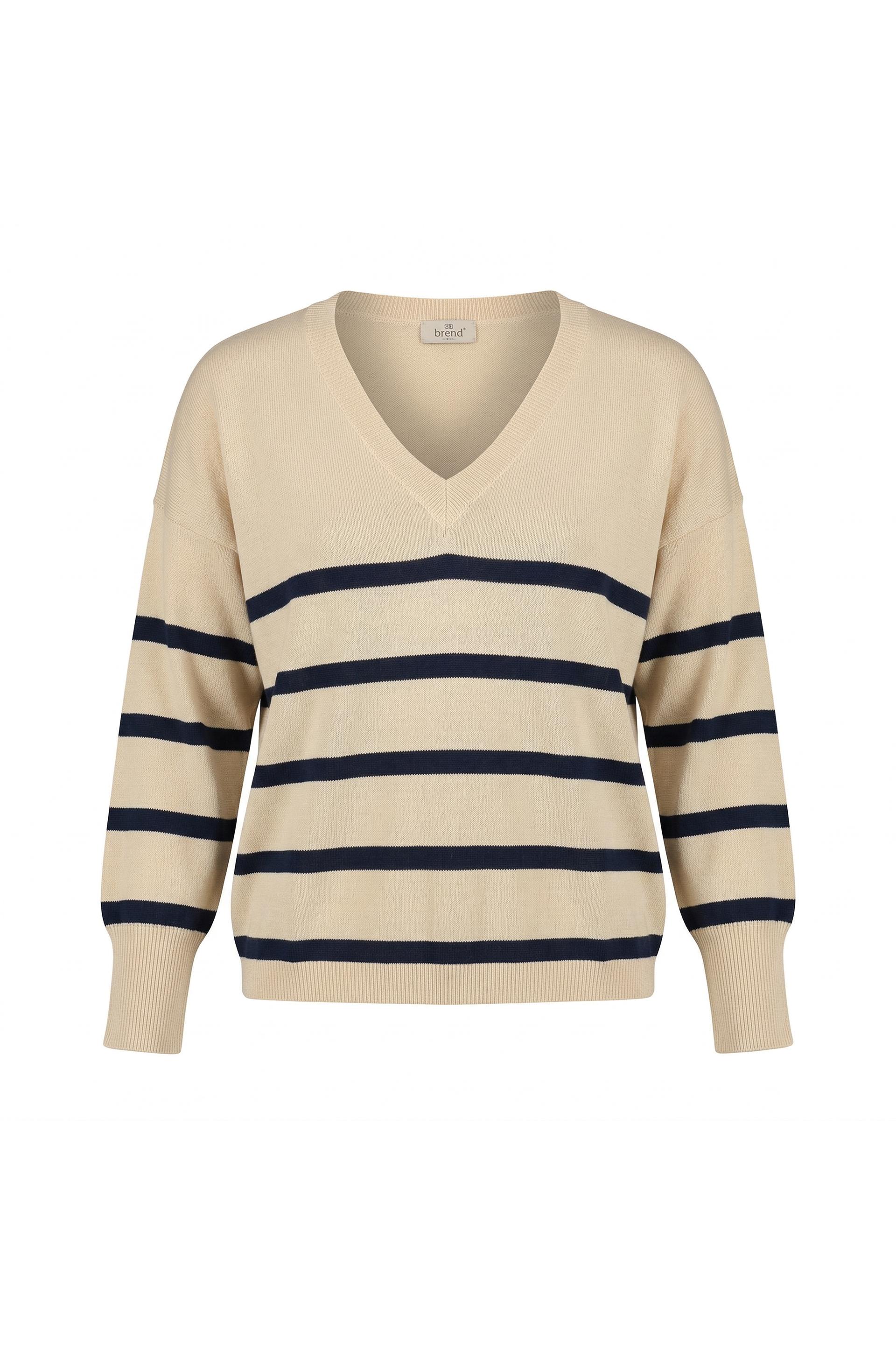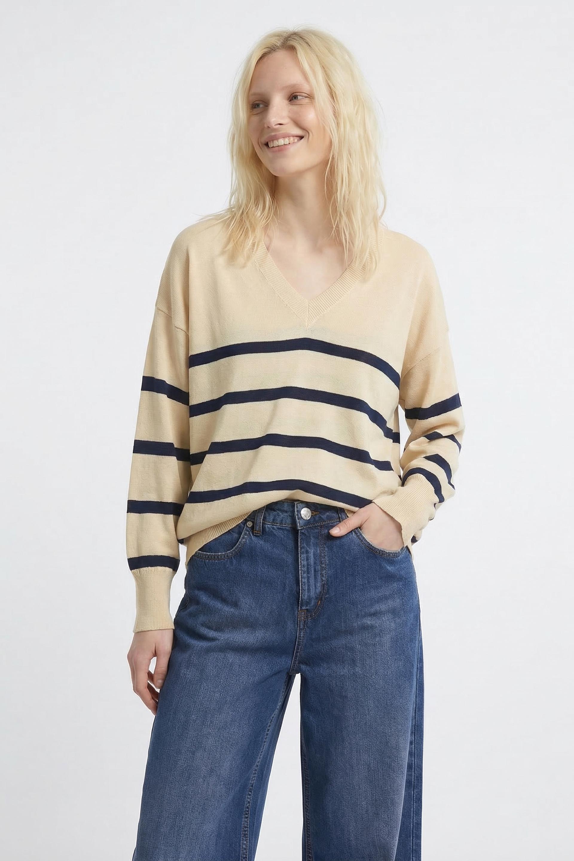 | Maglia in filato misto viscosa con scollo V. Dettaglio di righe a contrasto colore frontali. Lavorazione a costine su scollo e orlo. | ||