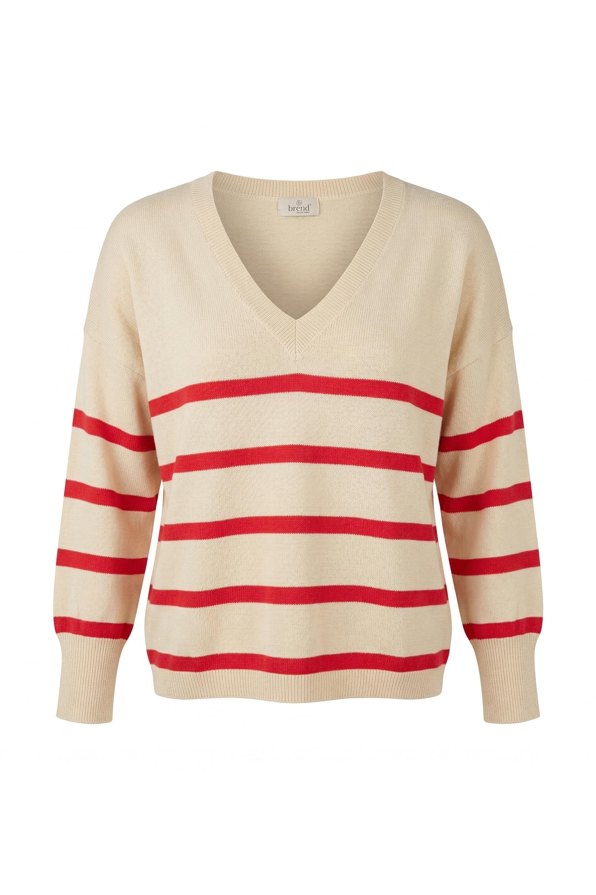 | Maglia in filato misto viscosa con scollo V. Dettaglio di righe a contrasto colore frontali. Lavorazione a costine su scollo e orlo. | ||