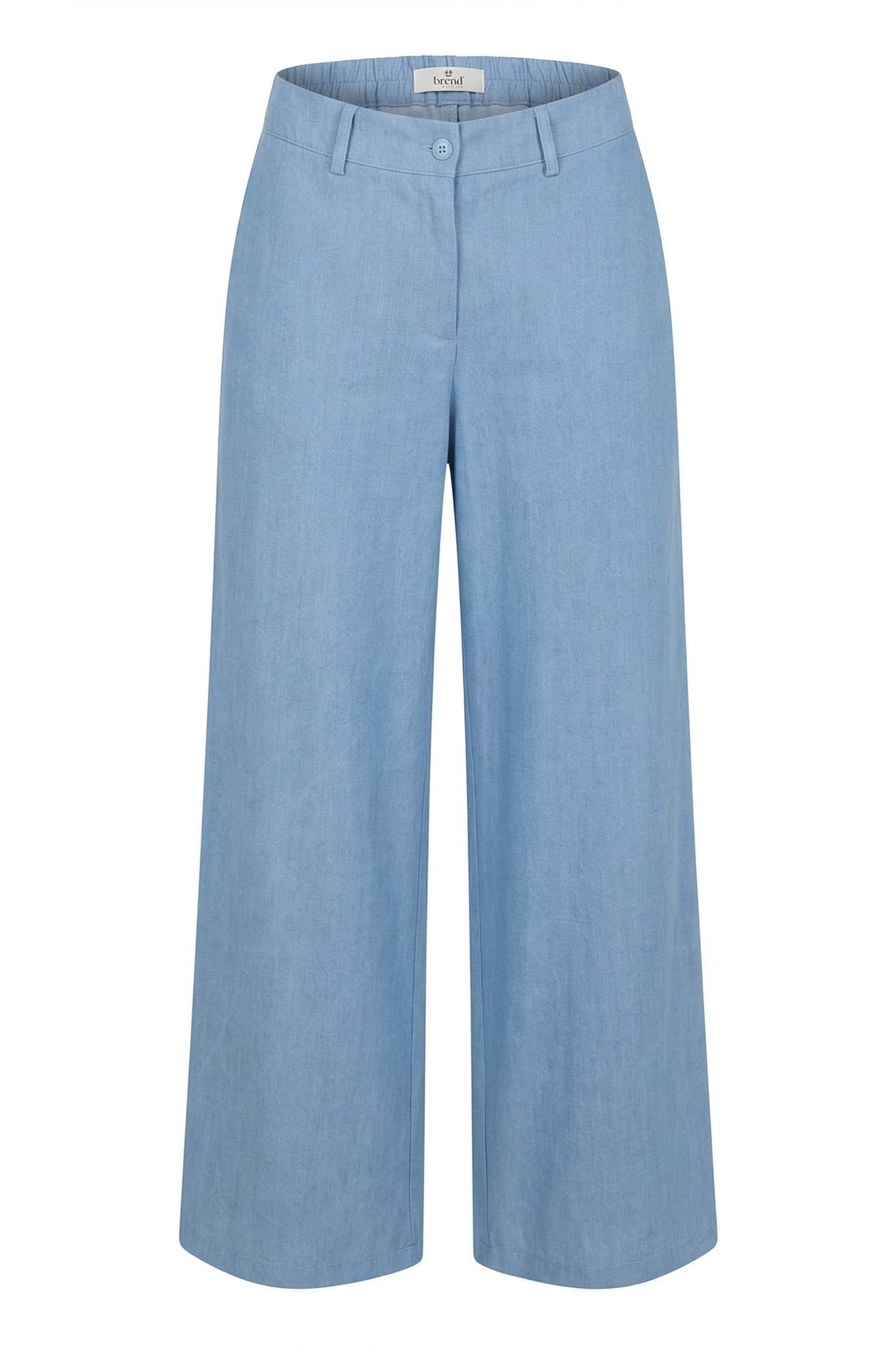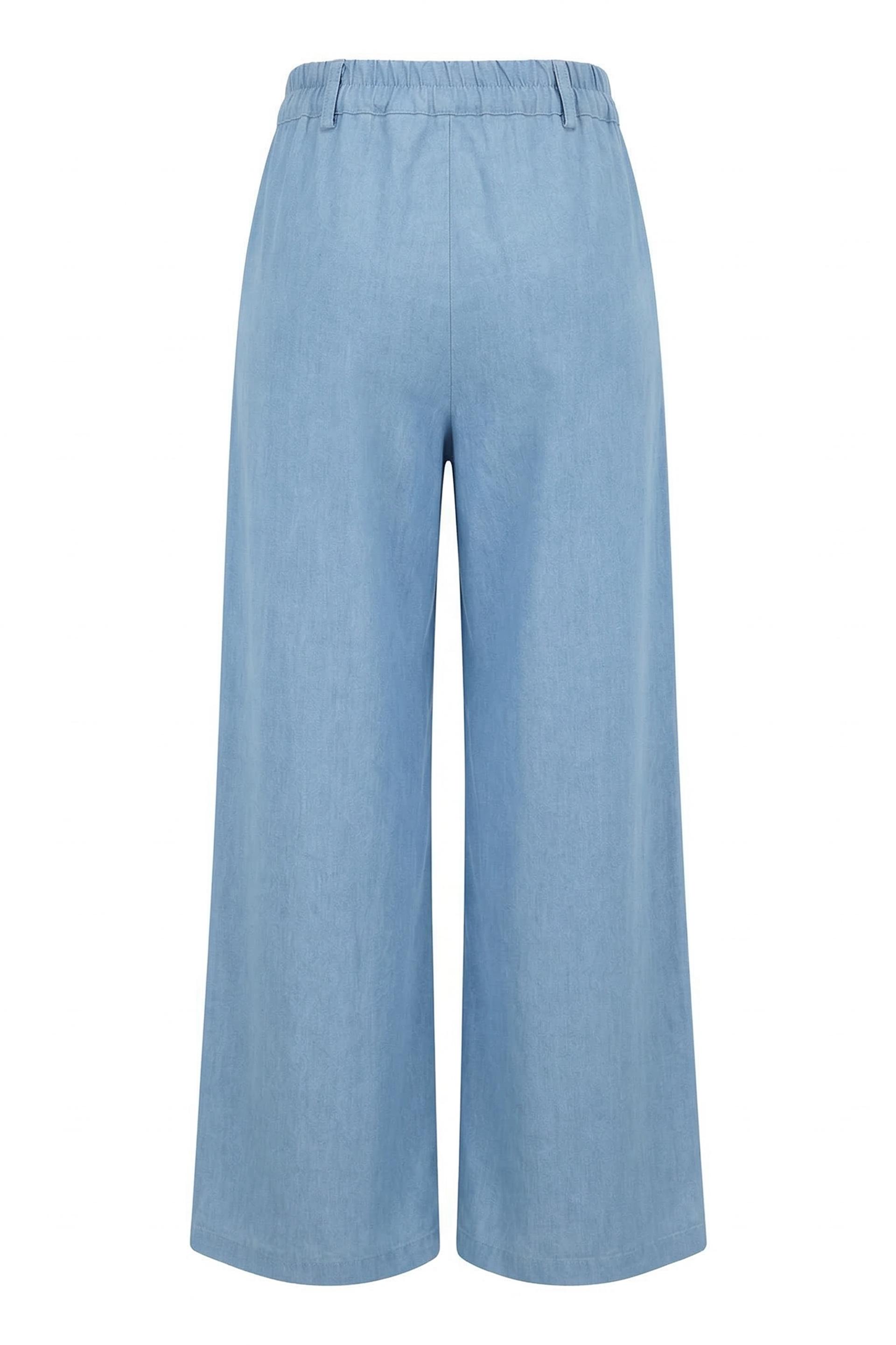 | Pantalone palazzo con elastico posteriore effetto denim. Tasche laterali e chiusura tramite bottone e cerniera. | ||