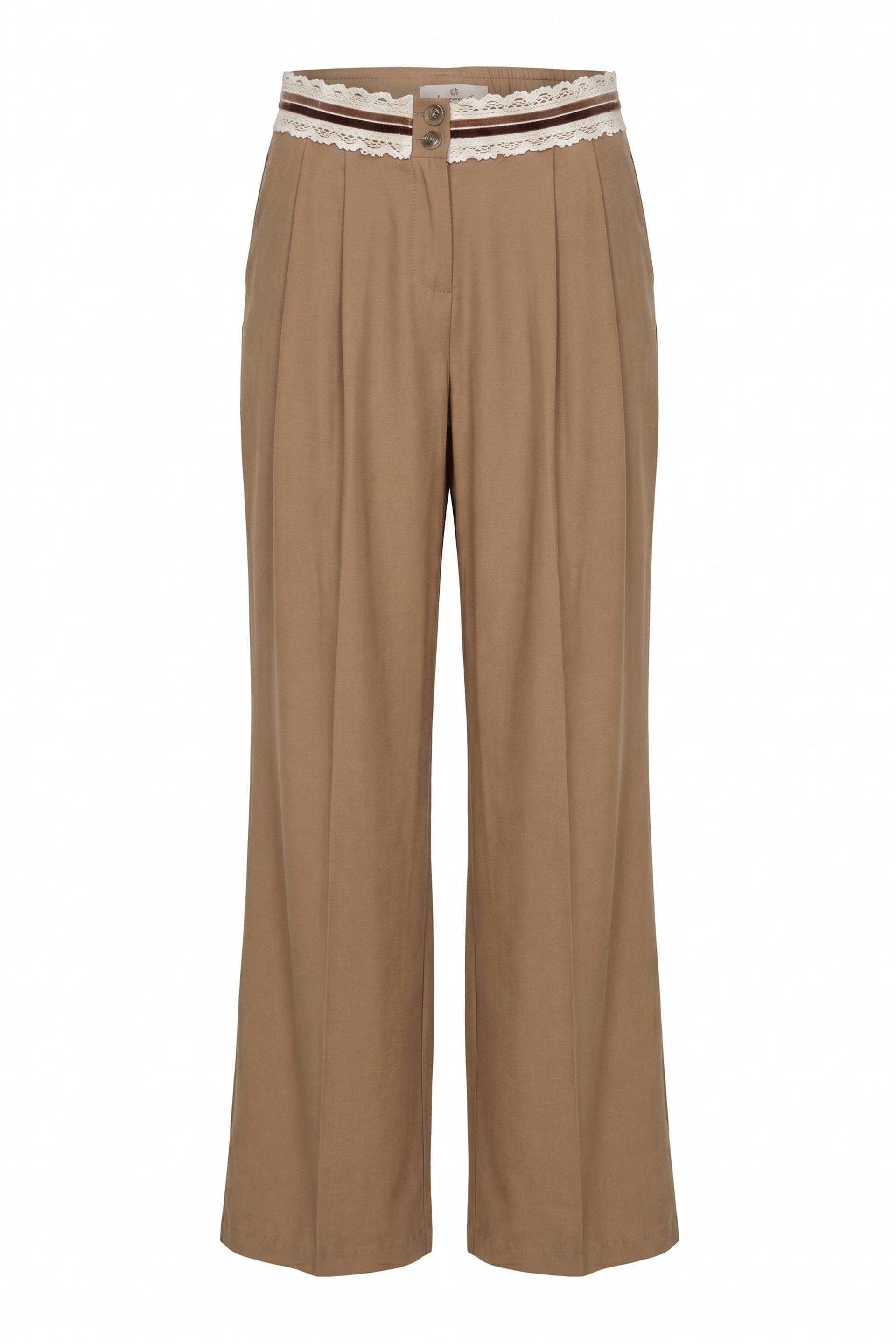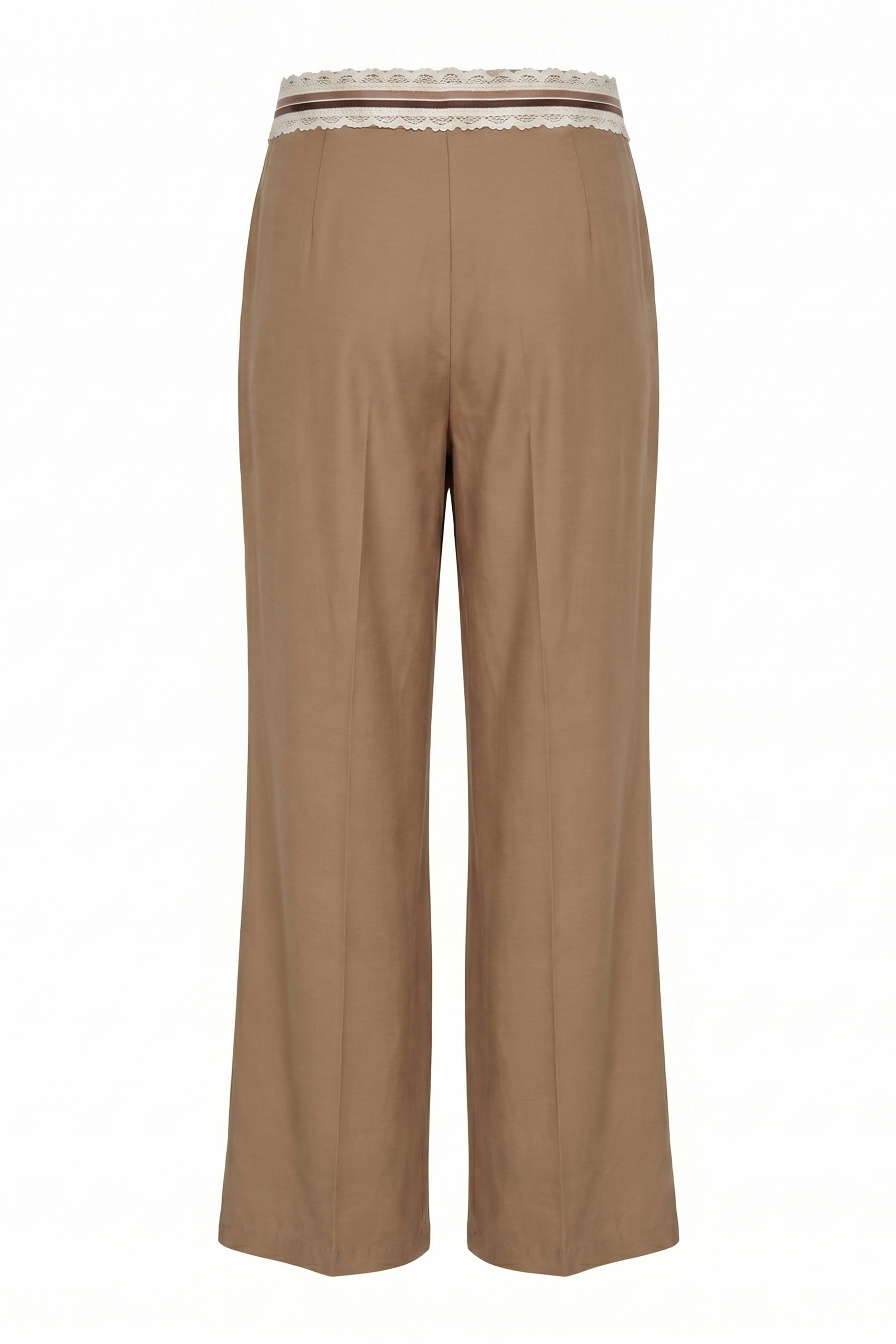 | Pantalone doppia pinces gamba dritta con tasche laterali. Dettaglio di fascia con passamaneria applicata alla vita- Chiusura tramite 2 bottoni e cerniera. | ||