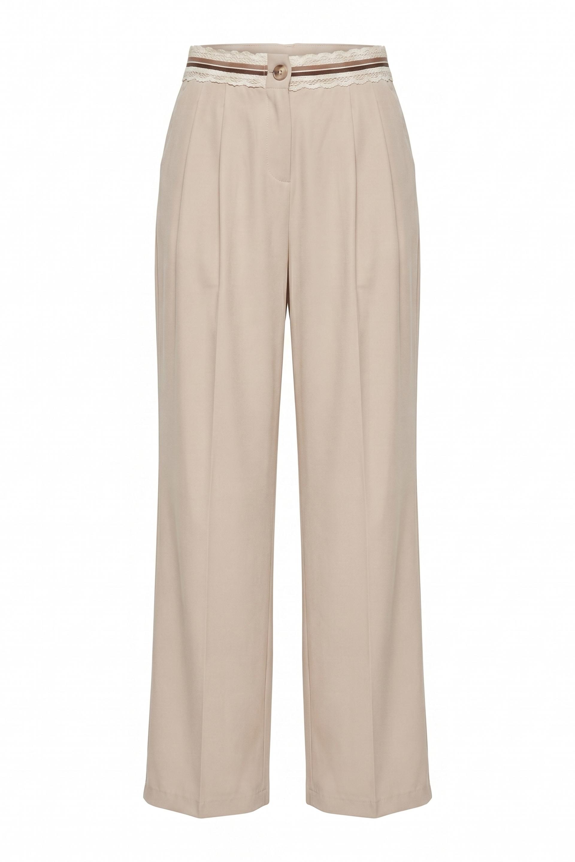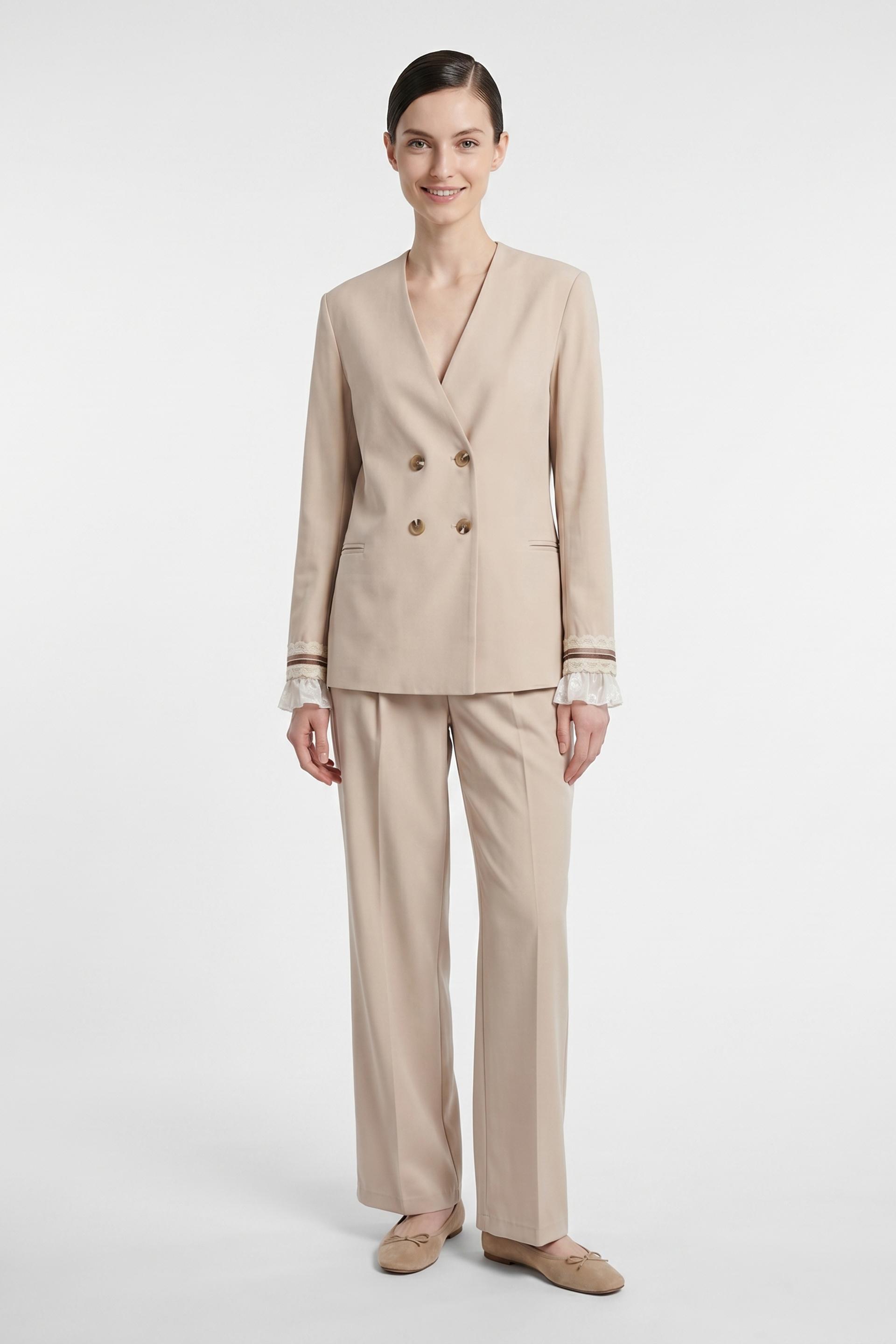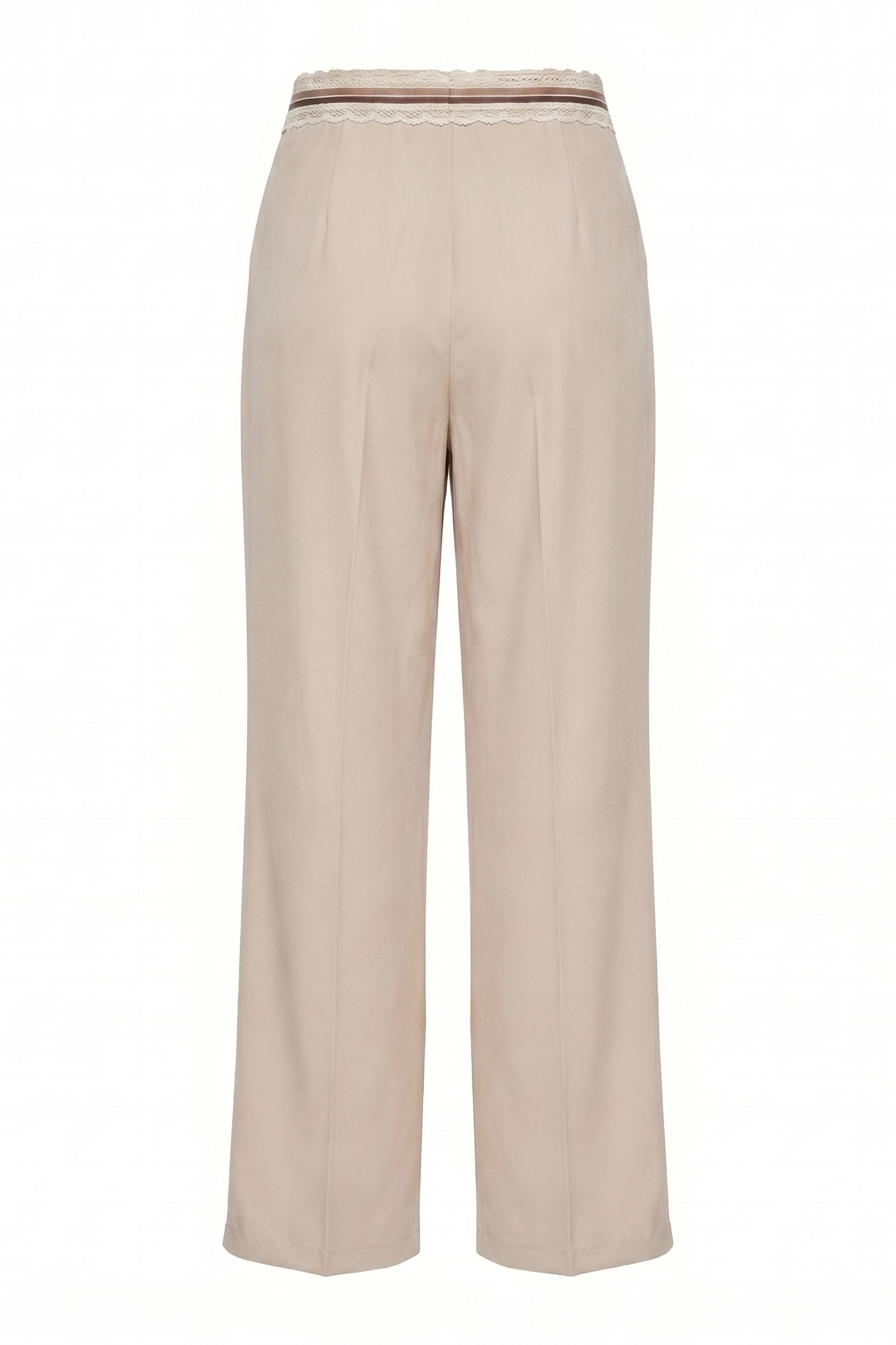 | Pantalone doppia pinces gamba dritta con tasche laterali. Dettaglio di fascia con passamaneria applicata alla vita- Chiusura tramite 2 bottoni e cerniera. | ||