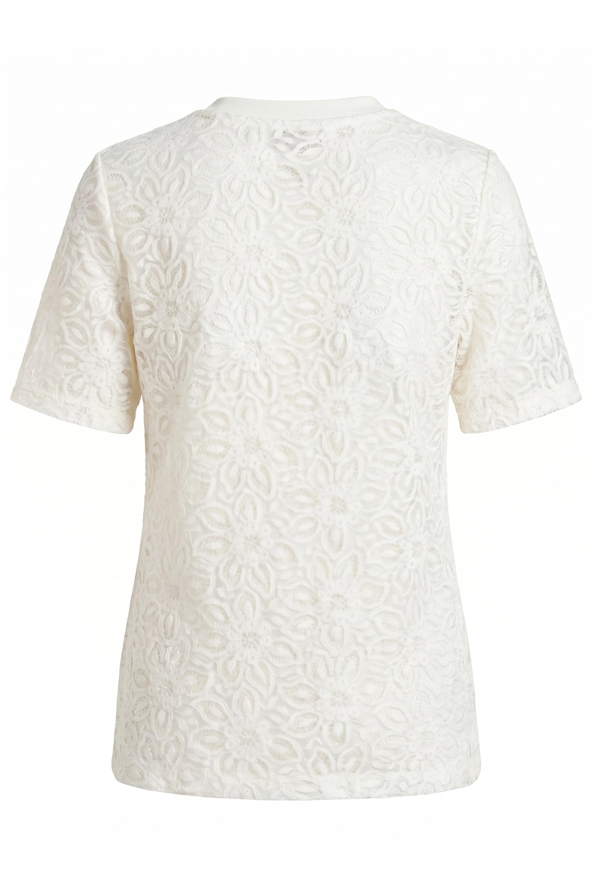 | T-shirt over girocollo pizzo. Dettaglio di lavorazione a costine su scollo. | ||