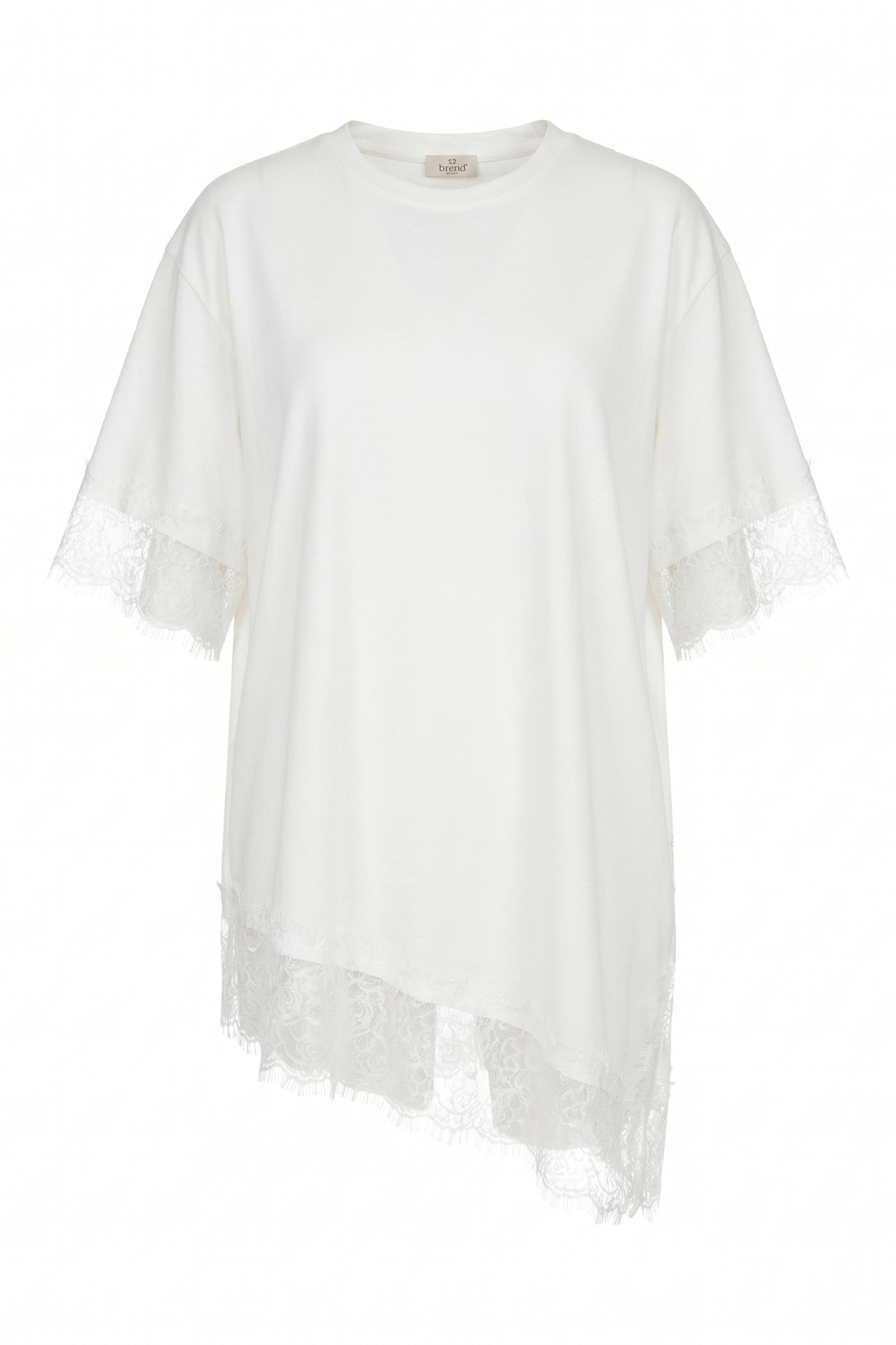 | T-shirt asimmetrica in cotone con orlo asimmetrico e spacco laterale. Dettaglio di fascia in pizzo in orlo e fine manica. | ||
